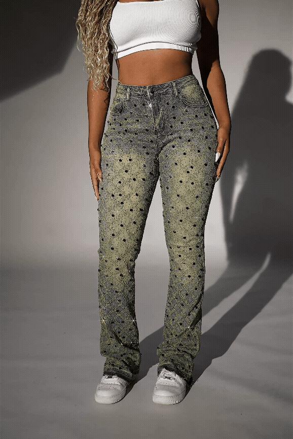 An urban stacked flare denim jean for women in tinted dark wash. Designed with custom rhinestone detailing and extra long legs for a must-cop streetwear staple piece. Zip fly with button closure 5-pocket build High-waisted silhouette Fitted through the hip Custom rhinestone designing Flare leg openings Stacked construction 36" inseam *NOTE: These jeans are purposefully designed with extra long legs so the fabric properly bunches at the hem, creating the stacked flare style.