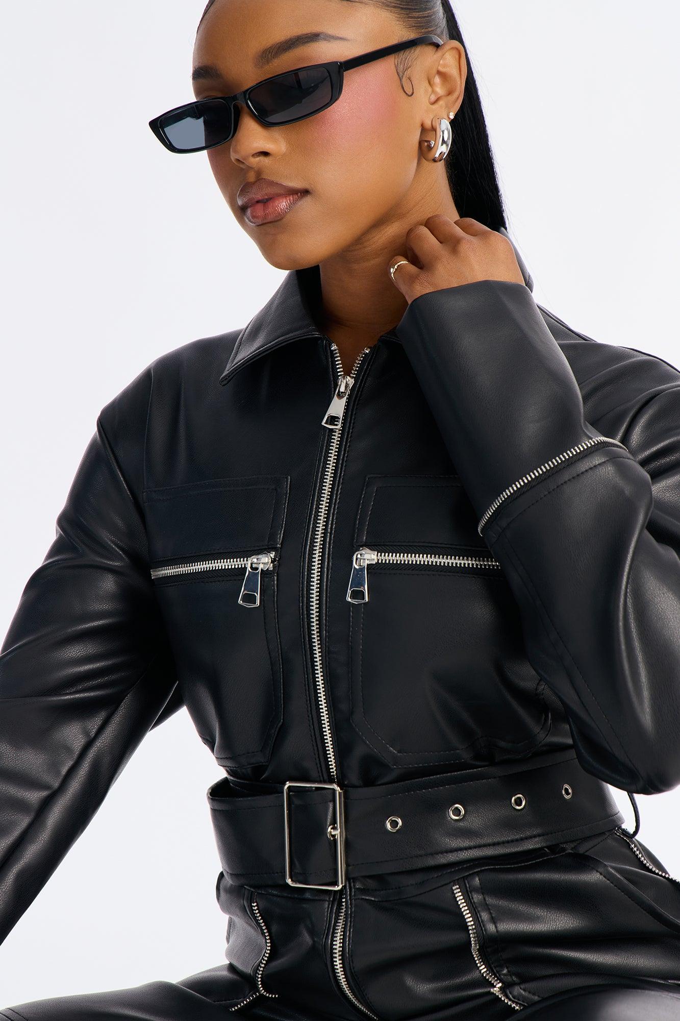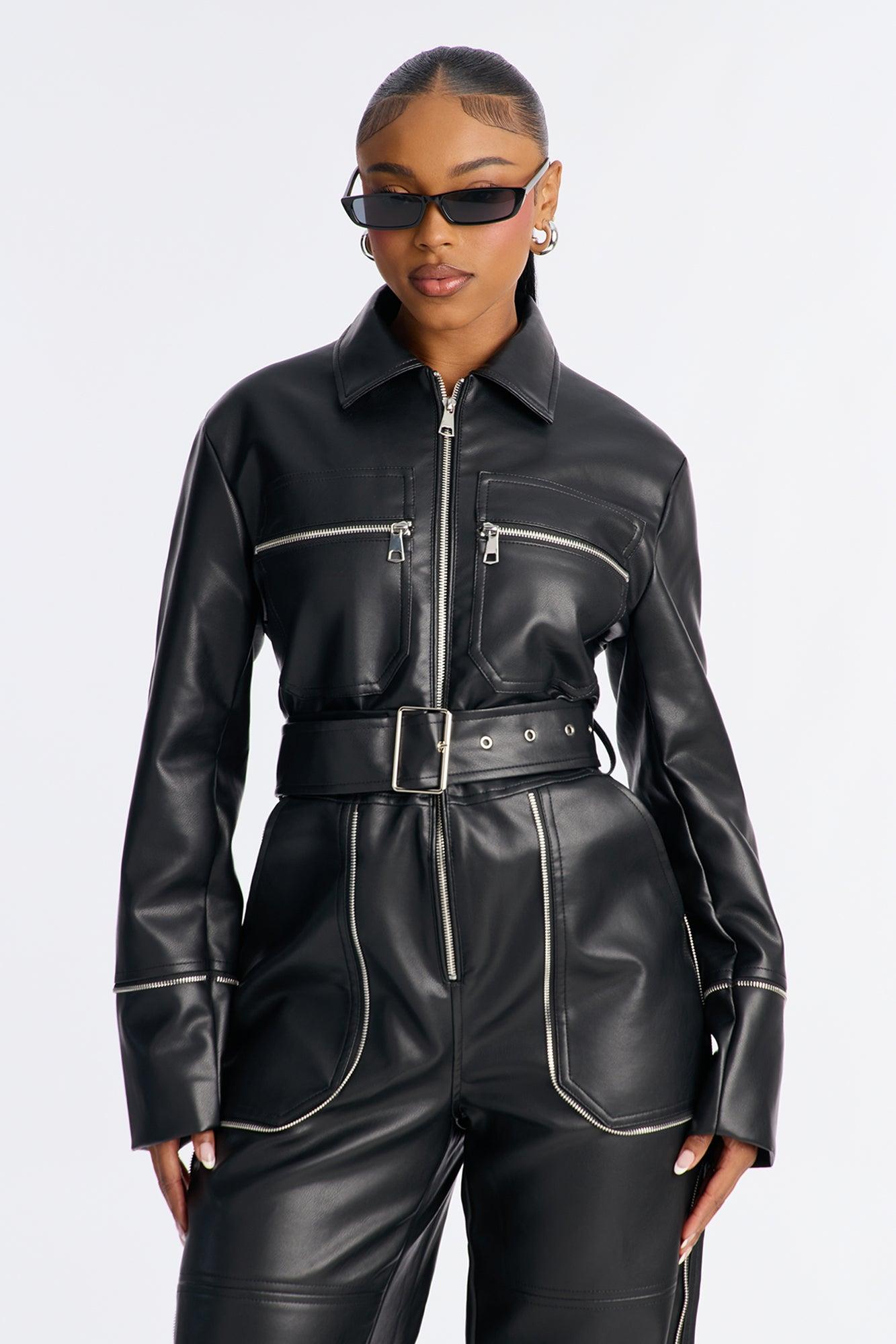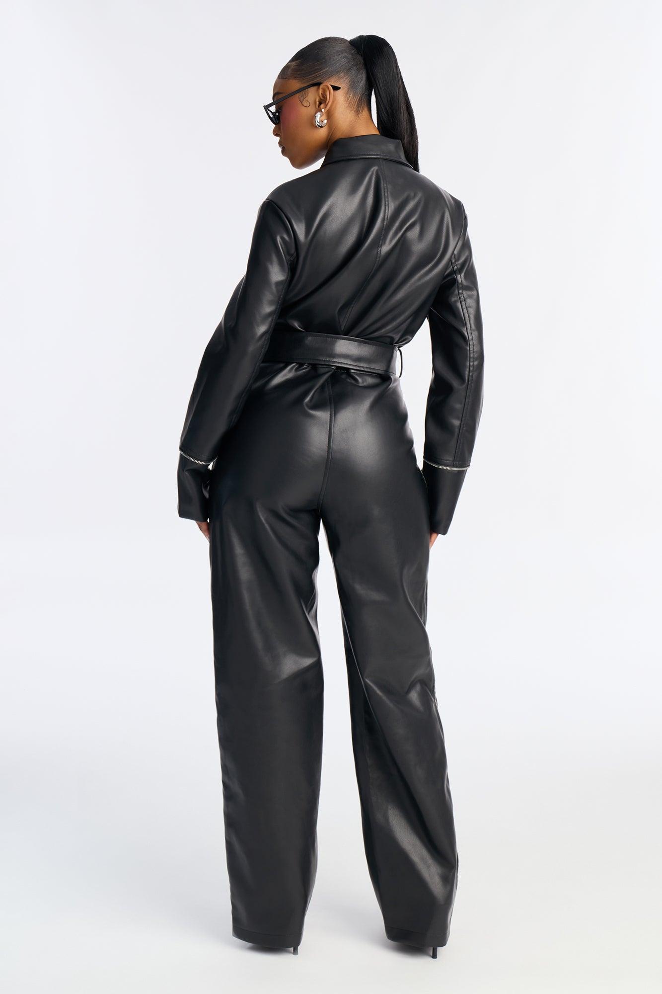 Sasha Belted Cargo Faux Leather Straight Leg Jumpsuit - Black Female