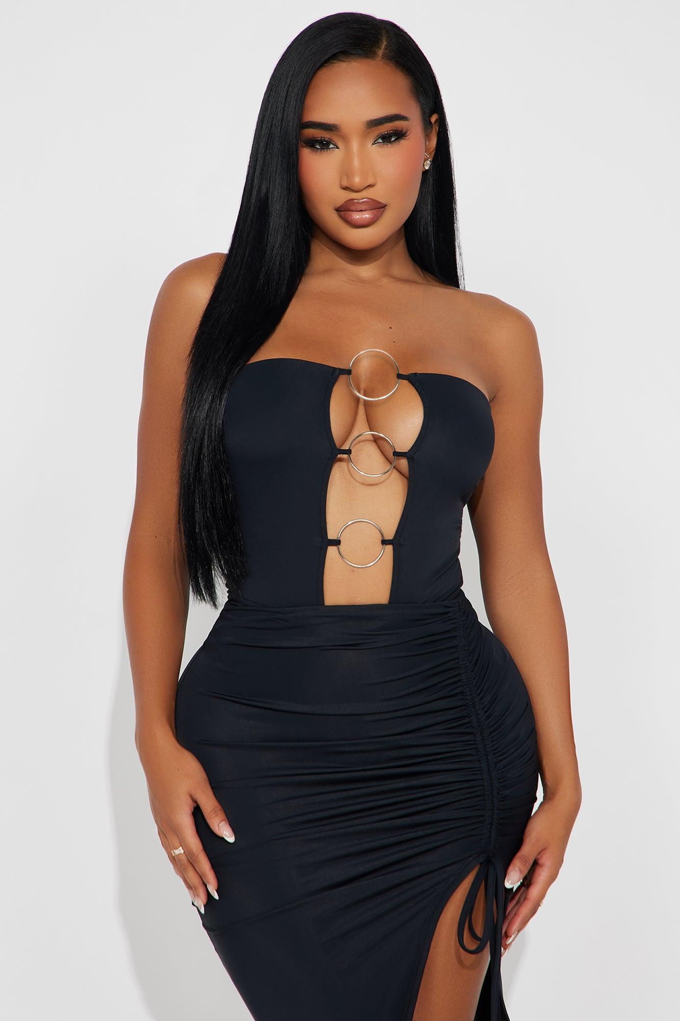Available In Black And Red. 2 Piece Ensemble Bodysuit And Skirt Set Snap Button Closure Stretch Hardware Detail Slit Midi Skirt Final sale Top Self: 82% Nylon 18% Spandex Lining: 95% Polyester 5% Spandex Bottom Self: 82% Nylon 18% Spandex Imported California Proposition 65WARNING: Cancer and Reproductive Harm - www.P65Warnings.ca.gov.