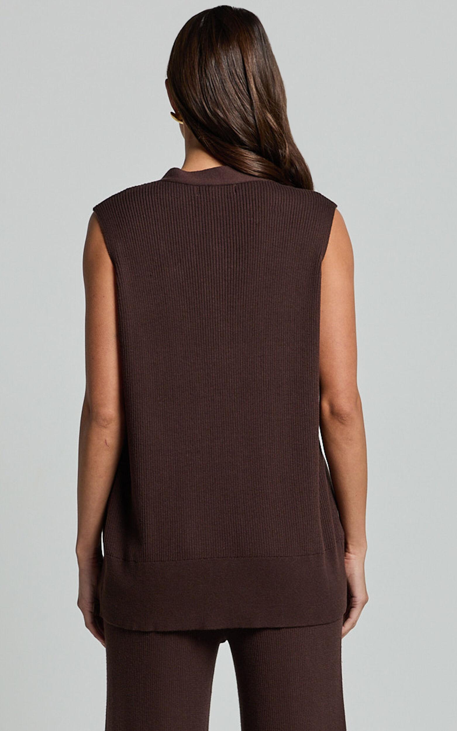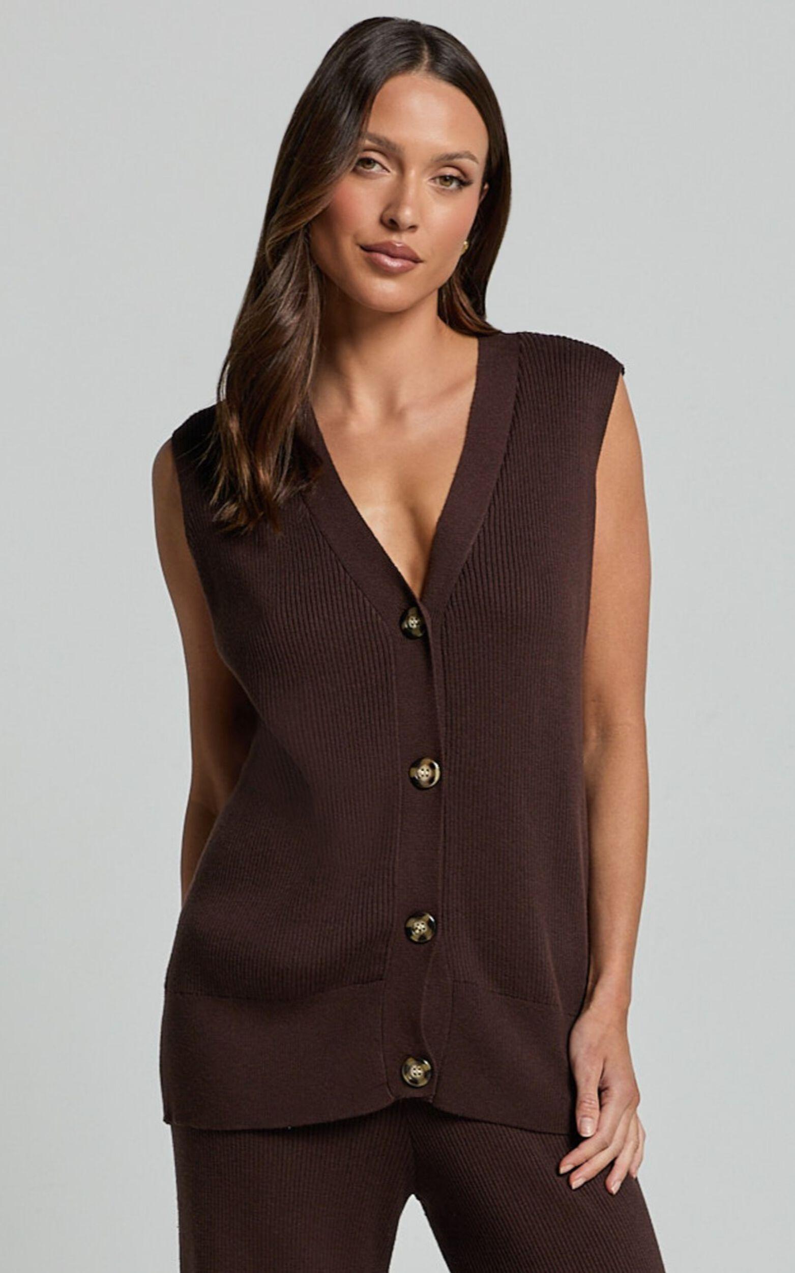 Step into style with our Sasha Top, the ultimate staple for any fashion-forward wardrobe. This chic knitted button-through V-neck sleeveless top, in a sumptuous chocolate brown, offers versatility and style that caters to all your fashion needs. Designed with the modern woman in mind, our Sasha Top transcends the ordinary, allowing you to express your unique style with confidence and ease.Product Details:Buttons detailPull on styleKnit TopFully Fashioned KnitV NeckCasual wearStandard lengthShort SleeveAcrylic materialSize and FitSize S / 8 length: 64cm / 25.2inMaterial and Care55% Acrylic, 45% CottonNo Stretch