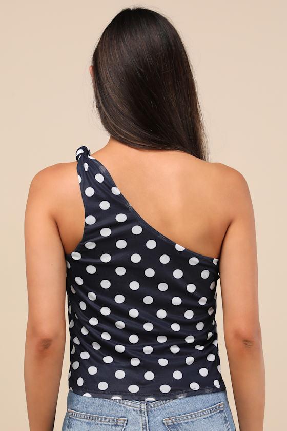 Solve all your OOTD problems with this effortlessly chic top that boasts a classic polka dot print across stretchy mesh knit. A slender strap supports the knotted, one-shoulder neckline that tops a figure-fitting bodice with a slightly cropped hem.