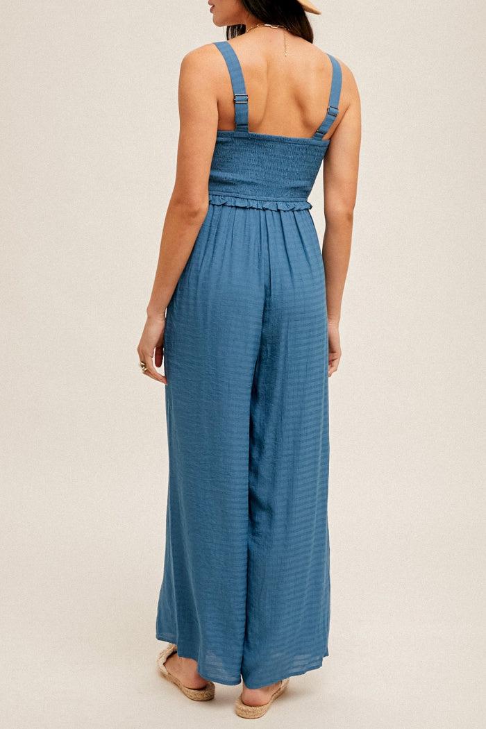 Smocked jumpsuit with ruffle waist detail and adjustable straps. Partially lined. Model is wearing a size Small.