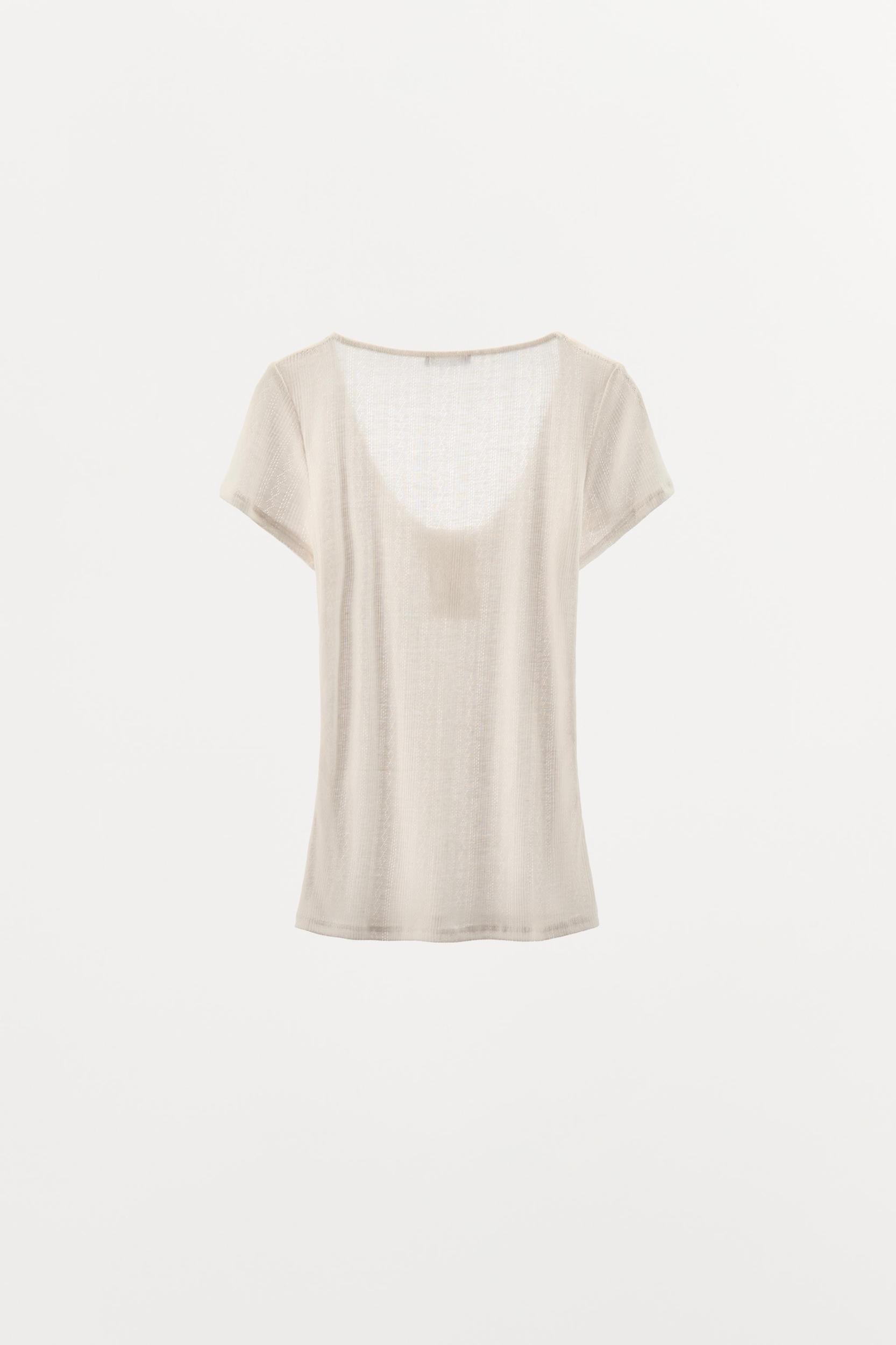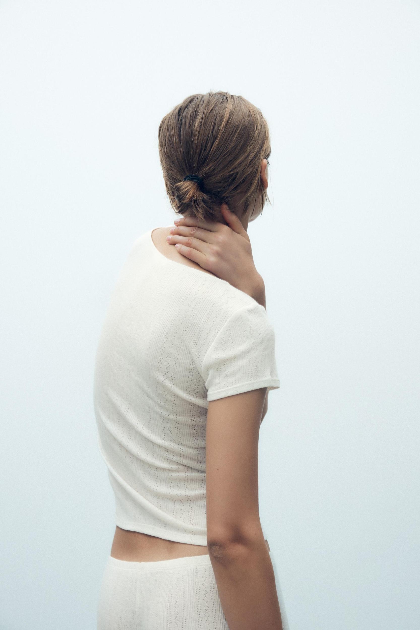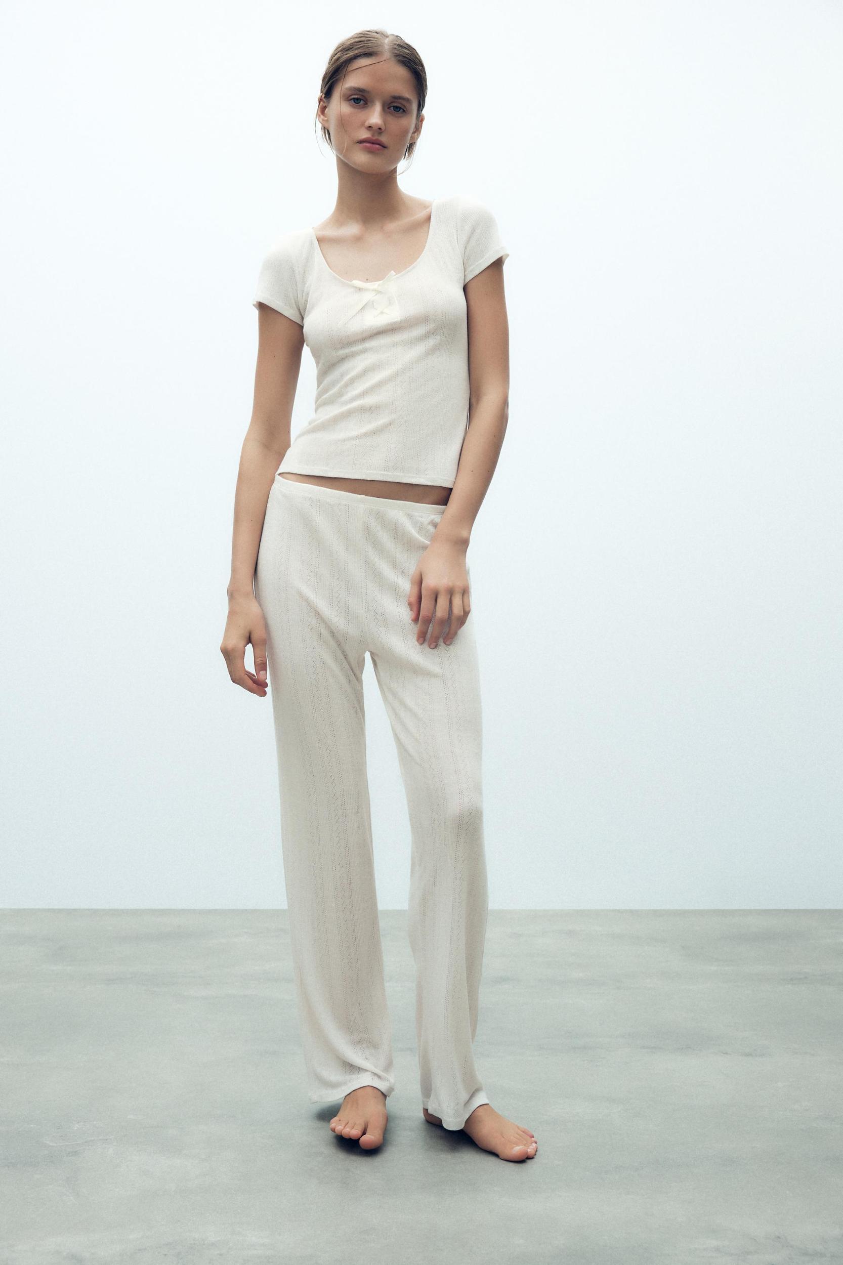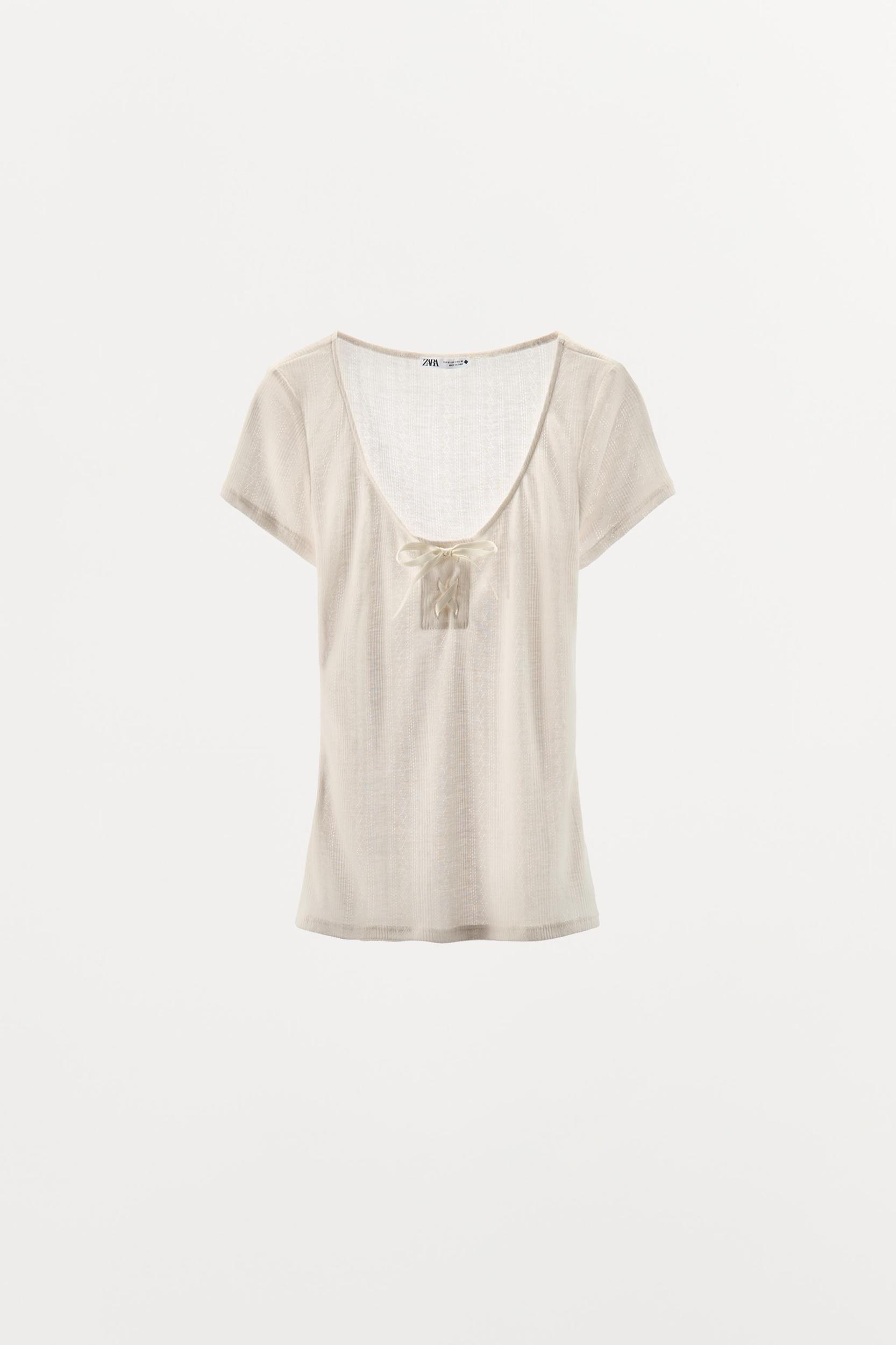 Viscose knit top. Round neck and short sleeves. Satin bow appliqué detail on the chest.