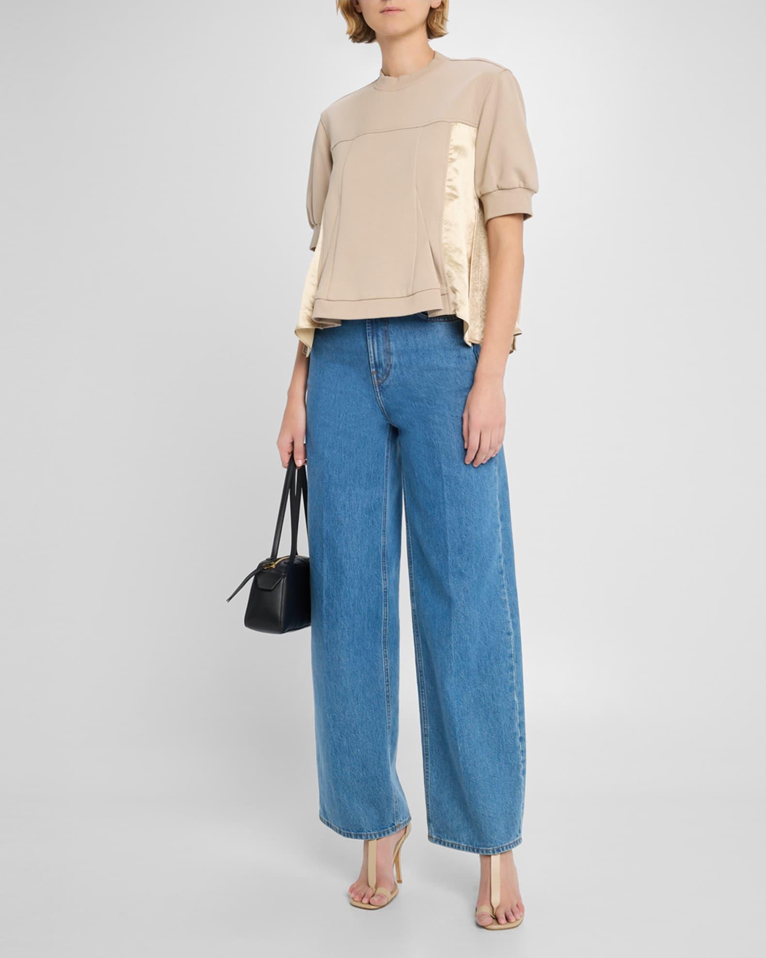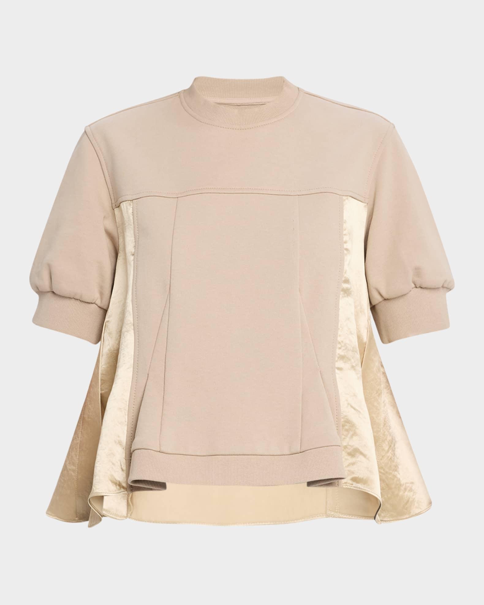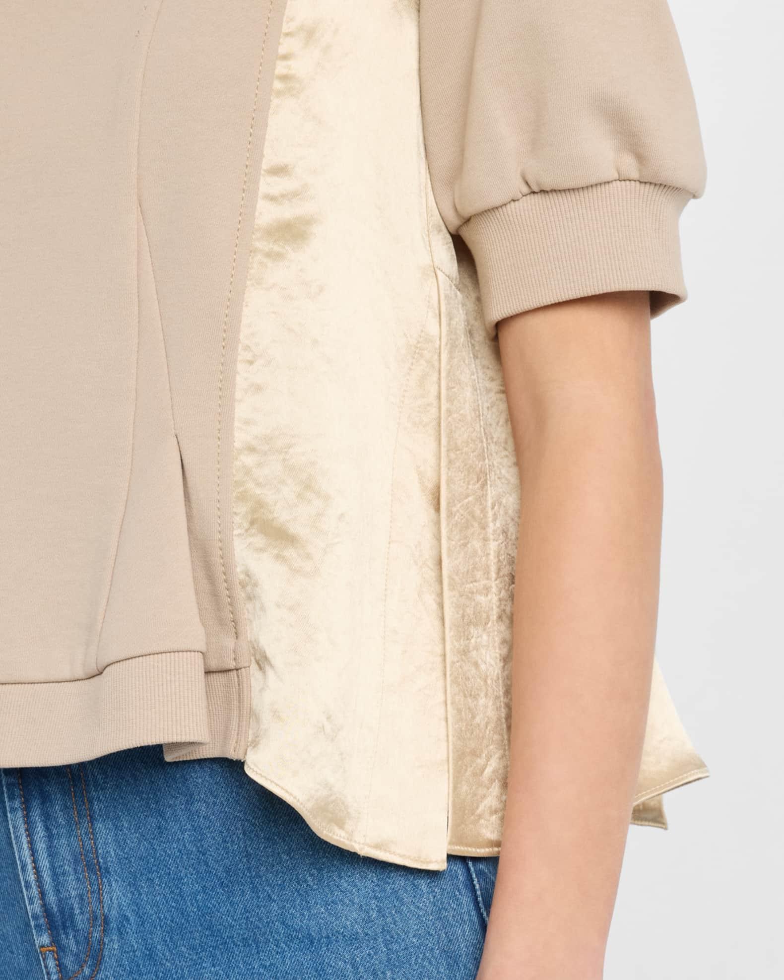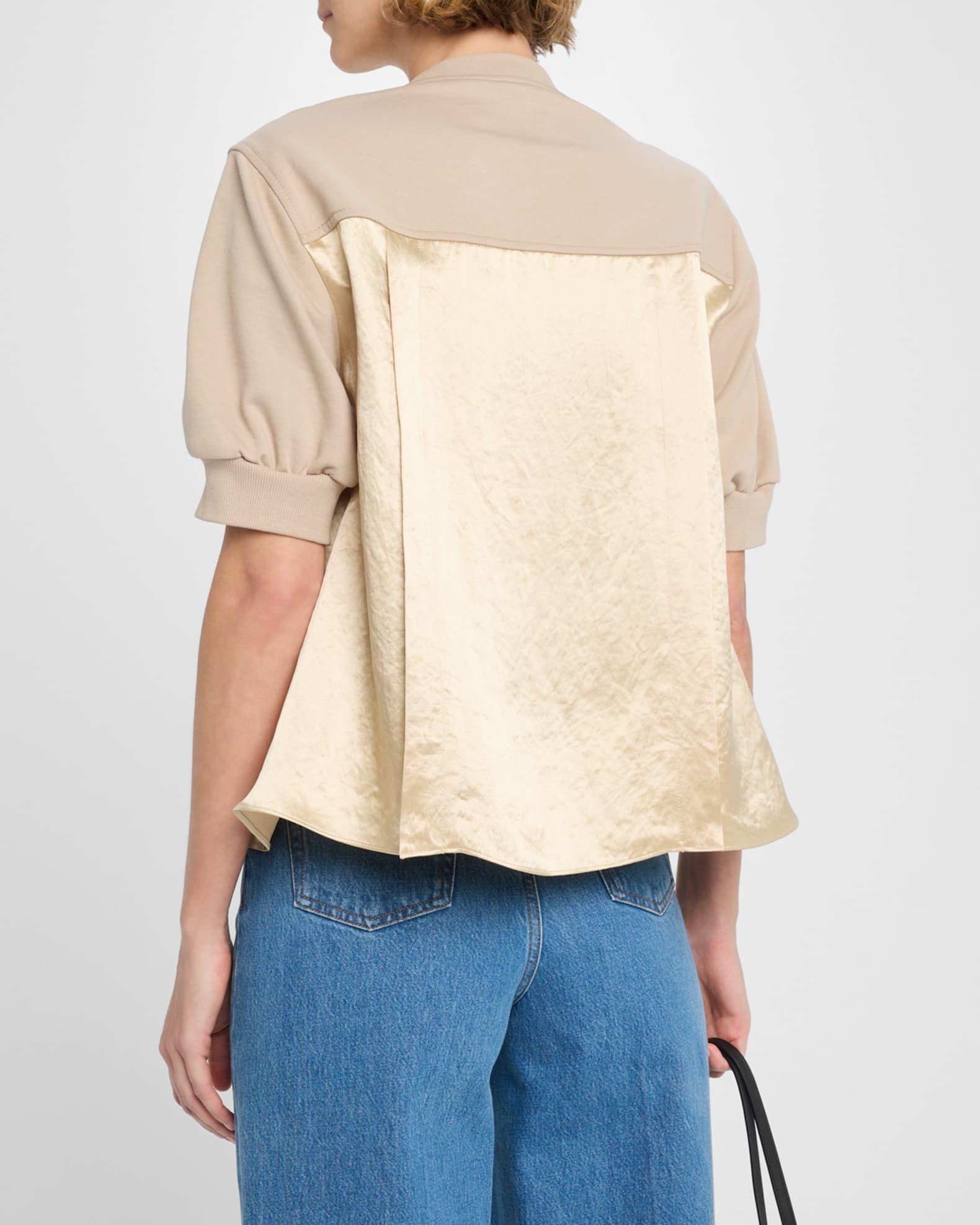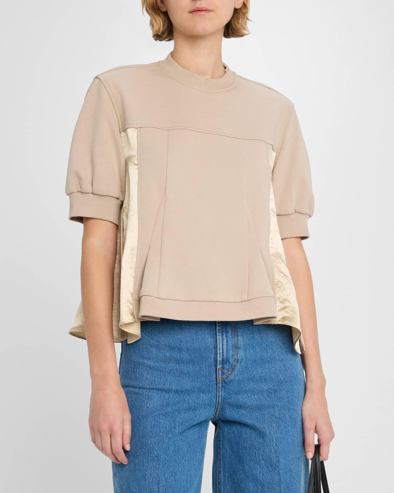 3.1 Phillip Lim knit flounce top with satin paneling High neckline Short puff sleeves Loose fit Hem falls to the hip Pullover style Cotton Imported