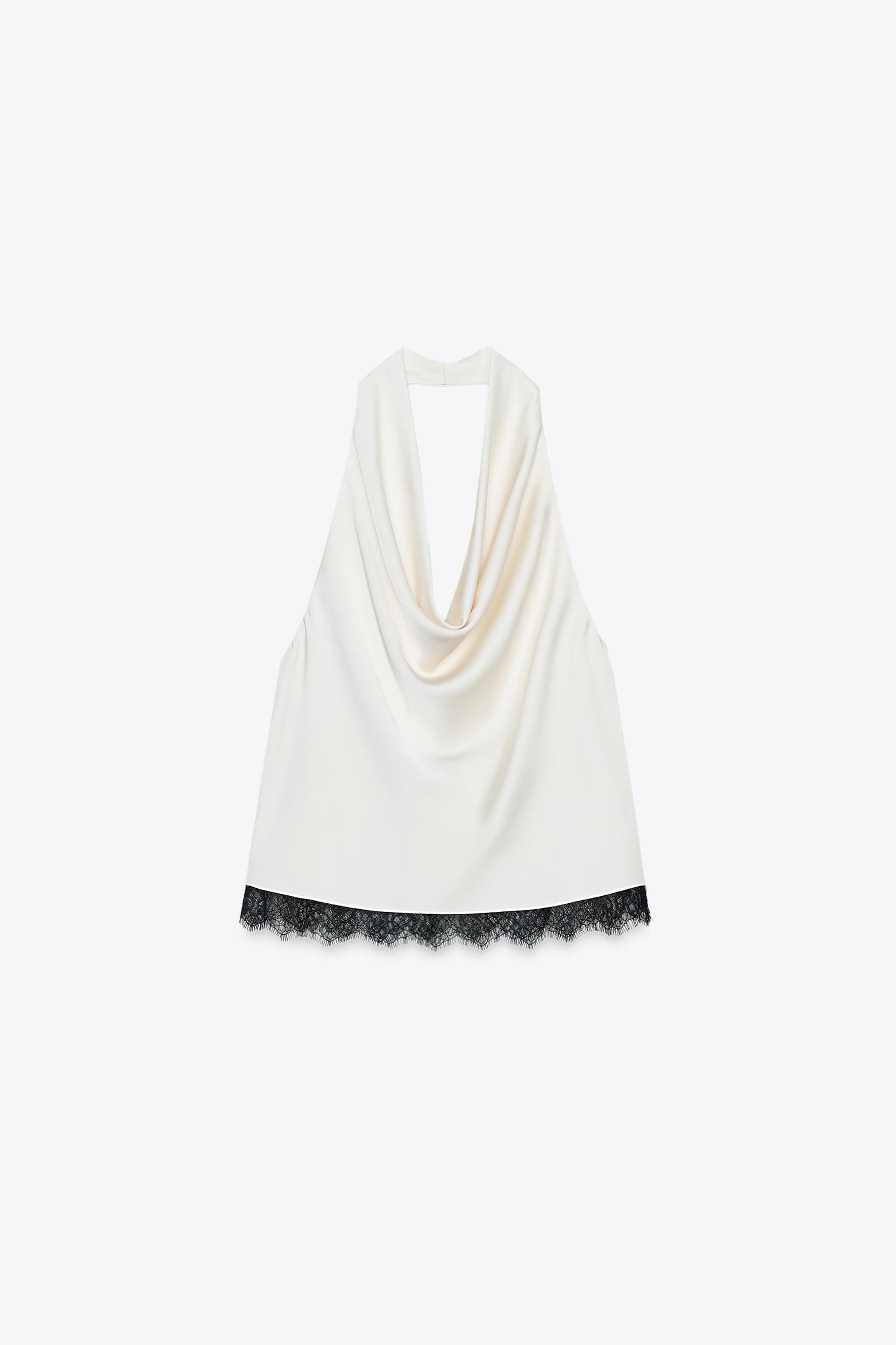 Halter neck top with a bare back. Hem finished with contrasting lace.
