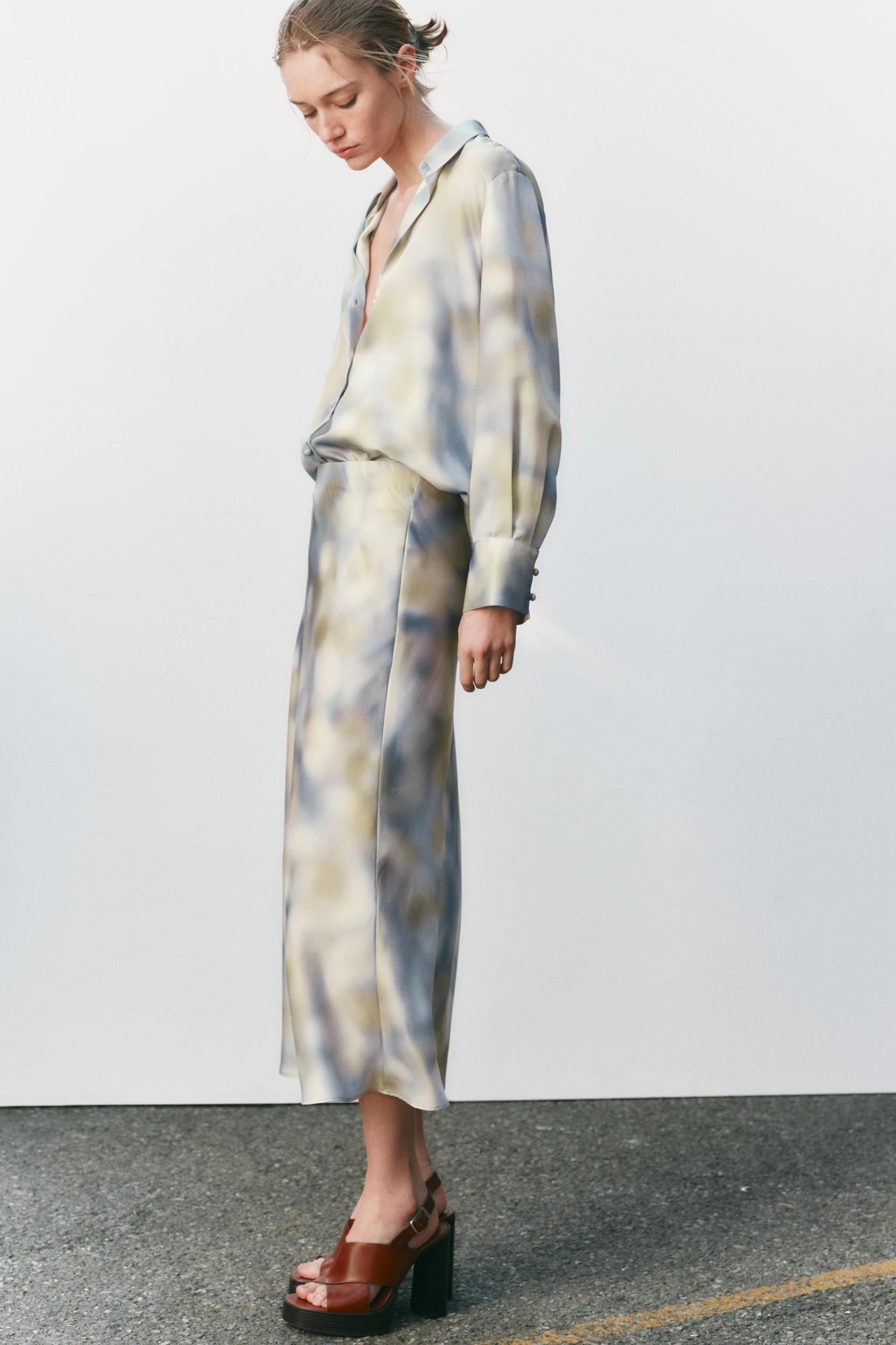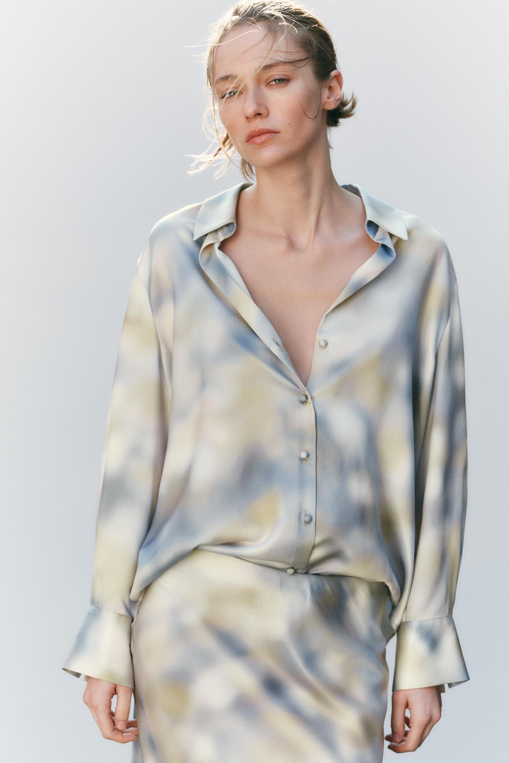 Flowy shirt with lapel collar and V-neckline, long sleeves. Tone-on-tone covered button front closure.