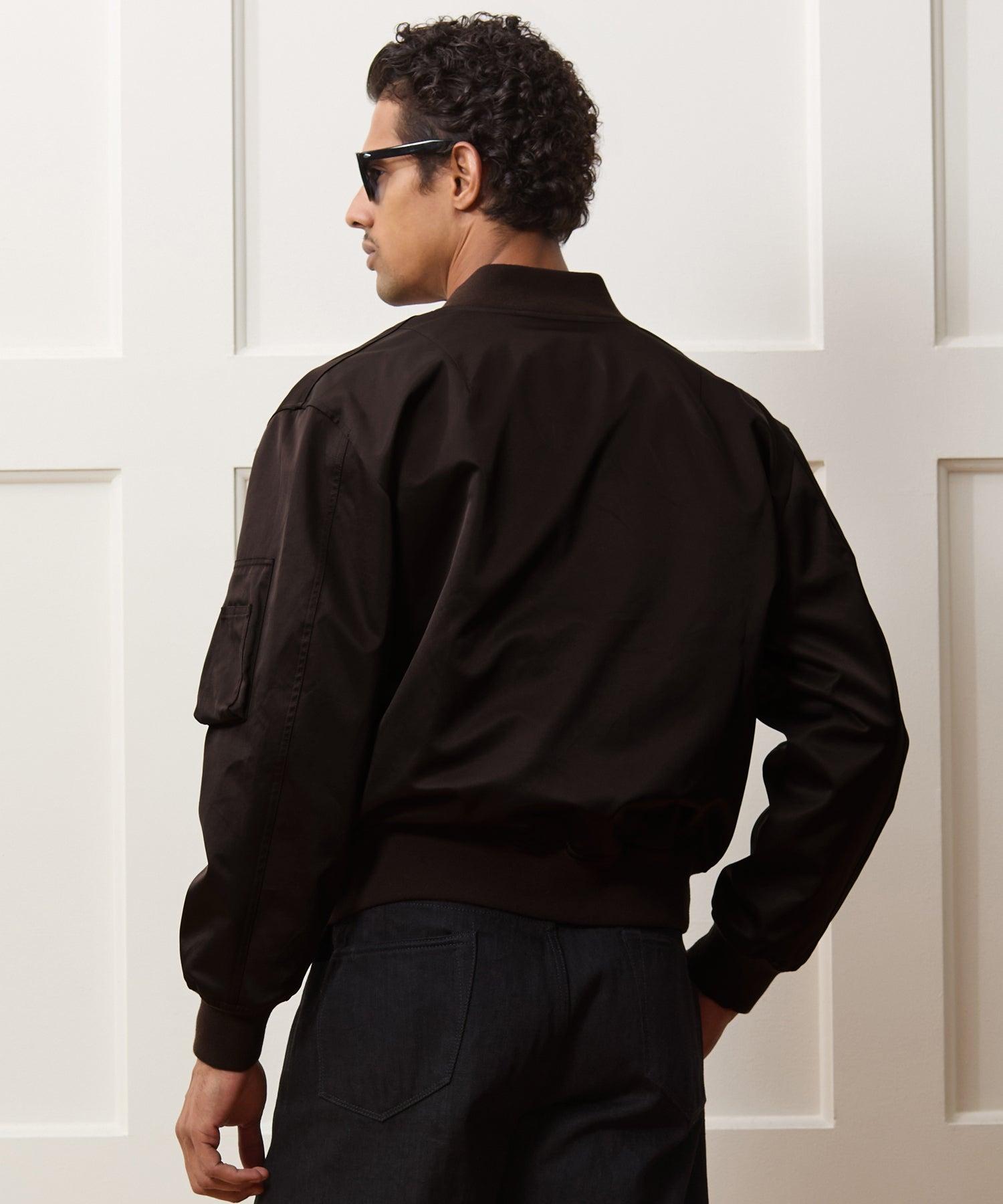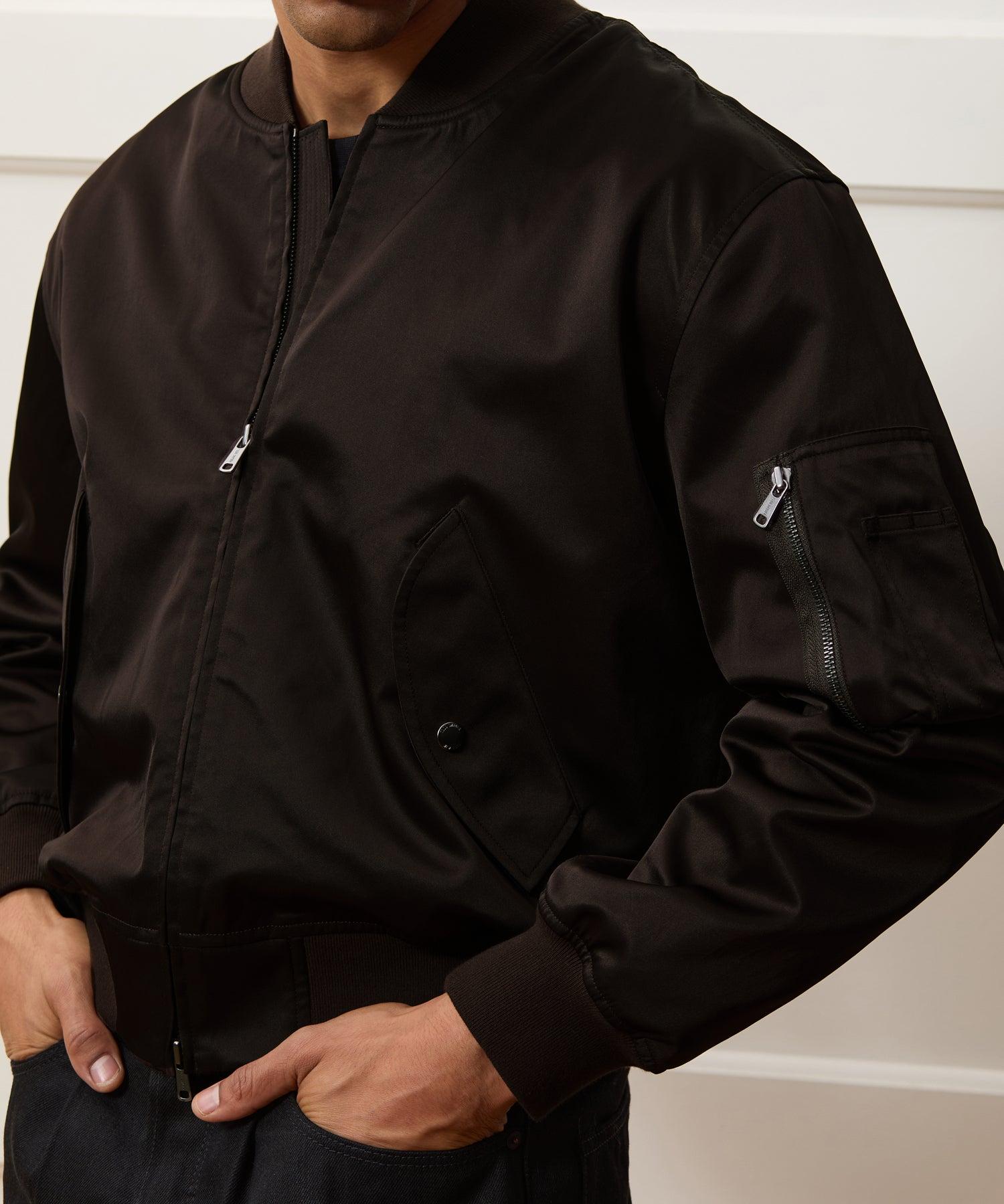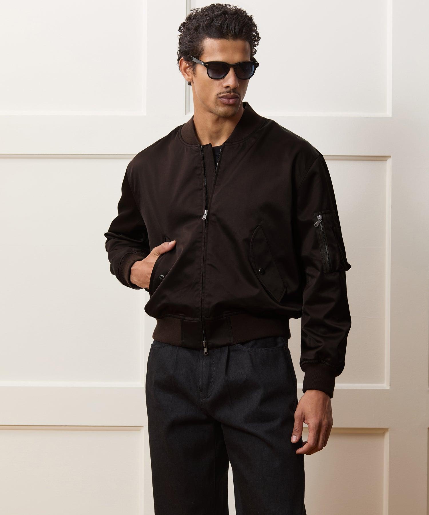 Our design team has taken a classic silhouette and upgraded it in satin with a luxurious sheen. This military-inspired jacket was first developed to keep pilots warm in the uninsulated cockpits of early fighter planes; our take is fully lined in smooth, breathable cotton Bemberg fabric. There’s knit ribbing at all the trim, along with a two-way zipper at the front for maximum flexibility and easy layering. This is one of the most versatile layering pieces a man can own, and adds a devil-may-care sophistication to off-duty looks — or, on the flipside, it can grant rugged charm to tailored dress trousers. 86% Acetate, 14% Polyester Classic Fit Model is 6'2" and is wearing a size Medium Fully Lined 2-Way Zipper Snap-and-Flap Hand Pockets Two Interior Pockets Knit Ribbed Trim Imported Style OU05410670