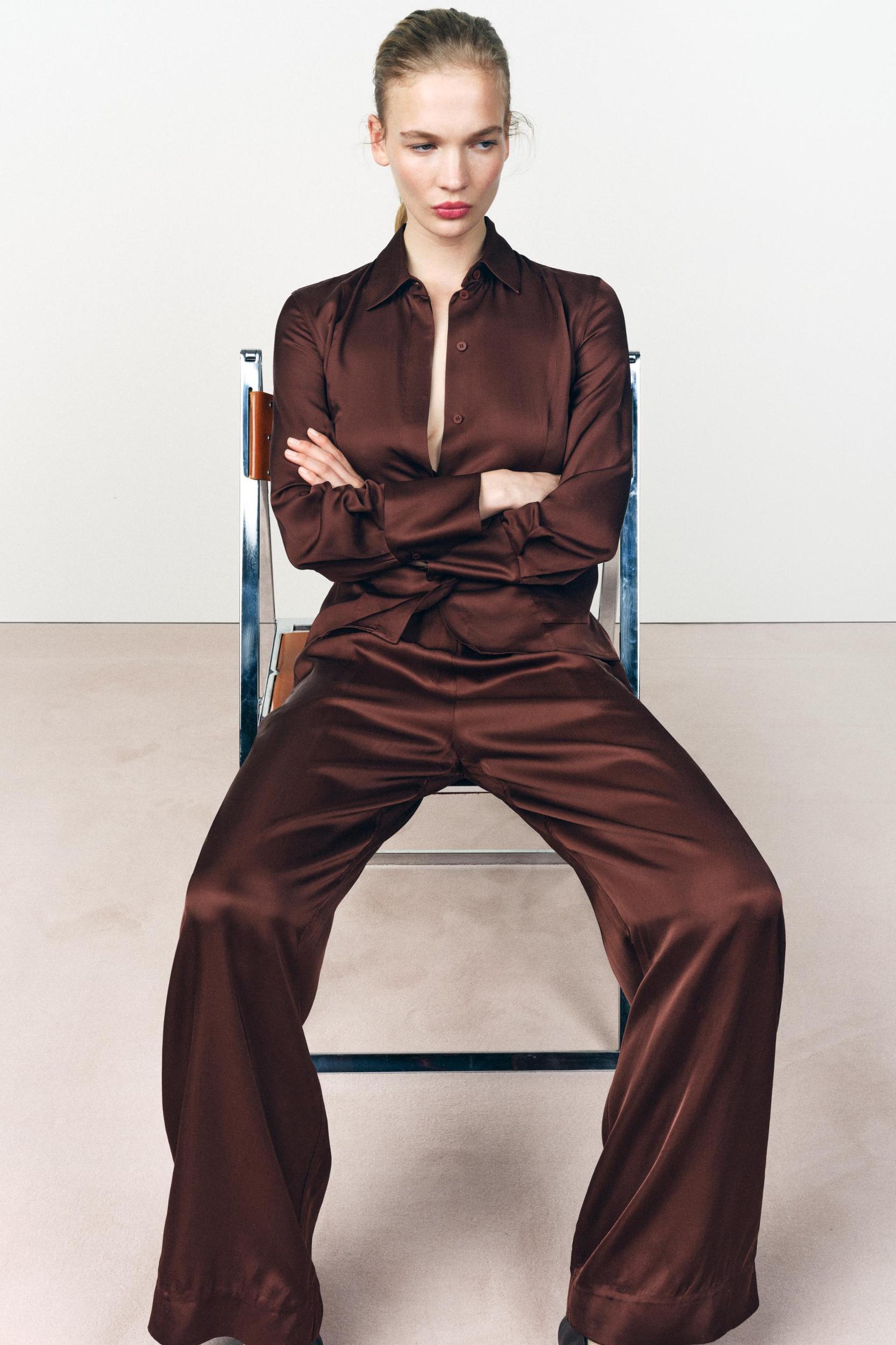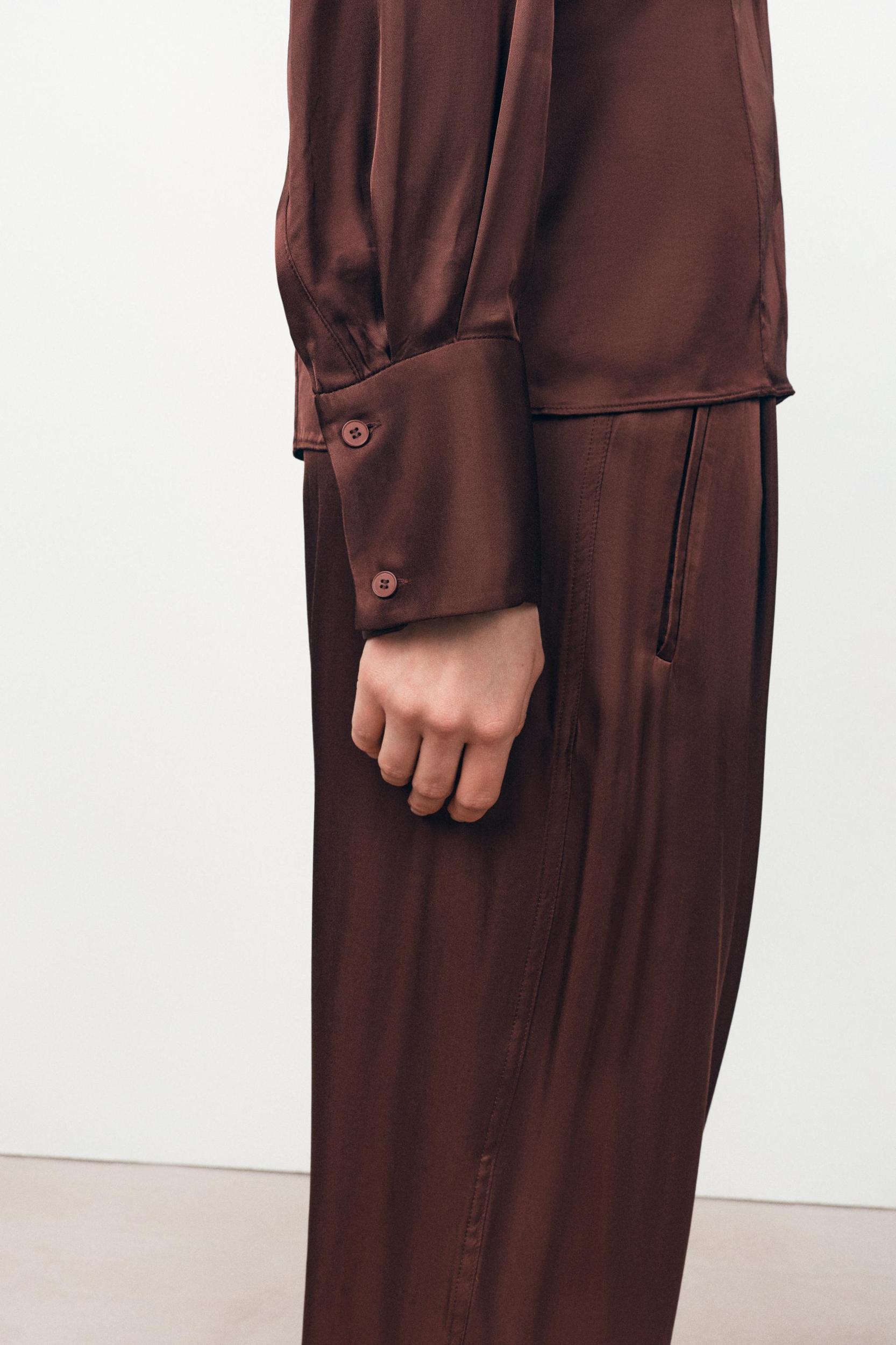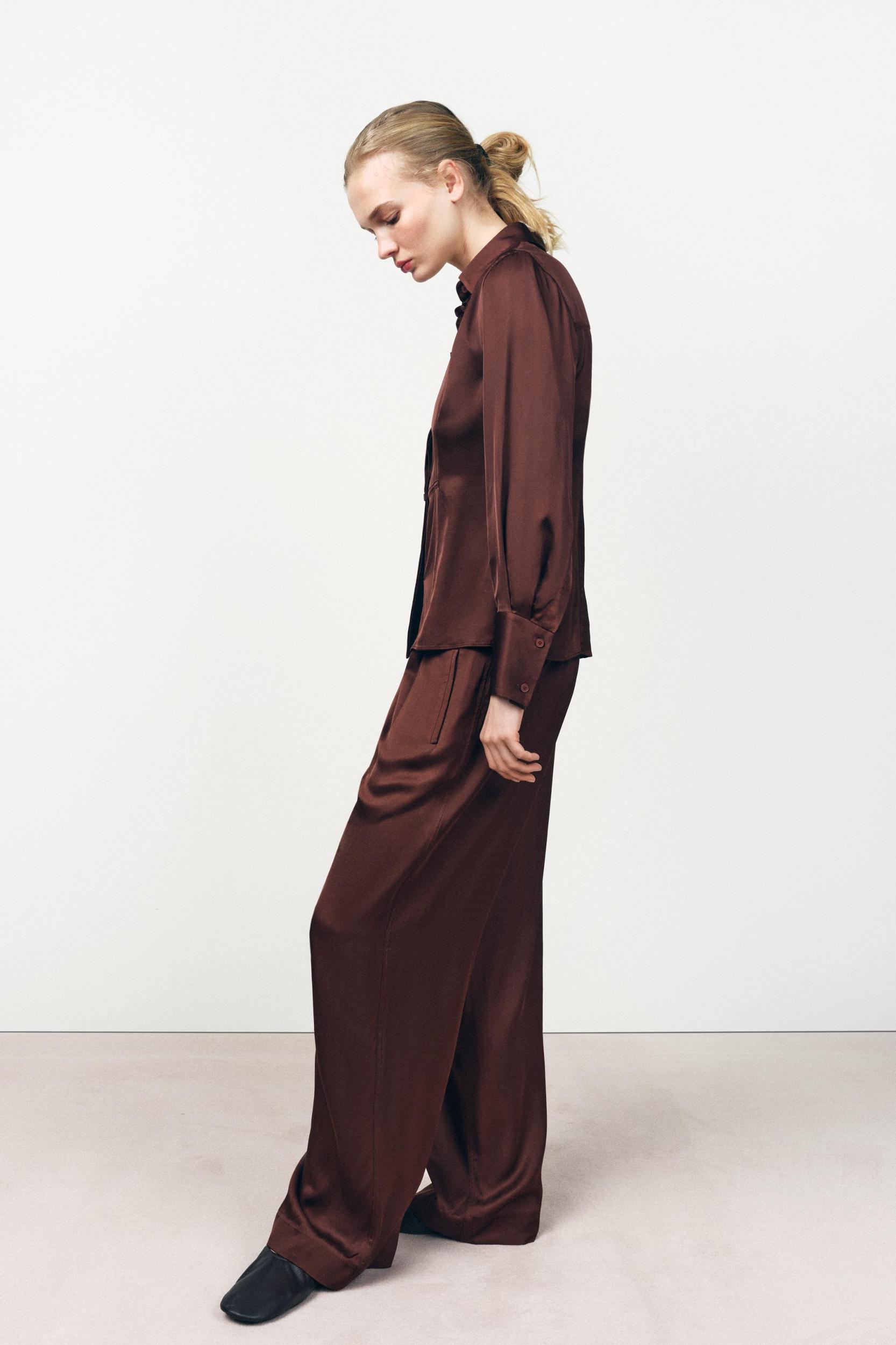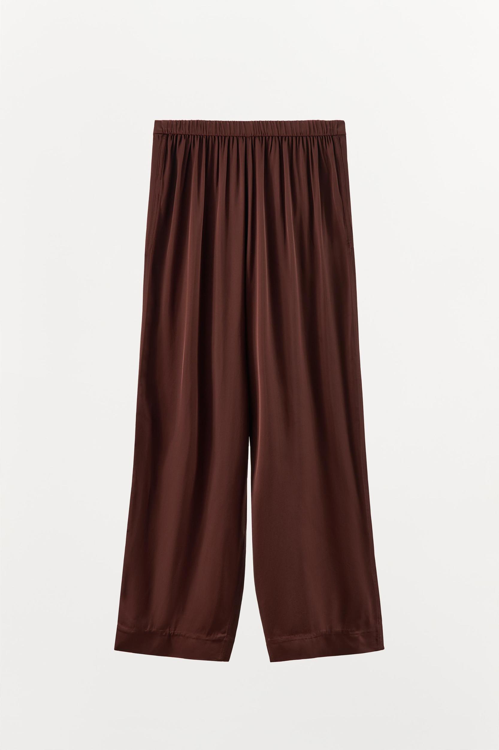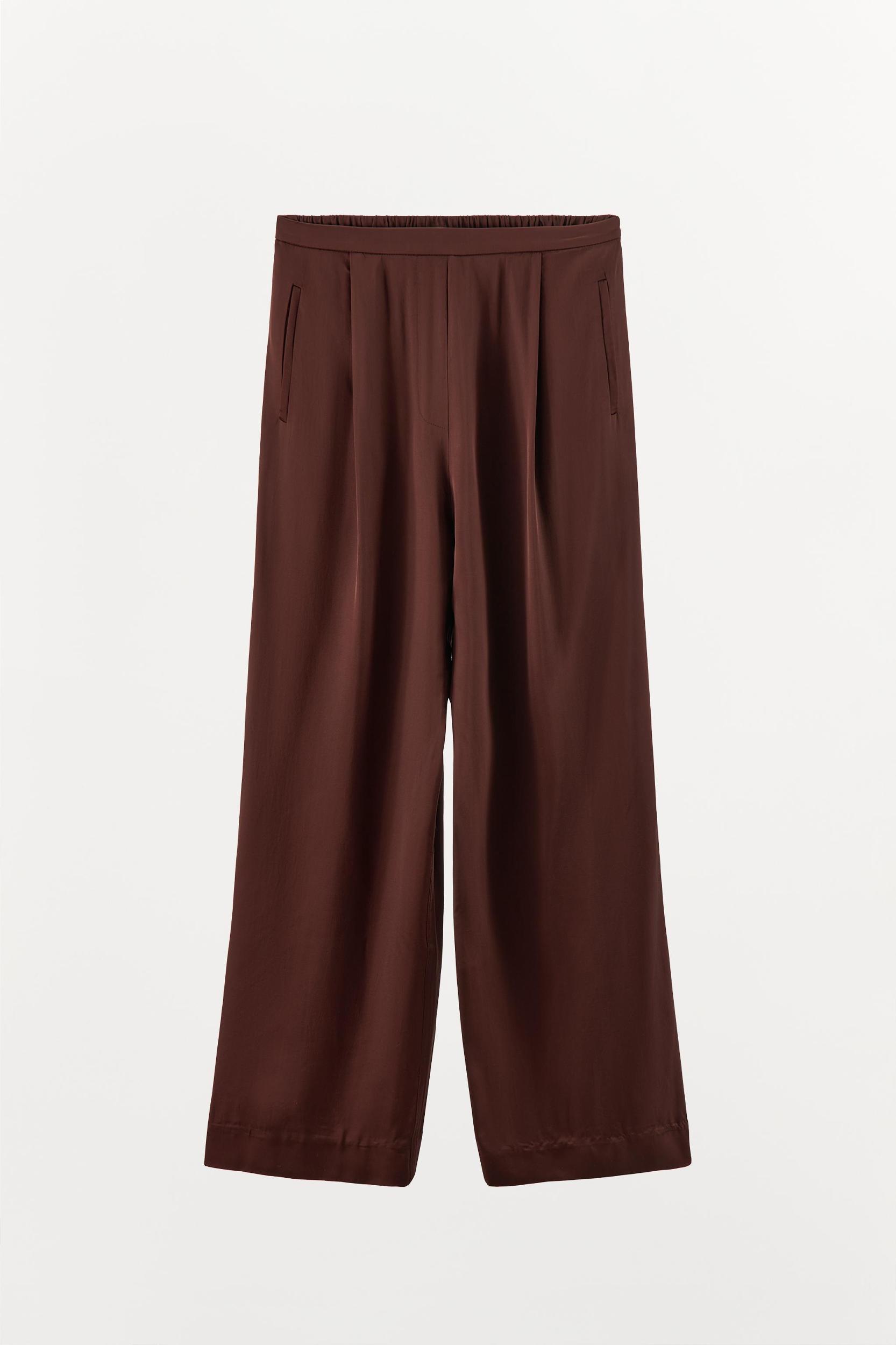 Flowy pants made of 100% viscose yarn. Mid-rise with elastic back waistband. Front pleat detail and welt pockets. Matching side stripe. Straight leg.