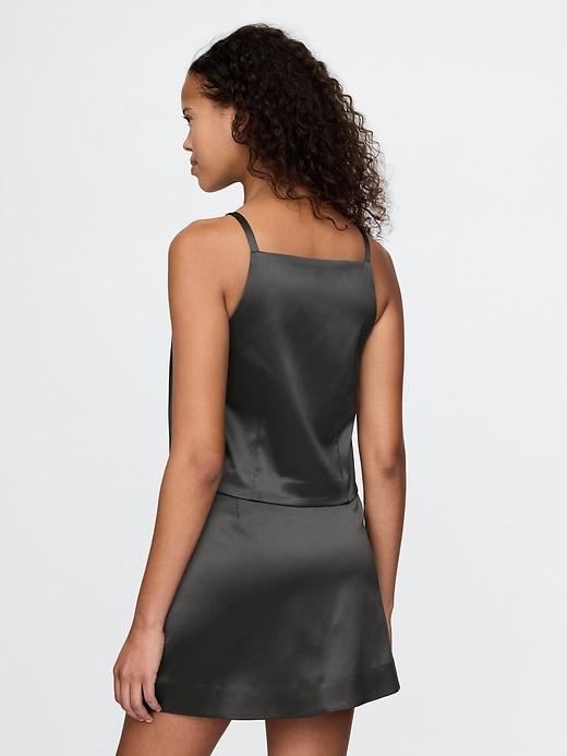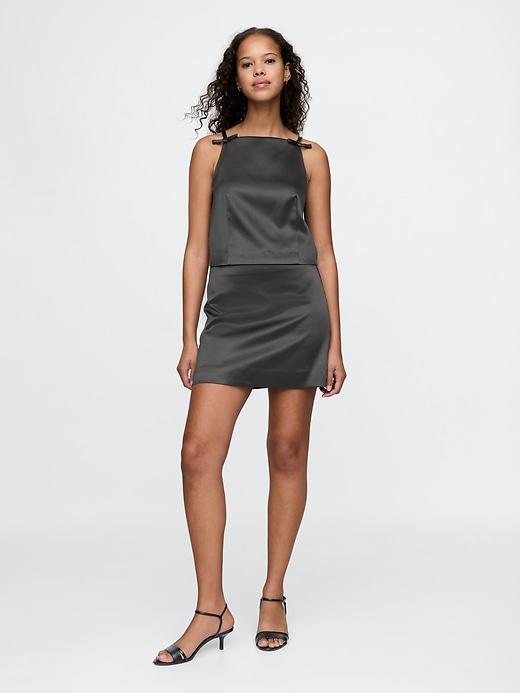 Smooth stretch satin top. Square neck with bow detail at straps. Sleeveless. This top is made with 98% recycled polyester. Compared to virgin materials, using recycled materials helps to reduce resource use and waste. #618069