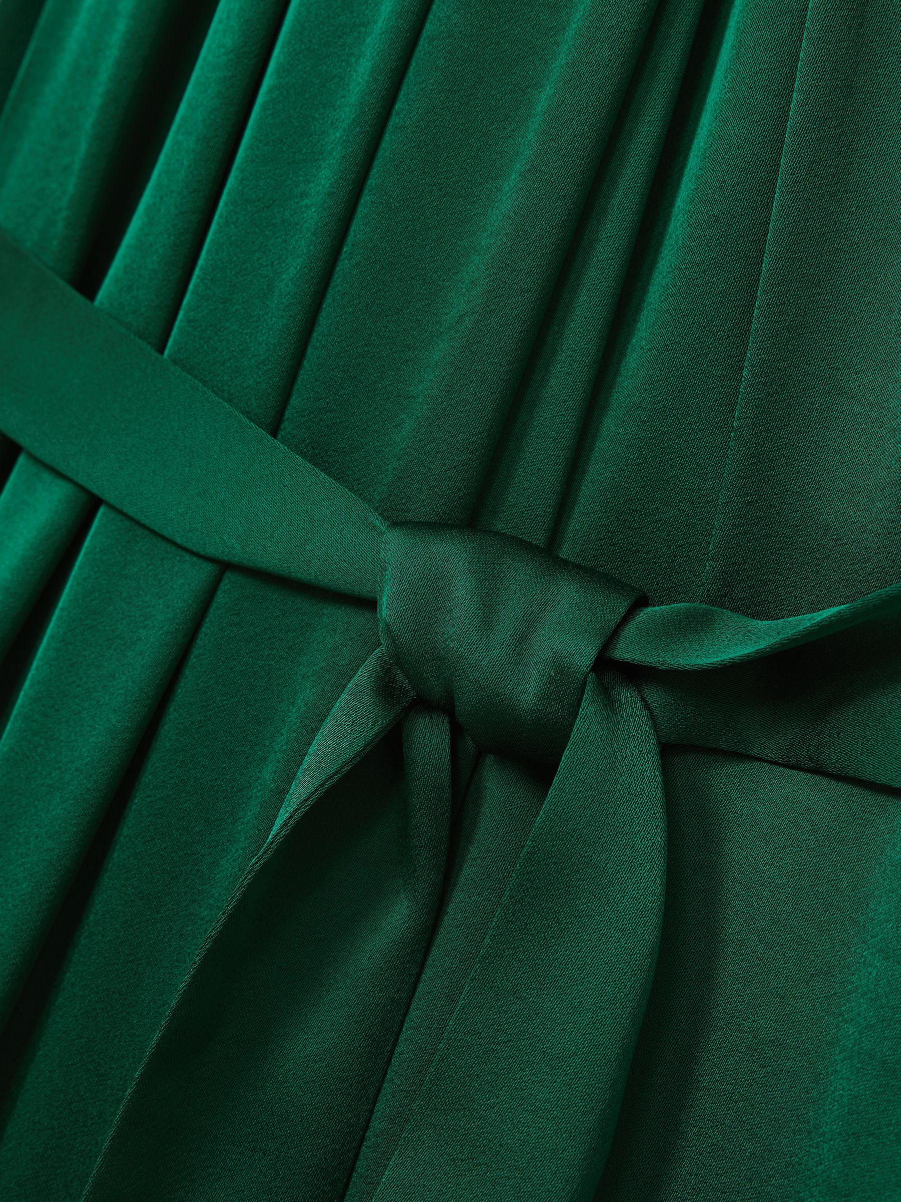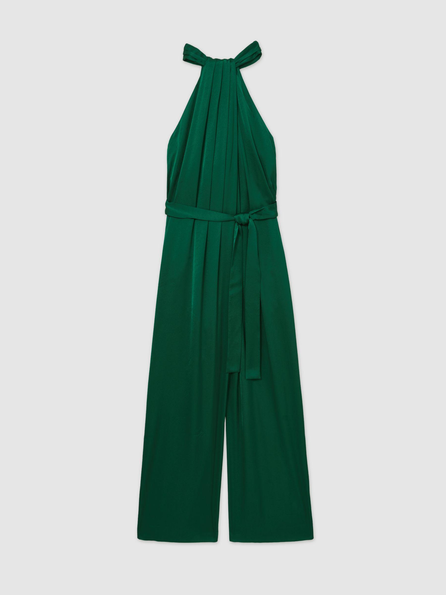 Smooth satin enhances the fluidity of the Rosin jumpsuit, creating an effortlessly elegant silhouette. A self-tie belt defines the waist, while a singular sash wraps around the neckline and drapes down the back, securing with a self-tie for a refined finish. Satin. Wide leg. Draping. Self-tie belt. Side slip pockets. Self-tie sash to reverse.