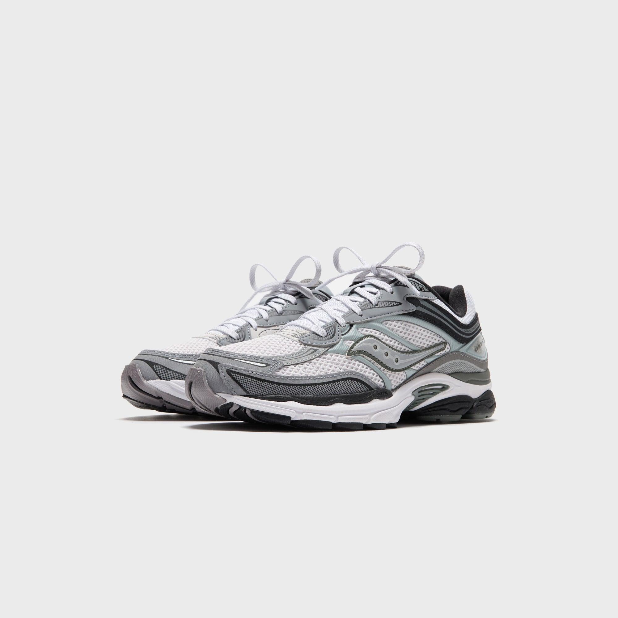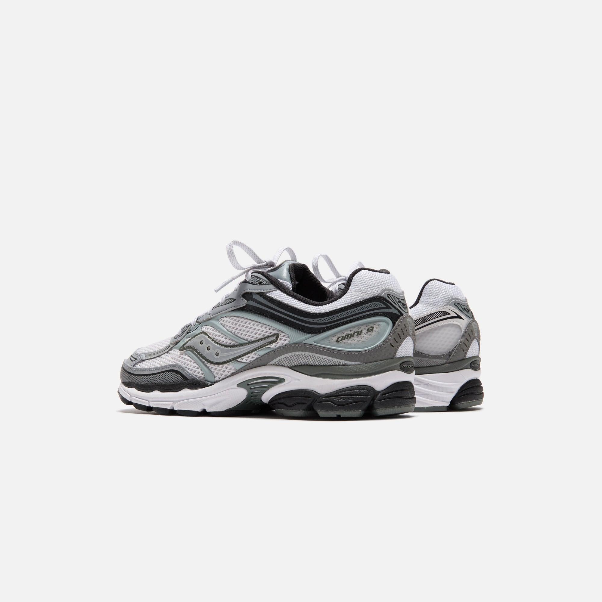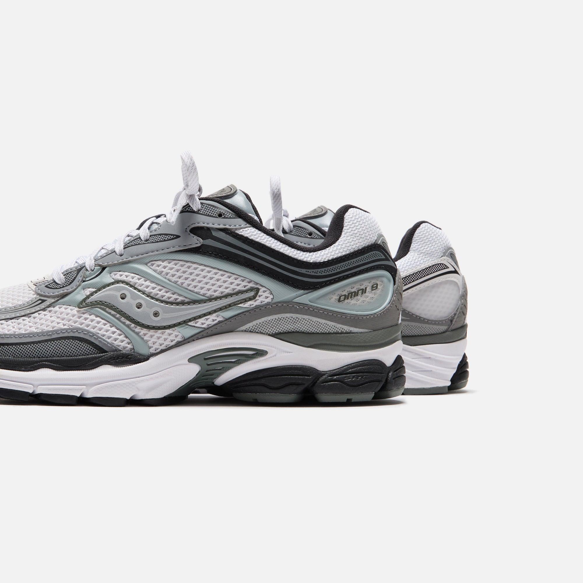 Progrid Omni 9 silhouette Mesh upper Synthetic leather Overlays Padded collar Protective sole cap Saucony branding on tongue Saucony logo on front Saucony stripes on side panels Omni 9 branding on heel panel Saucony logo on rear Progrid branding on heel chip Debossed SRC branding on sole unit Arch-lock badging on inner side panel Perforation on inner heel panel Rope laces Segmented midsole Rubber outsole Style: sas70844-2 Color: White / Grey Material: Mesh / Leather