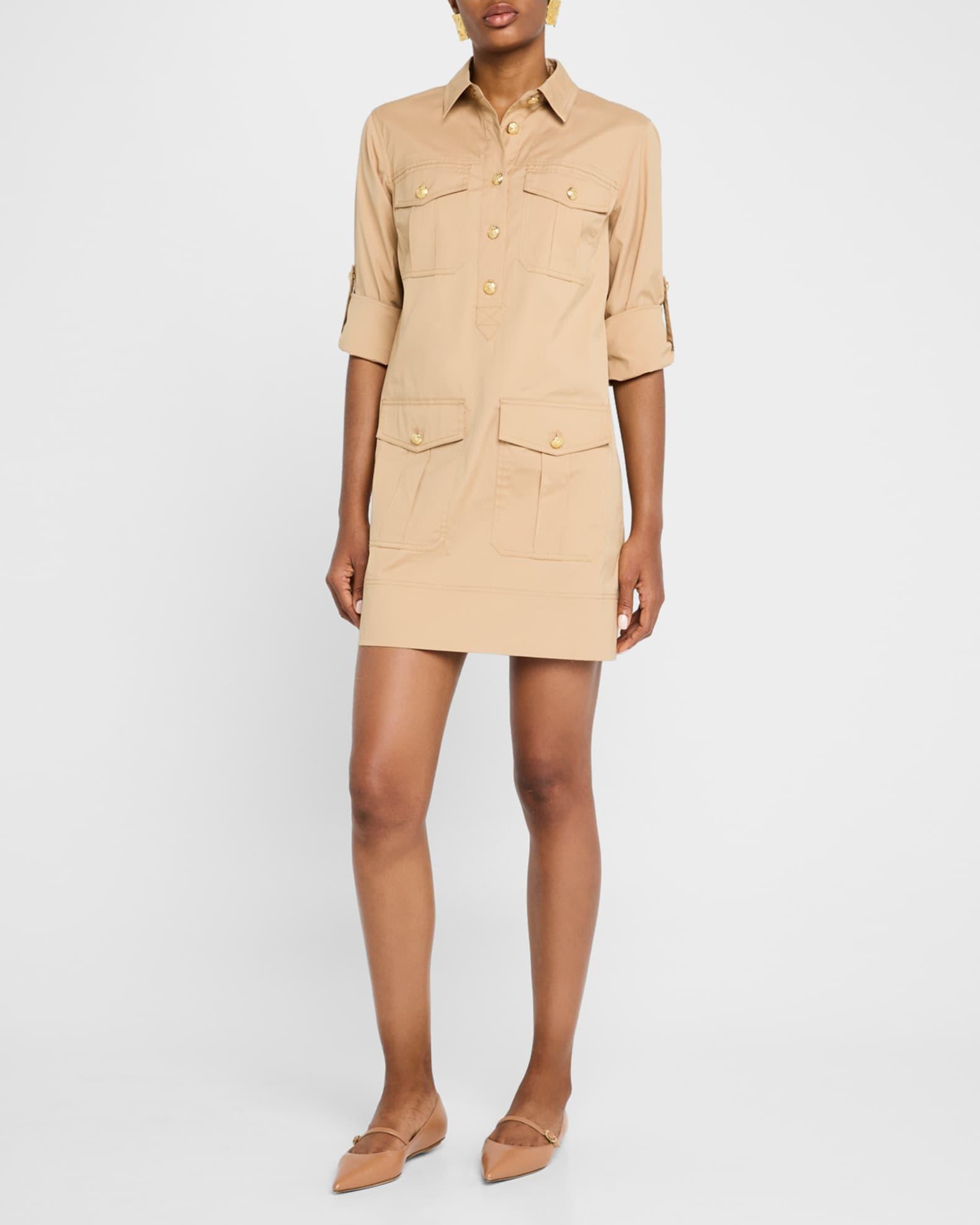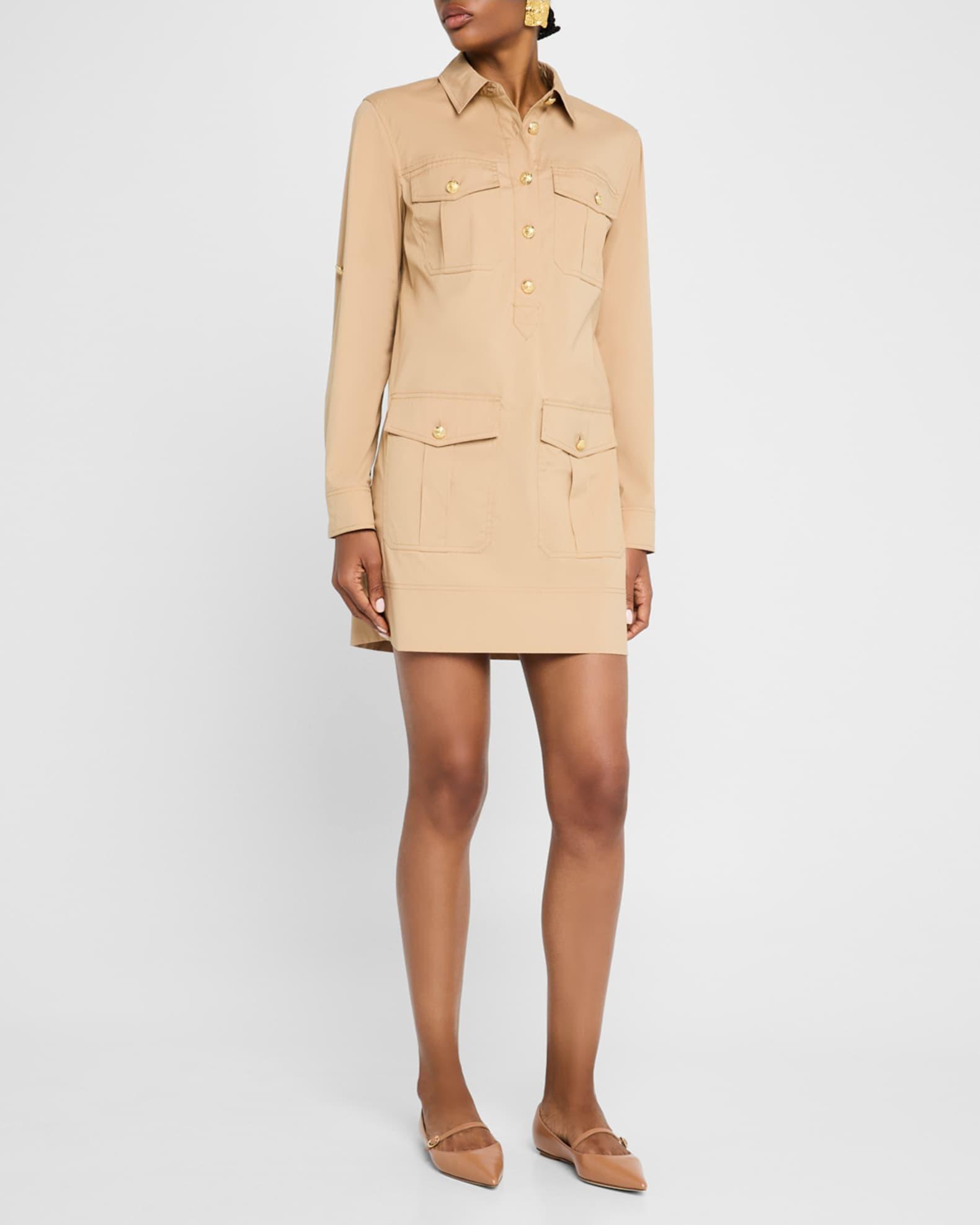 Veronica Beard "Saude" mini dress finished with gold-tone buttons Point collar; button-placket Long sleeves with button cuffs; approx. 32.5"L Chest and hip flap pockets Shirtdress silhouette Hem falls above the knee Cotton/elastane Unlined Dry clean Imported Model is 5'10"/177cm.
