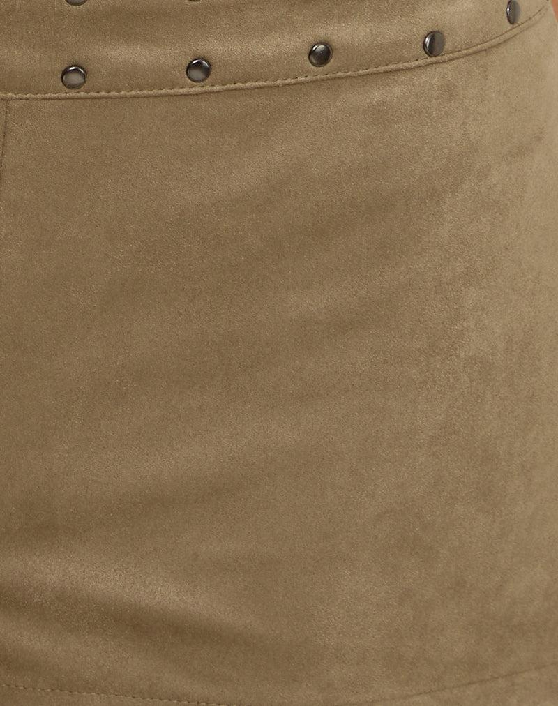 The Saumya micro shorts in faux suede mushroom grey feature a low-rise micro fit, studded waistband, and back pocket details. Pair with the Jalisa top. MODEL WEARS SIZE: EXTRA SMALL - MODEL HEIGHT: 5'7