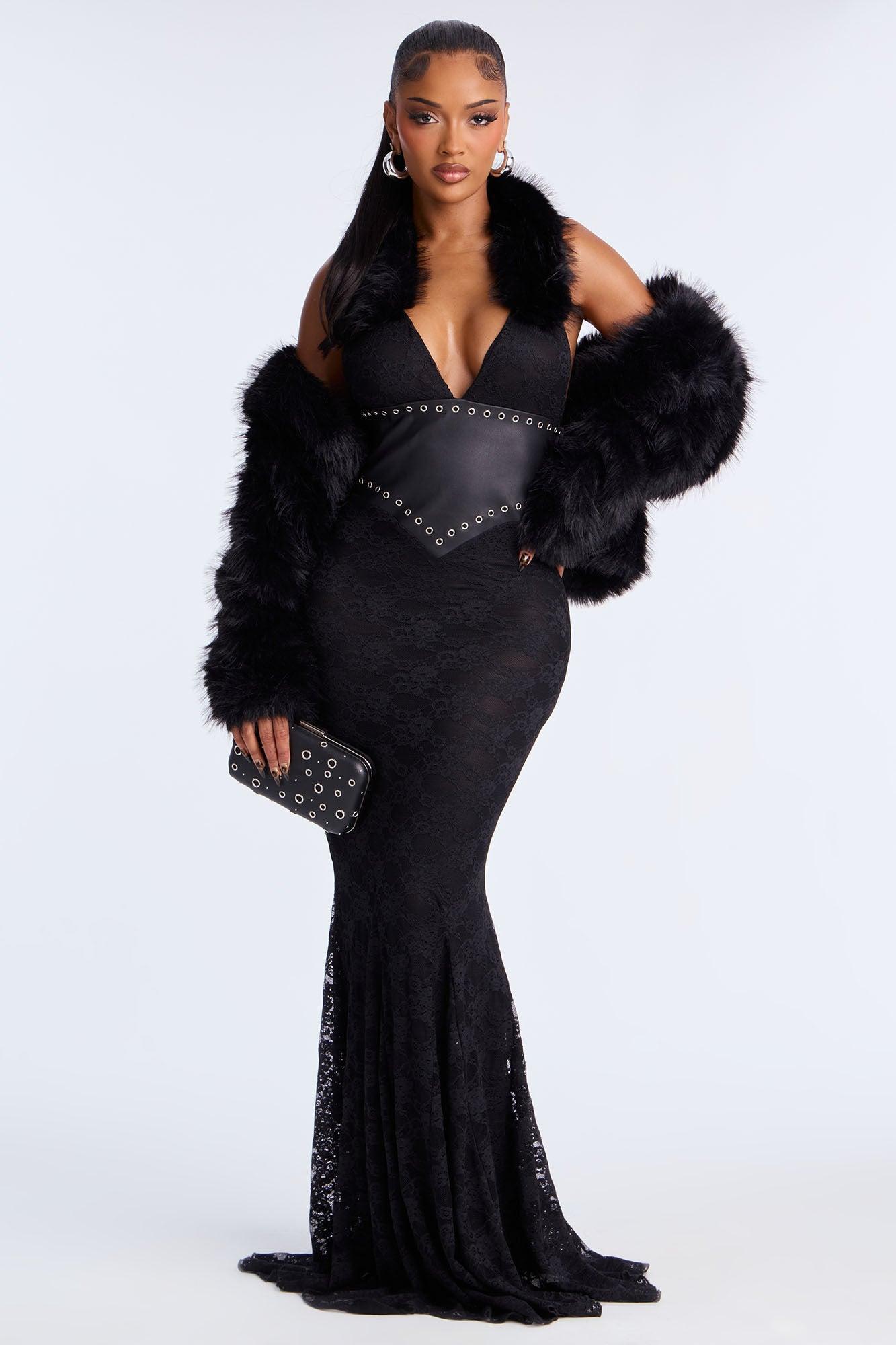 Available In Black. Lace Maxi Dress Stretch Fur Trim Halter Side Zip Closure Self: 95% Nylon 5% Spandex Contrast 1: 50% Polyurethane 50% Cotton Contrast 2: 100% Polyester Lining: 90% Polyester 10% Spandex Imported California Proposition 65WARNING: Cancer and Reproductive Harm - www.P65Warnings.ca.gov.