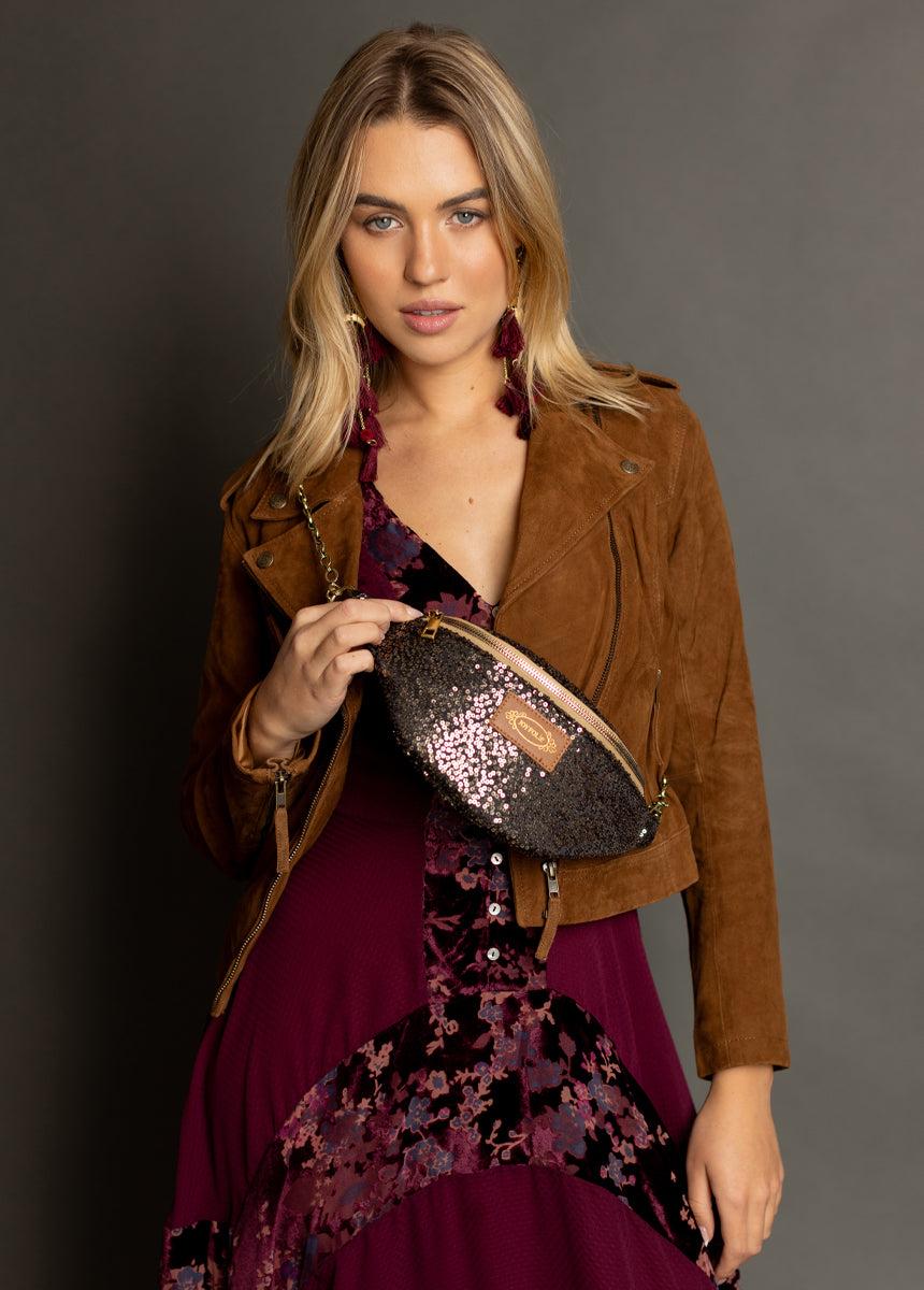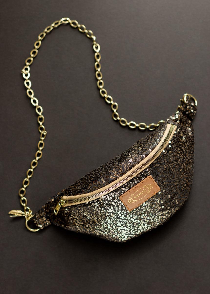 Add a touch of glamour to your look with our sequin belt bag, designed to bring sparkle and style to any outfit. Featuring a spacious large zipper pouch, this chic accessory lets you carry all your belongings with ease and security. The eye-catching gold chain strap adds a luxe finish, making it perfect for day or night wear. Whether you're heading out for a night on the town or a casual outing, this belt bag is the ultimate way to elevate your ensemble. Complete your wardrobe with this trendy piece and enjoy both fashion and functionality in one stylish accessory. Large zipper pouch Satin lining Adjustable strap 10" Wide x 5.5" Tall Wipe to clean