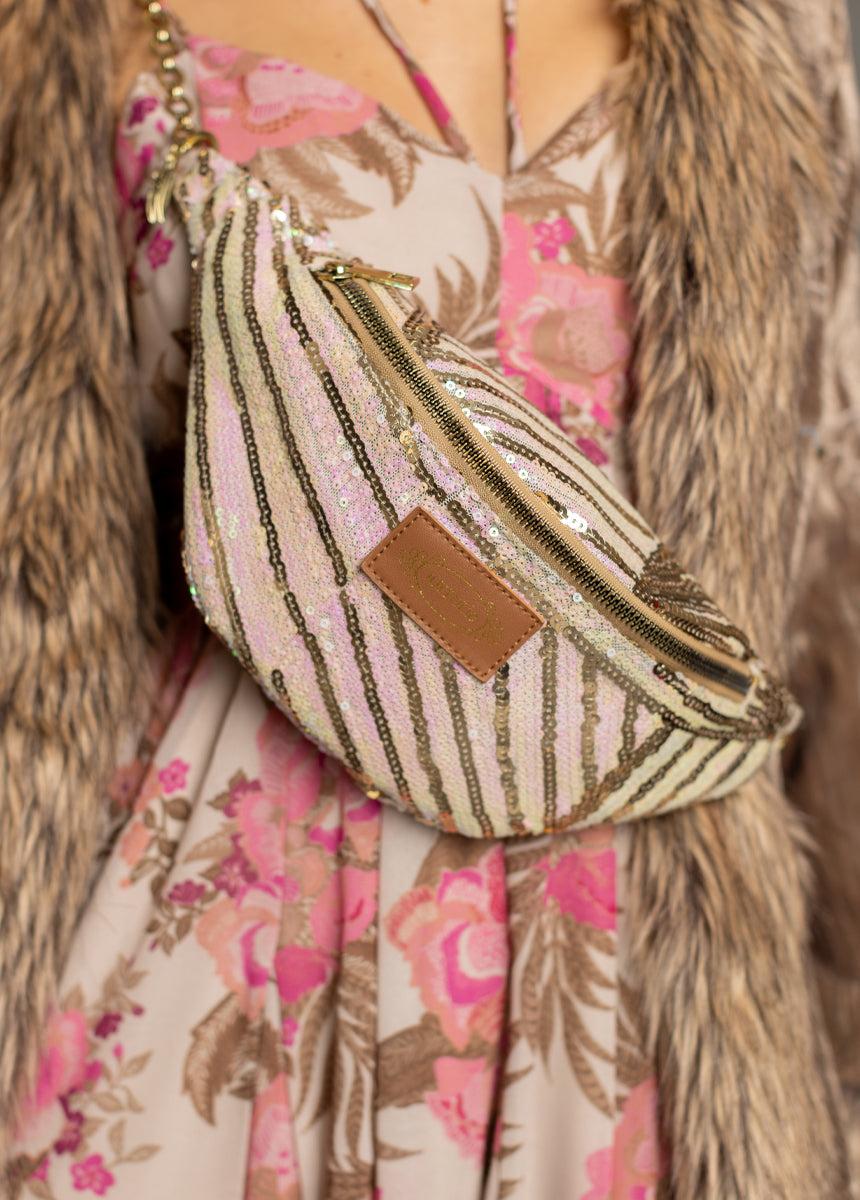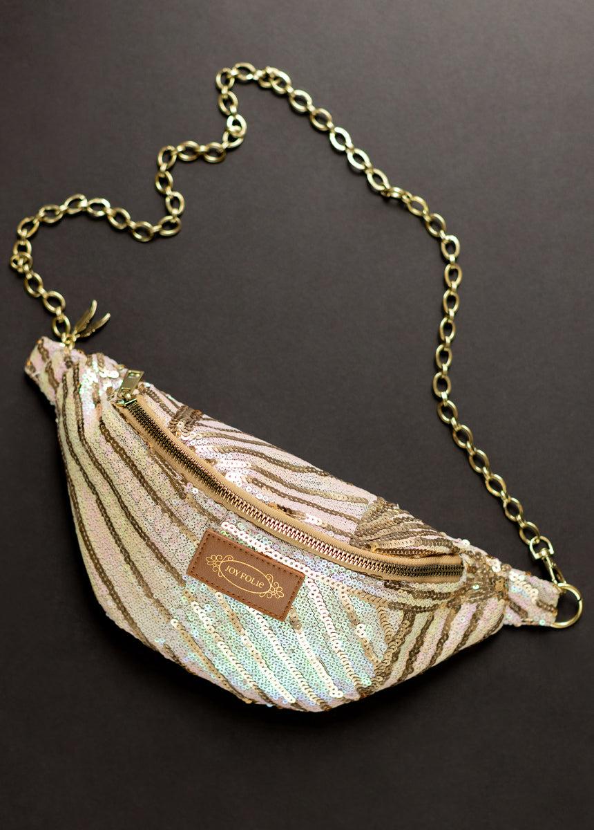 Add a touch of glamour to your look with our sequin belt bag, designed to bring sparkle and style to any outfit. Featuring a spacious large zipper pouch, this chic accessory lets you carry all your belongings with ease and security. The eye-catching gold chain strap adds a luxe finish, making it perfect for day or night wear. Whether you're heading out for a night on the town or a casual outing, this belt bag is the ultimate way to elevate your ensemble. Complete your wardrobe with this trendy piece and enjoy both fashion and functionality in one stylish accessory. Large zipper pouch Satin lining Adjustable strap 10" Wide x 5.5" Tall Wipe to clean