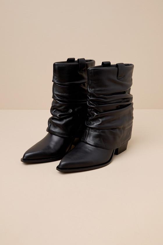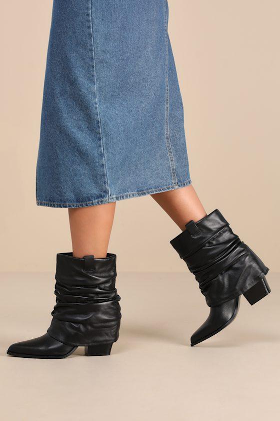 You'll be ready to take on the night the moment you slip on the D'Amelio Footwear Savella Black Sheep Nappa Leather Slouchy Western Booties! The Western-inspired silhouette of these trendy boots is composed of extra smooth, genuine Nappa leather that shapes a classic pointed-toe upper and a slouchy, foldover design that tops the ankle-high shaft. Pull tabs at the instep and outstep allow for easy on-and-off, while a stacked block heel ensures stability and comfort.
