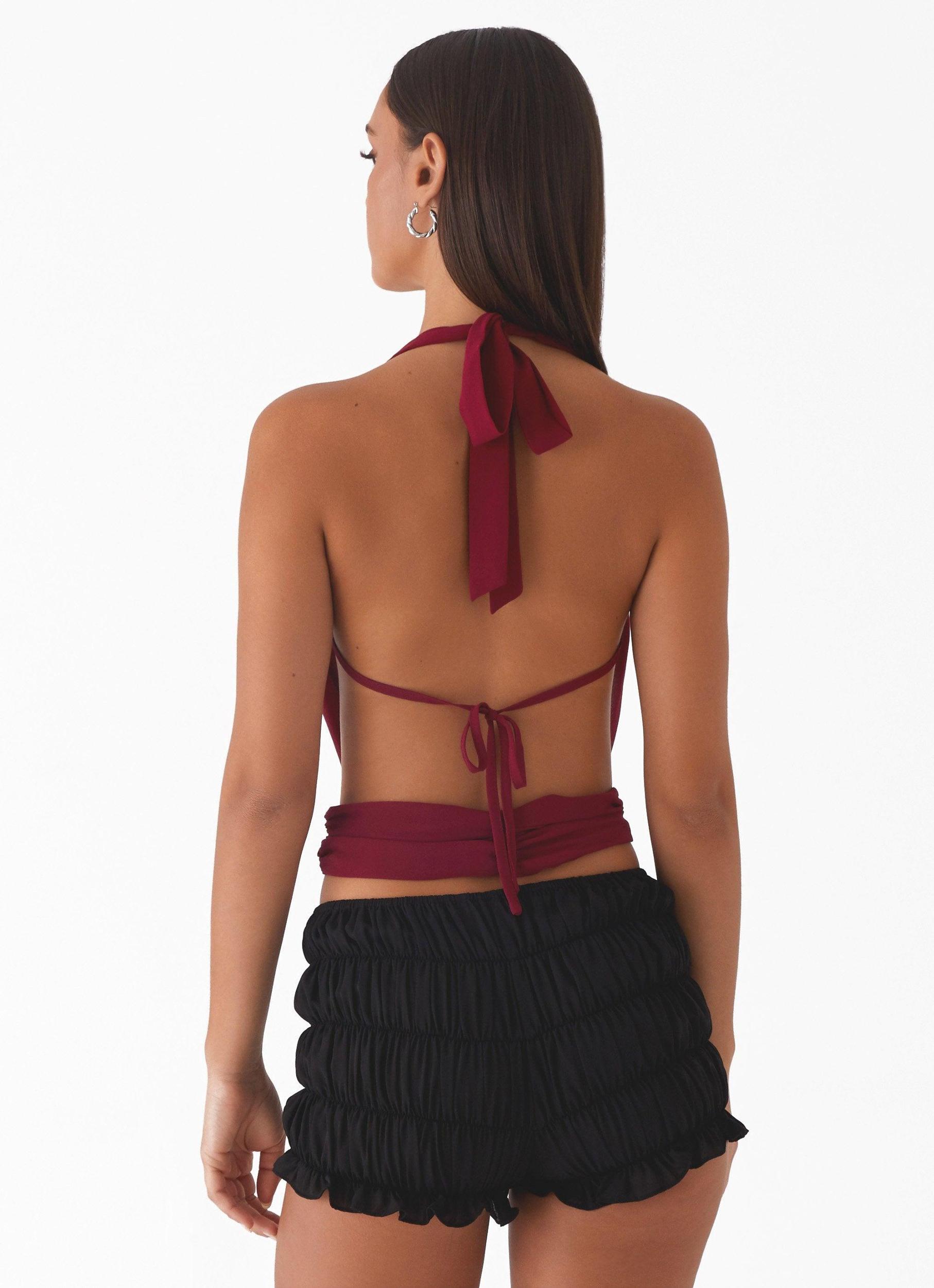 Peppermayo Exclusive Elevate your evening look with the Sawyer Top. Featuring a low V cowl neckline and a chic neck tie, this self-lined top exudes sophistication. Its draped silhouette adds a touch of fluidity and grace, making it a standout piece for any occasion. - Midi Length- Low V Cowl Neckline- Neck Tie- Back Tie- Self Lined- 100% Polyester Size AU 8 / US 4 garment measurements: Bust: 50 cm / 19.7 inWaist: 69 cm / 27.2 inLength: 53 cm / 20.9 in Roberta is 177cm and wears size AU 6 / size US 2