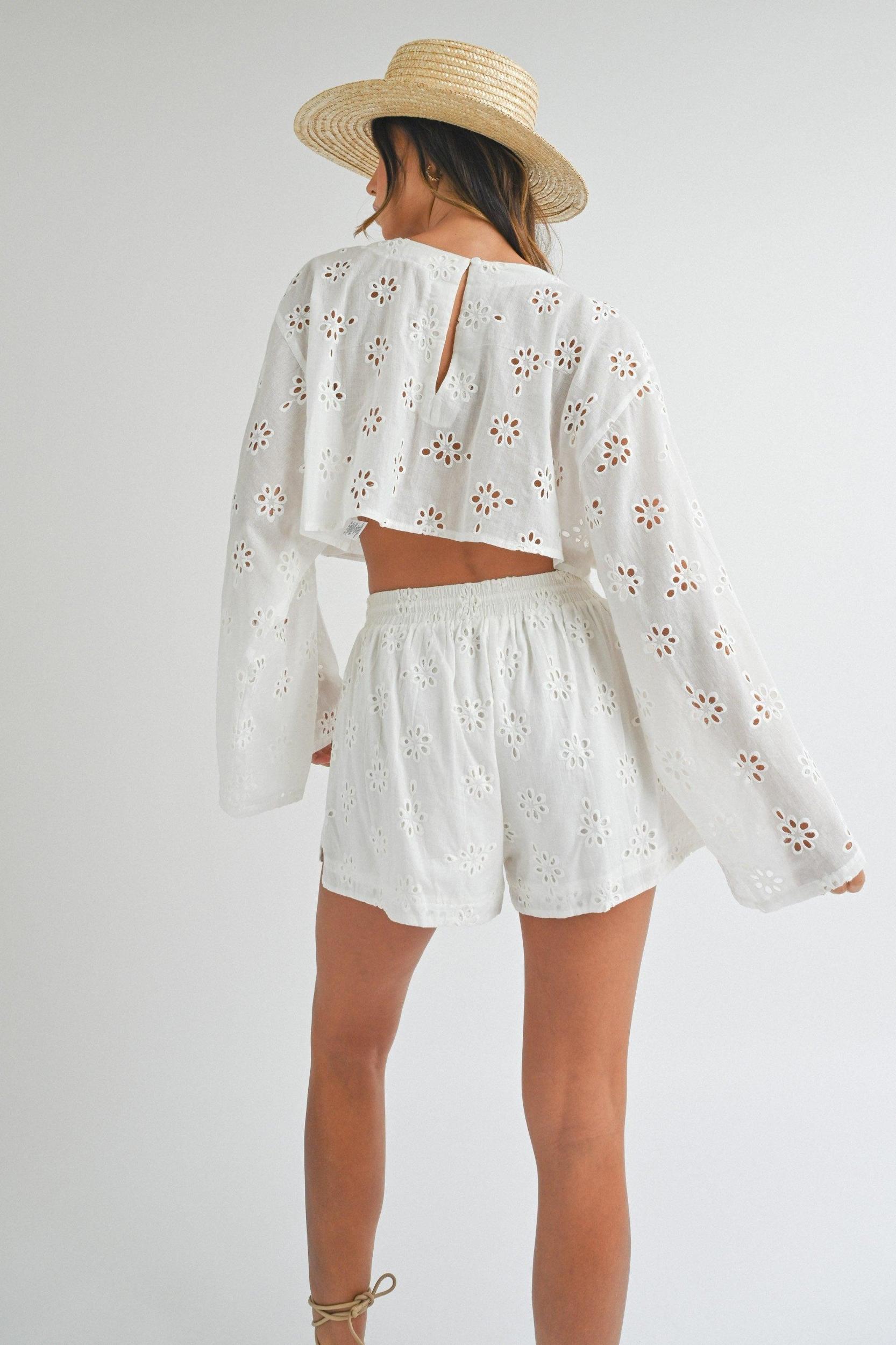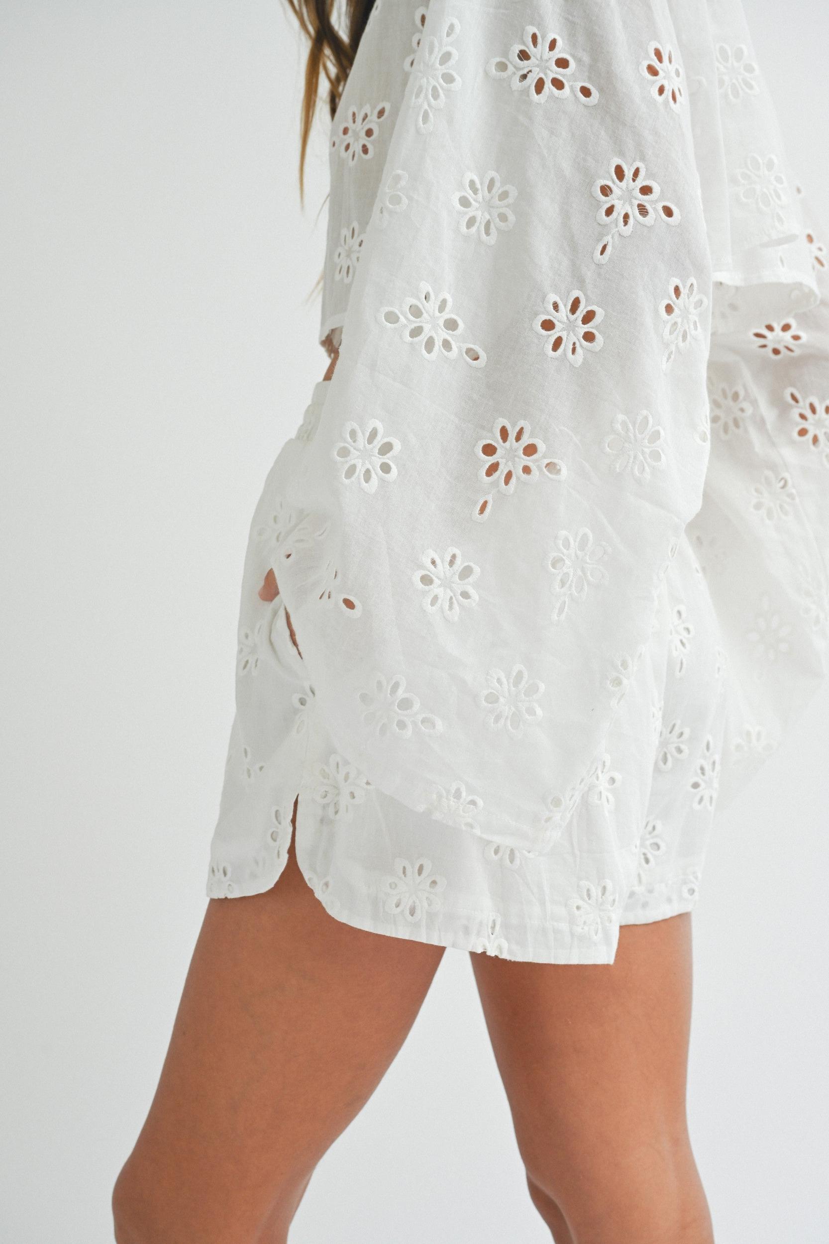 Get ready to strut your stuff in these eye-catching Sawyer White shorts! Designed with a playful floral eyelet pattern, these beach shorts feature a stretchy elastic waistband and convenient pockets. Perfect for a day out in the sun, these shorts are a must-have addition to your wardrobe.
