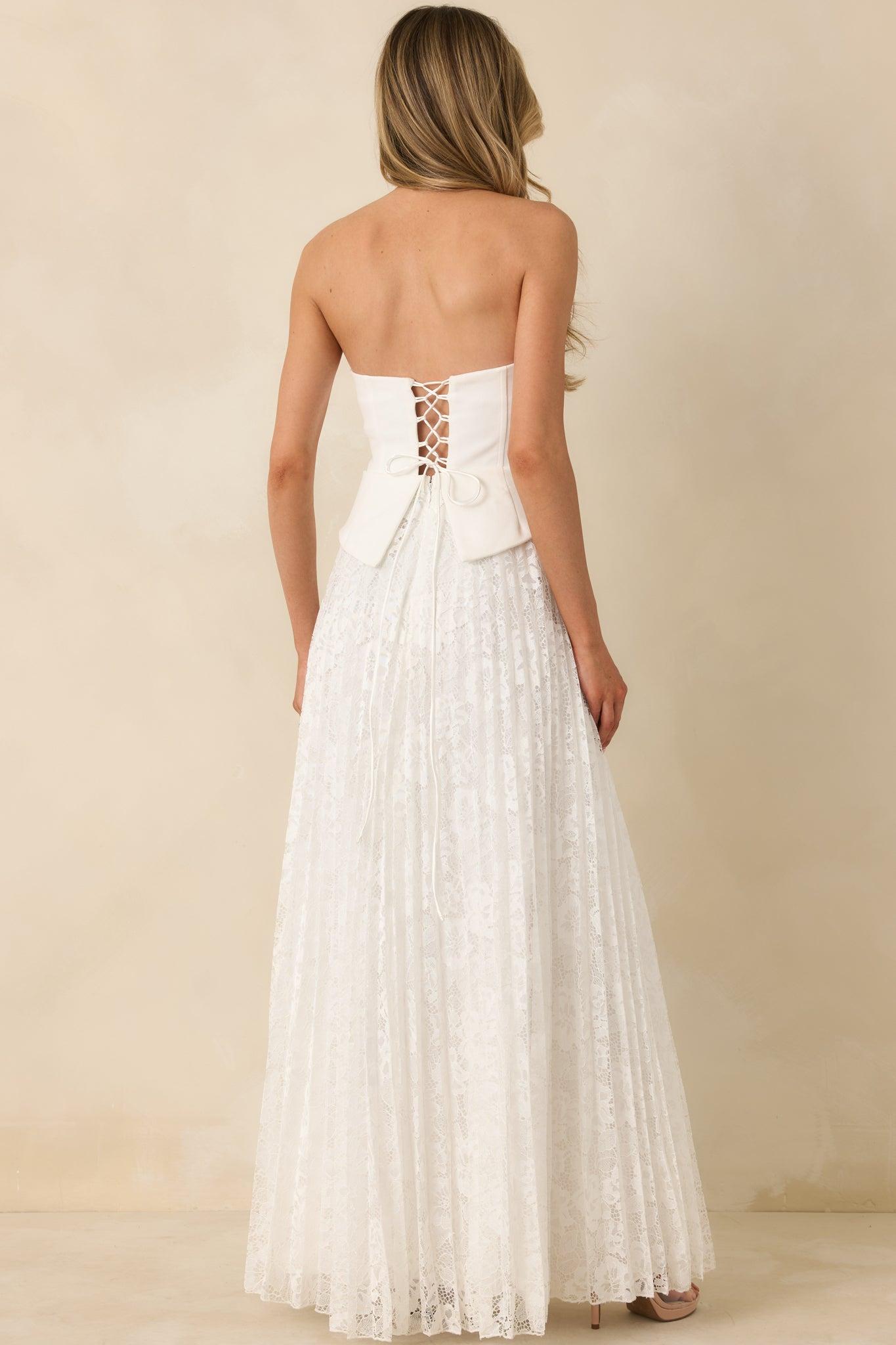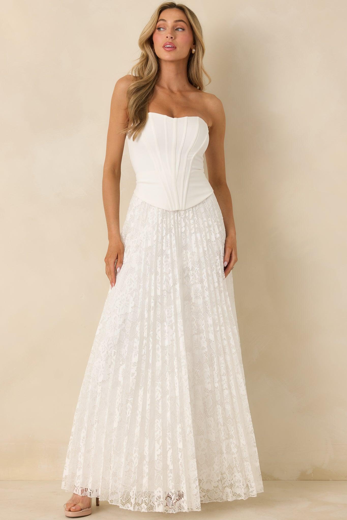 Say Yes to This White Corset Bodice & Pleated Lace Maxi Dress is one of those dresses that makes the moment feel special before you even step out the door. The structured bodice brings a flattering, confident fit while the lace skirt adds softness and movement with every step. Whether it’s a wedding, a formal event, or a once-in-a-while kind of night, this is the dress you say yes to when you want everything to feel just right. This white maxi dress features a structured corset-style bodice with a strapless neckline and a lace-up back for an adjustable, flattering fit. The skirt flows into a pleated lace design that adds soft movement and an elegant finish. Fully lined for coverage and comfort.Self: 95% Polyester & 5% SpandexContrast: 100% PolyesterLining 1: 100% PolyesterLining 2: 97% Polyester & 3% SpandexHand Wash ColdManufactured in ChinaDesigned in the USAModel is 5'8" and wearing size small, clipped, model is a true x-small