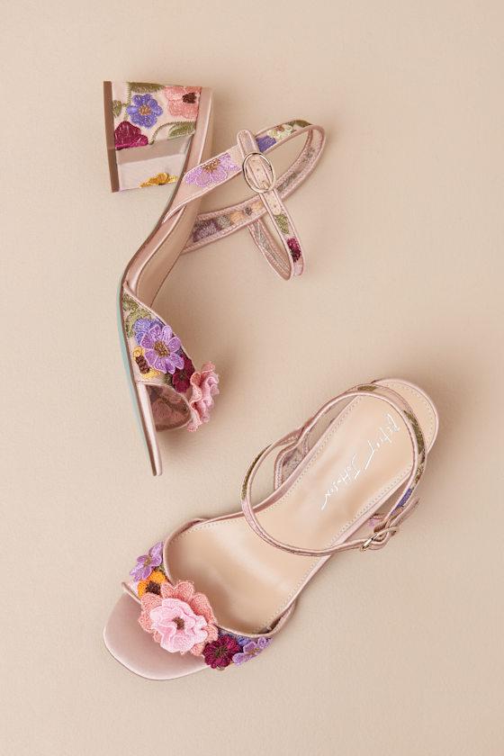 Set the tone for a fabulous night with these extravagant Betsey Johnson heels that feature a sleek satin and sheer mesh construction with three-dimensional floral appliques and intricate embroidery throughout. A square footbed, tapered toe strap, and adjustable quarter strap complete the look. Iconic blue sole.