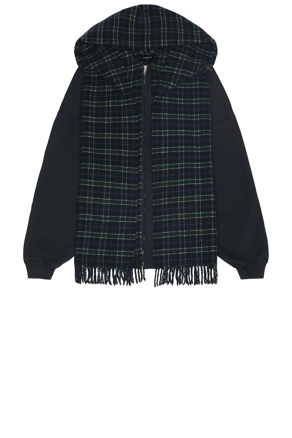 sweatshirtSelf: 98% cotton, 2% elastaneContrast Fabric:93% wool, 7% cashmereTrim: 100% cottonRib: 100% polyester / Made in Portugal / Dry clean only / Front zipper closure / Side slant pockets / Attached hood and scarf / Ribbed trim / Terrycloth lining / Our Style No. BALF-MK144 / Manufacturer Style No. 794747-TQVM2-4021 / Model is wearing size 3.