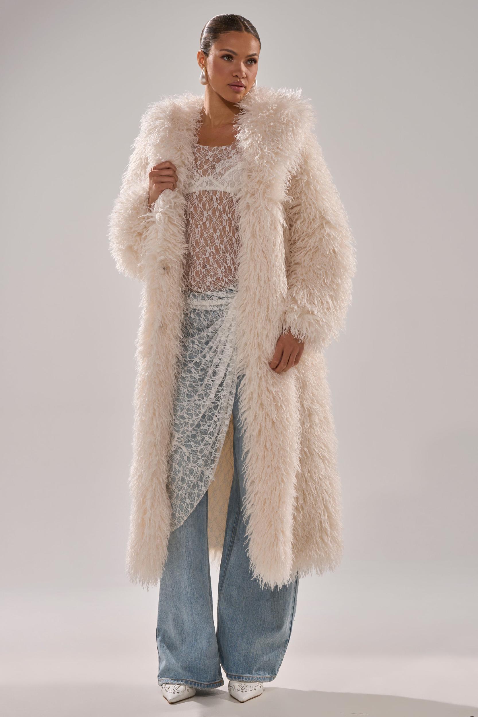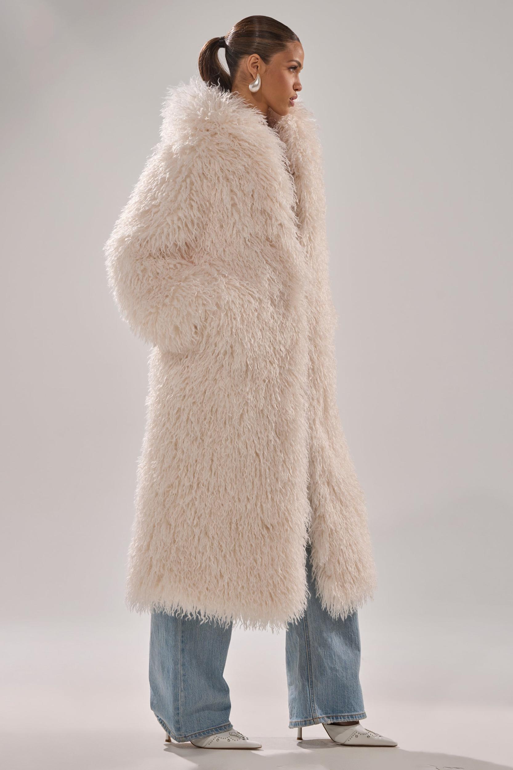 Bundle up like an A-lister with The AKIRA Label Scarlett Faux Fur Coat. This fabulous coat is crafted from irresistibly plush, shaggy-chic faux fur and features an oversized, voluminous silhouette, a longline cut, wide collar, long sleeves, and spacious side-seam pockets. Complete with silky-smooth lining and discreet hook-and-eye front closures, this coat delivers as much glamor as it does warmth and comfort. - Fur: 100% Polyester, Lining: 100% Polyester- Dry Clean Only- No Stretch- Imported (all measurements approximate from size S/M)- 50” Shoulder to Hem- 17” Shoulder to Shoulder- 24” SleevesProduct ID: 1062557 (all measurements approximate from size 1X/2X)- 53” Shoulder to Hem- 24” Shoulder to Shoulder- 25” SleevesProduct ID: 1062559