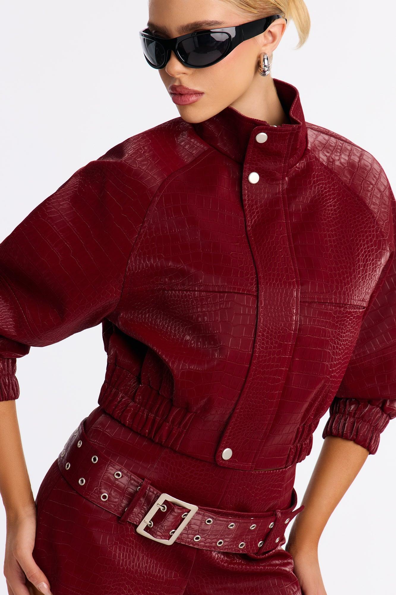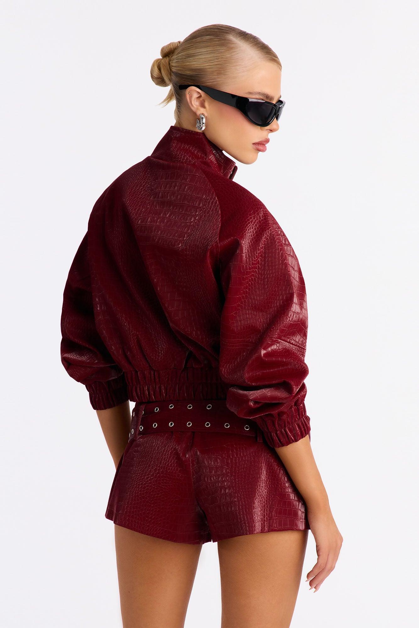 Available In Red. 2 Piece Ensemble Jacket And Short Set Non Stretch Lined Zip Up Belted Booty Shorts Self: 100% Cotton With Polyurethane Coating Lining: 100% Polyester Imported California Proposition 65WARNING: Cancer and Reproductive Harm - www.P65Warnings.ca.gov.