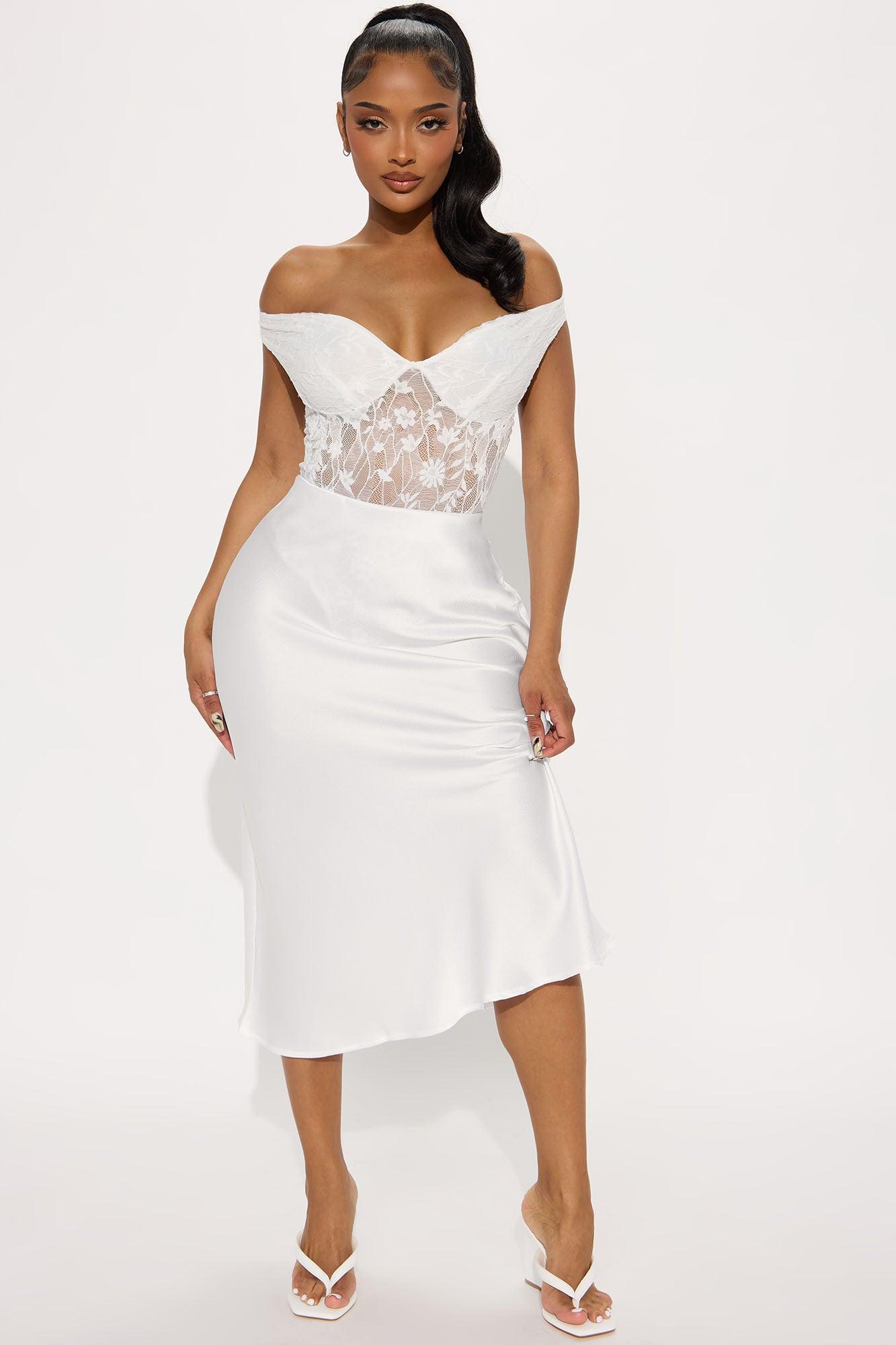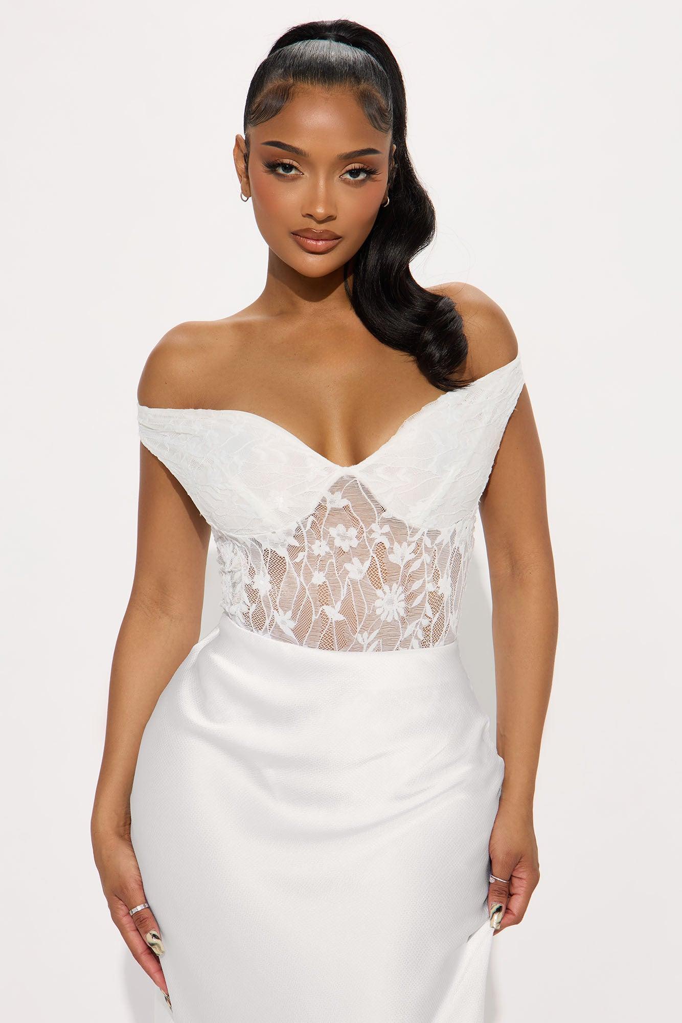 Available In Off White And Mustard. Off Shoulder Bodysuit Stretch Seaming Sheer Lace Cheeky Bottom Snap Closure Final Sale Self: 92% Nylon 8% Spandex Lining: 100% Polyester Imported California Proposition 65WARNING: Cancer and Reproductive Harm - www.P65Warnings.ca.gov.