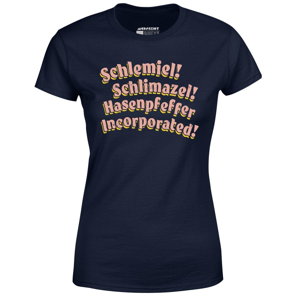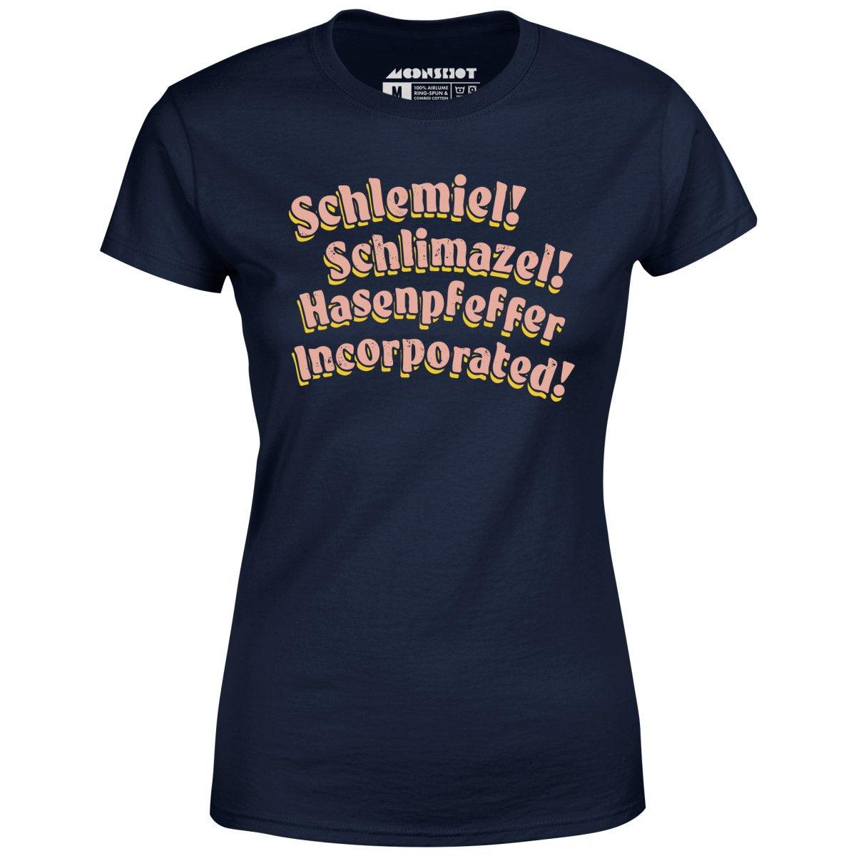Schlemiel! Schlimazel! Hasenpfeffer Incorporated. A stylish retro textual T-Shirt inspired by Laverne & Shirley. Printed on our super soft 100% ringspun & combed cotton women's T-Shirt. Or upgrade to our Luxury 52/48 cotton/poly vintage heather edition for an even softer classic look. We print & ship all of our high quality graphic tees in the USA.