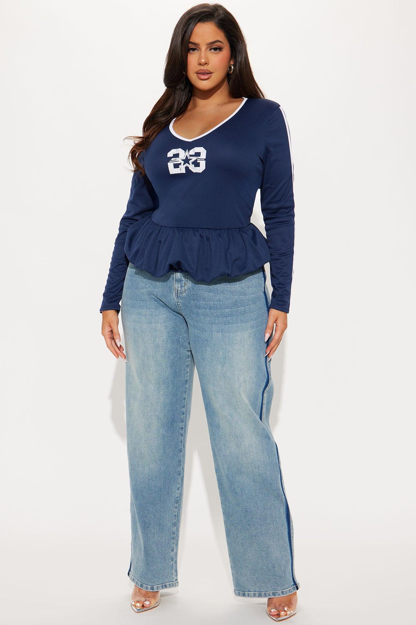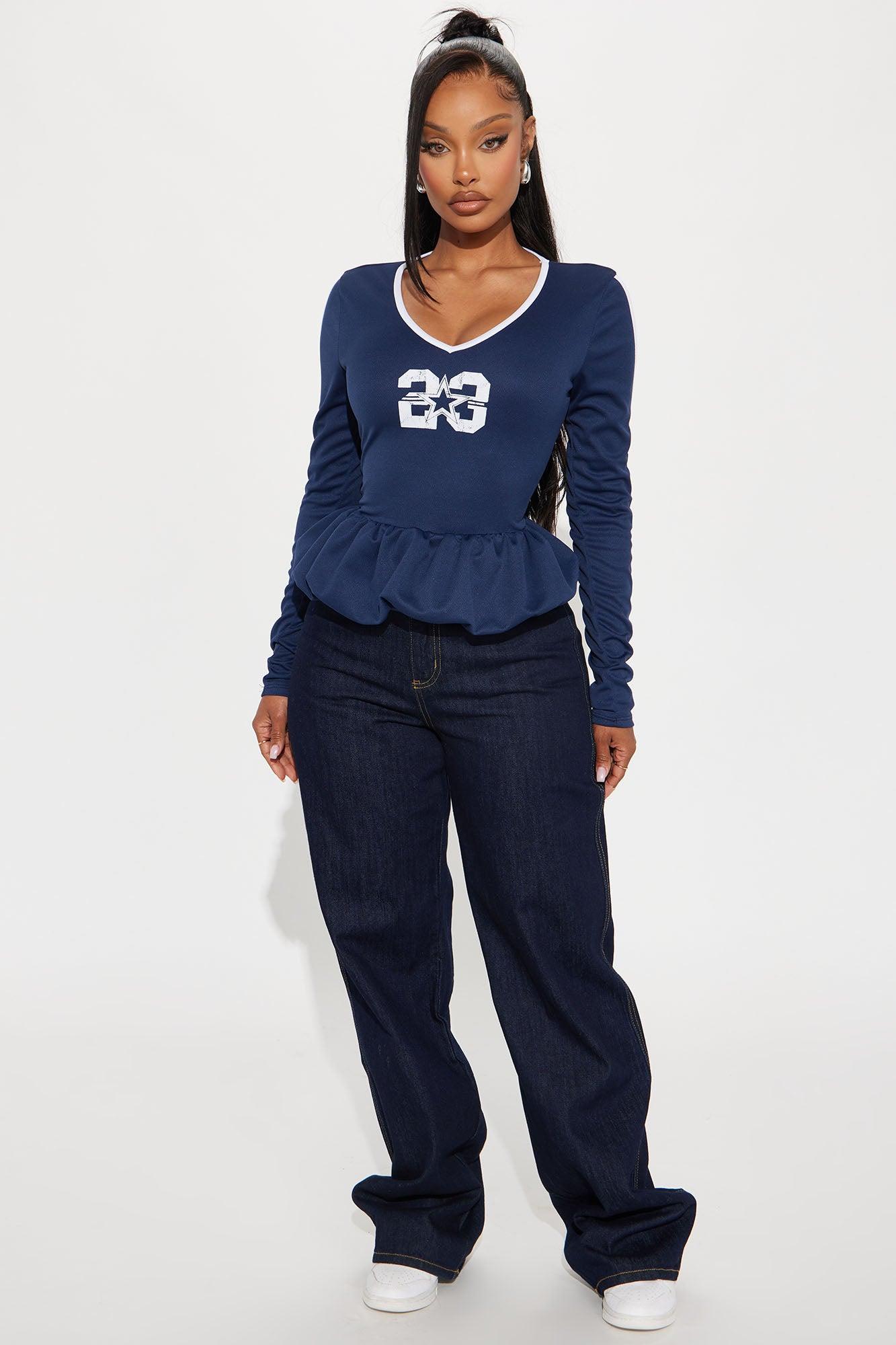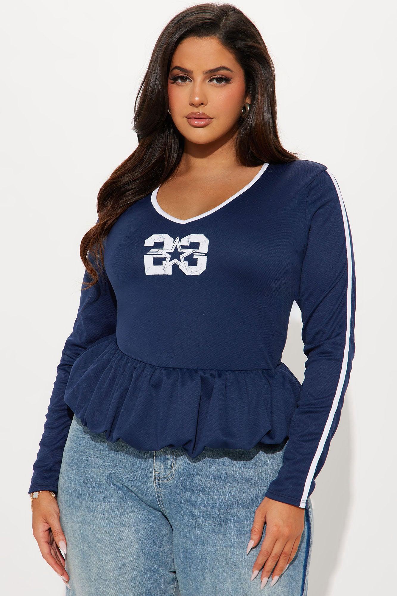 Available In Navy. Bubble Hem Long Sleeve Top Stretch Disclaimer: Due To The Printing Process A Difference In Saturation May Occur. Each Garment Is Unique. Self/ Contrast: 100% Polyester Imported