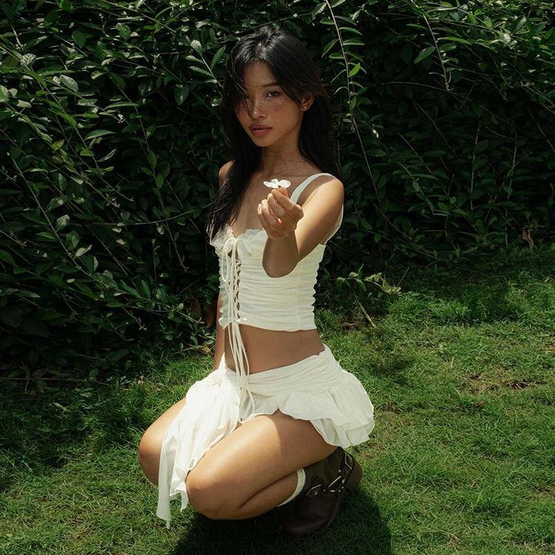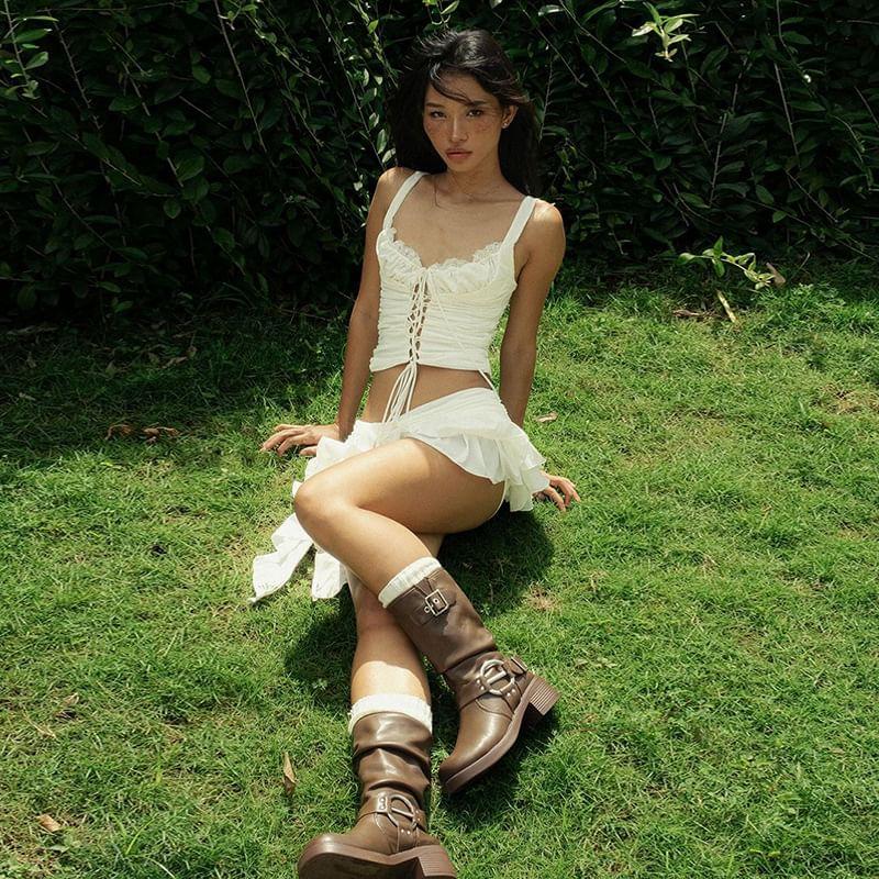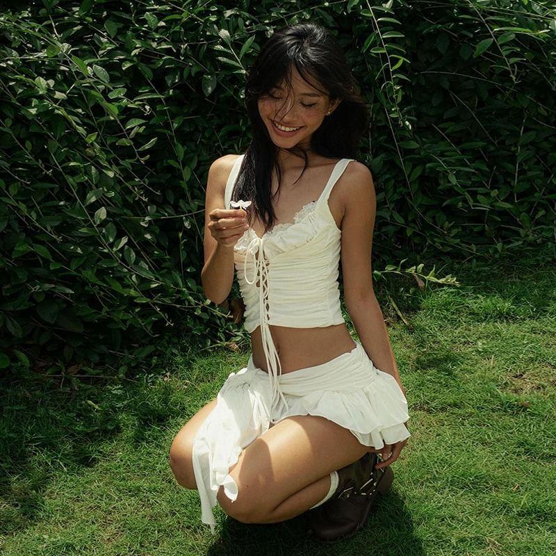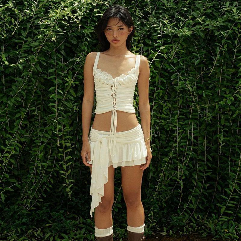 Scoop Neck Lace-Trim Plain Tie-Up Crop Tank Top / Low Waist Mini Skirt