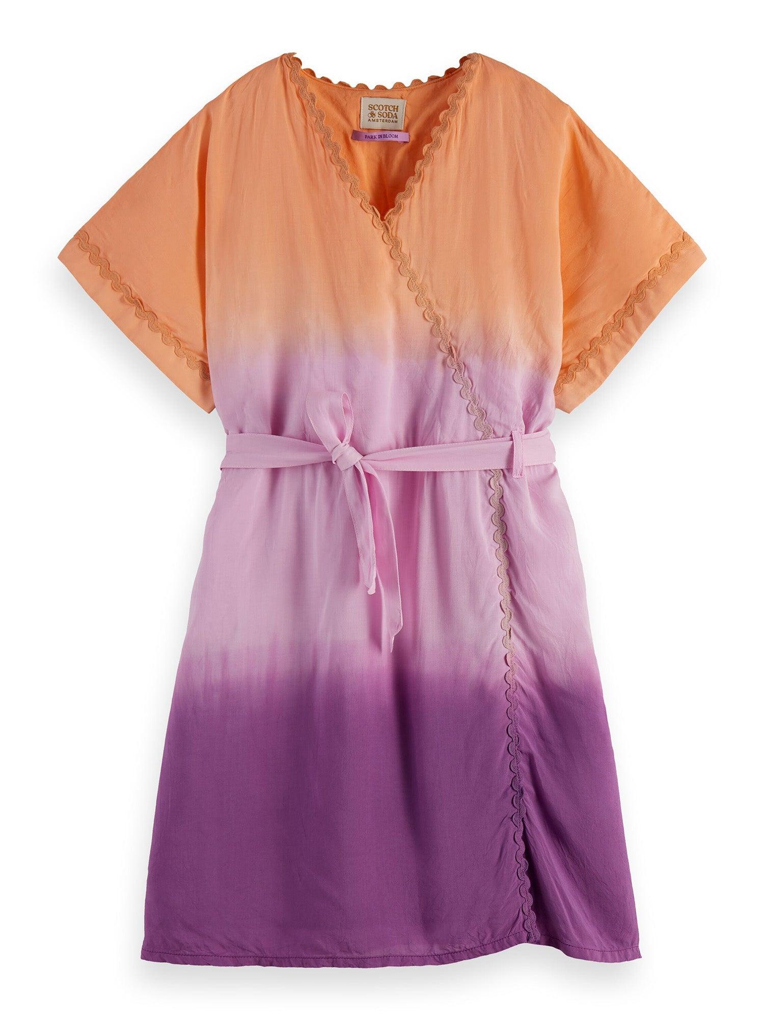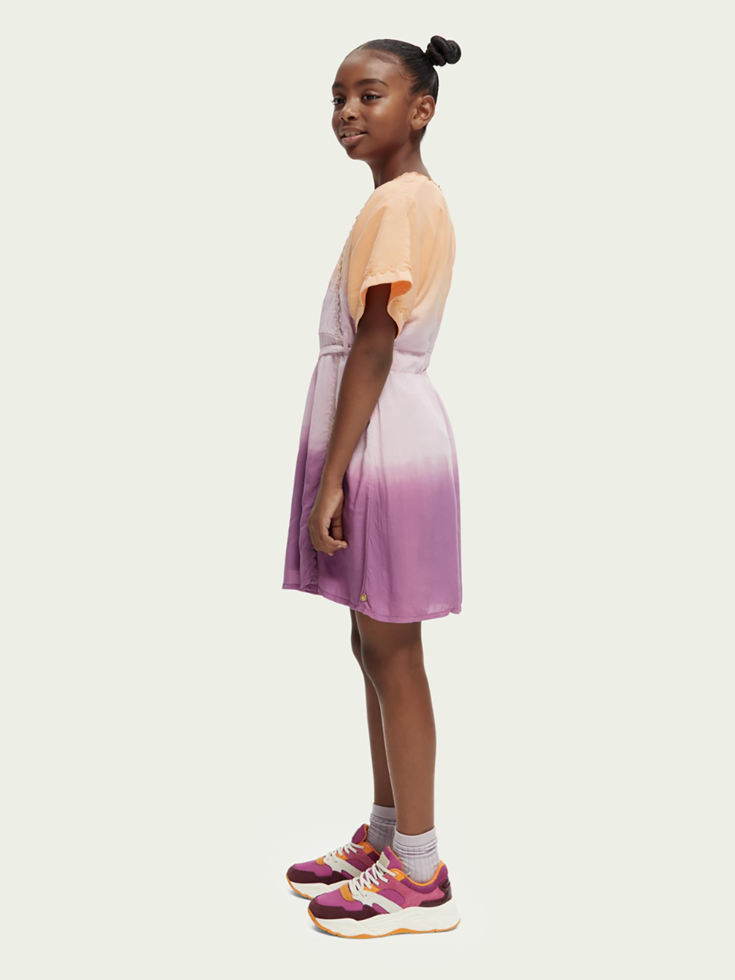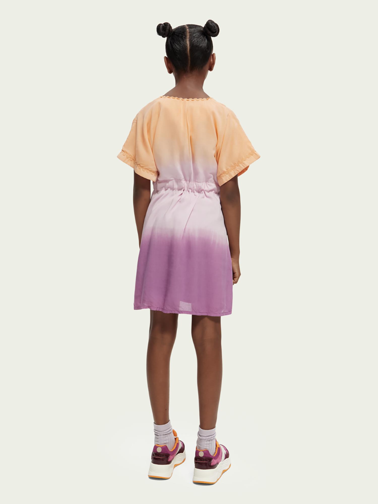 •LOOK: New from Scotch and Soda is a pretty cotton dress ideal for a summer social event. V-neckline with a snap closure. The wide short sleeves are right on trend with a modernized tie-dye look. The lightweight fabric is perfect for the warmer months. In a nice designer touch, the scalloped edge of the neckline carries through the bodice, matching the color changes of the dress. A-line shape. Lined. Self tie belt.