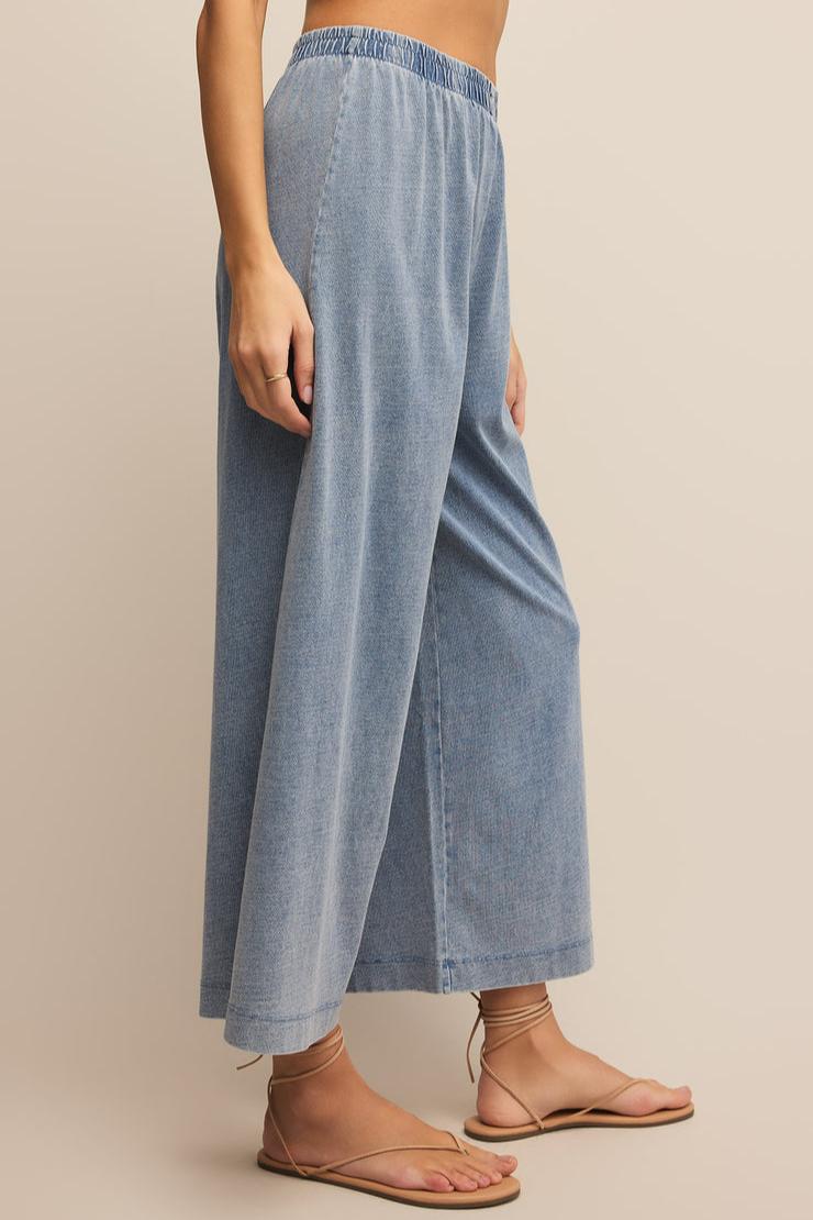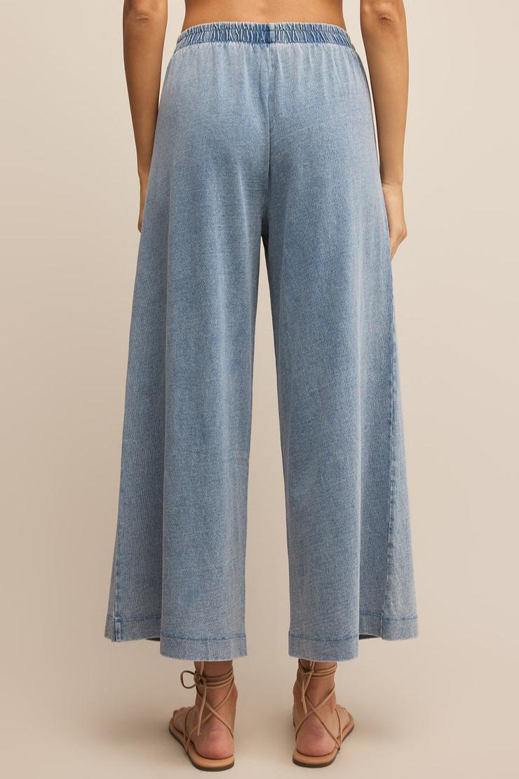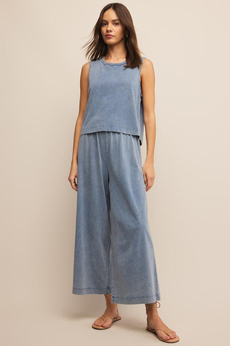 With its vintage look and soft mineral wash, this jersey denim pant is a relaxed denim dream. The elastic waistband and smooth silhouette makes an easy-to-wear style that matches with our Sloane Jersey Denim Muscle Tank.
