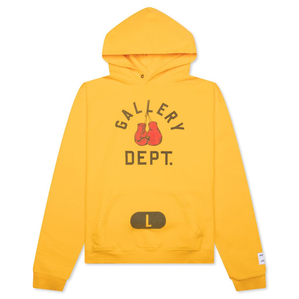 The Boxing Merch Hoodie in Gold Yellow is crafted from cotton, offering a relaxed fit for ultimate comfort. This hoodie features a striking screen-printed graphic and branding on the front, along with an attached hood and a convenient kangaroo pouch for added functionality. The vintage wash gives it a classic, worn-in look, while the woven label tag adds a touch of detail. 100% Cotton Relaxed fit Screen printed graphic and branding on front Attached hood Kangaroo pouch Vintage wash Oversized fit Woven label tag Style No: BMH-50012-GLYW