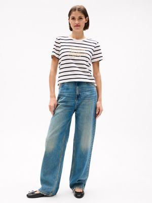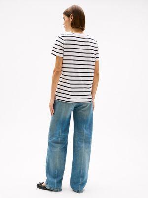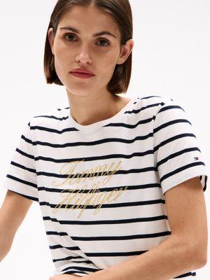 Tommy Hilfiger women's T-shirt. Our all-season, medium-weight tee is cut in a comfortable, flattering fit that holds its shape, thanks to its cotton-jersey construction. Horizontal stripes add a nautical feel, while our script logo makes it unmistakably Hilfiger.