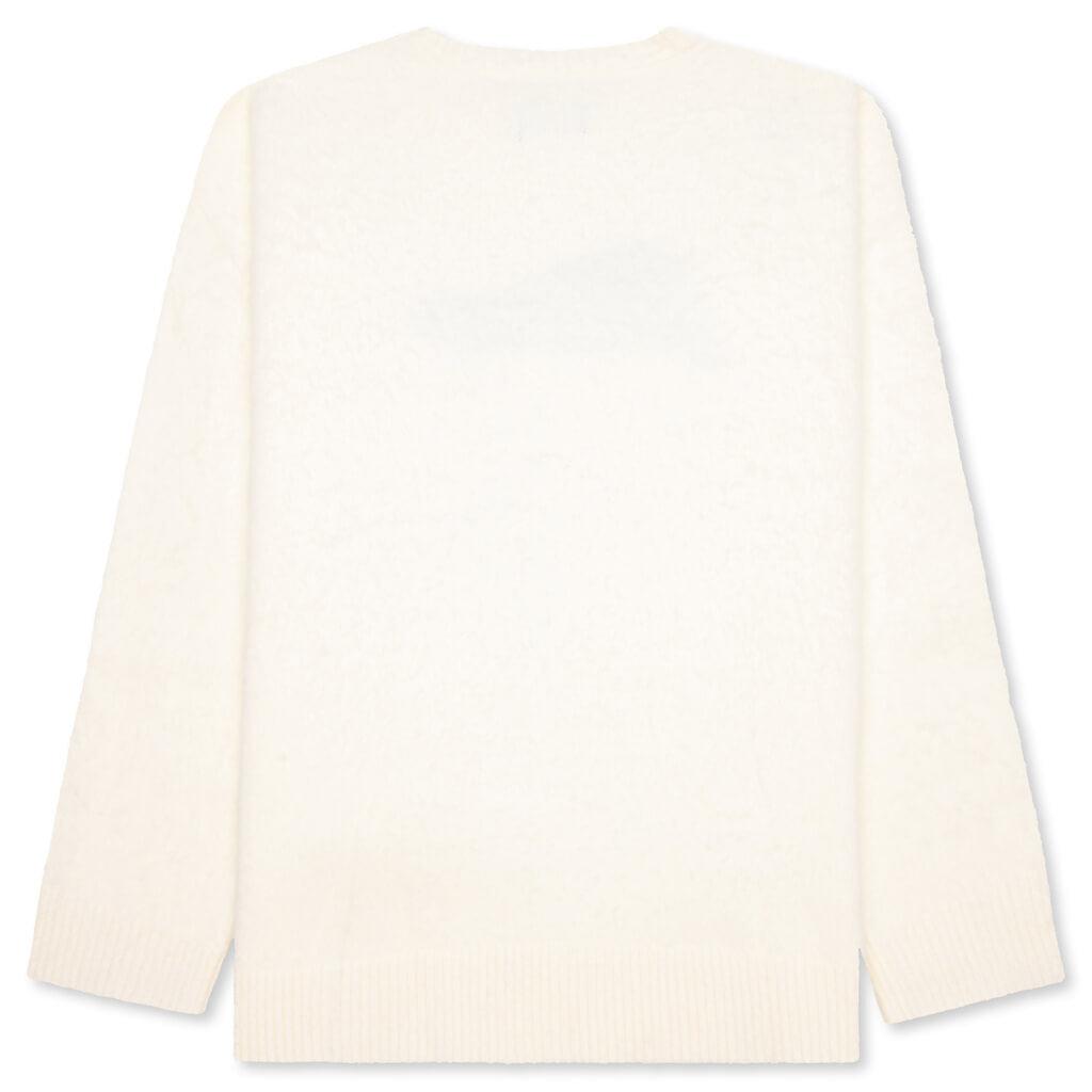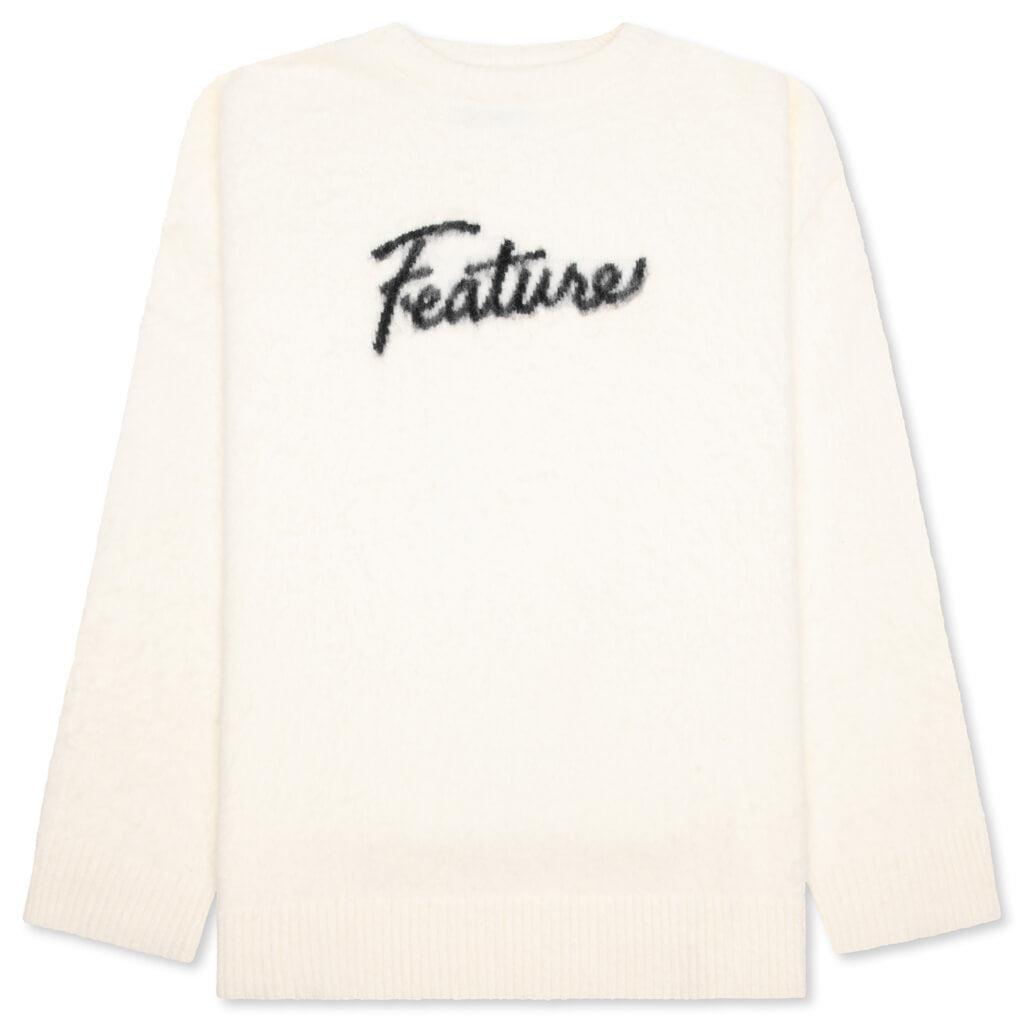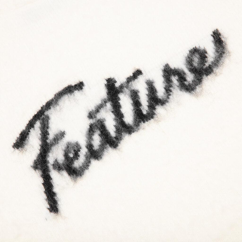 The FEATURE Logo Pullover Sweater has a round neck, with a slightly oversized fit and drop shoulders. Made with medium gauge synthetic yarns, resulting in an animal friendly, faux mohair, with a soft hand. Sweaters are fully fashioned in construction. Crewneck Large fit Original graphic Style No: F110323X02CR