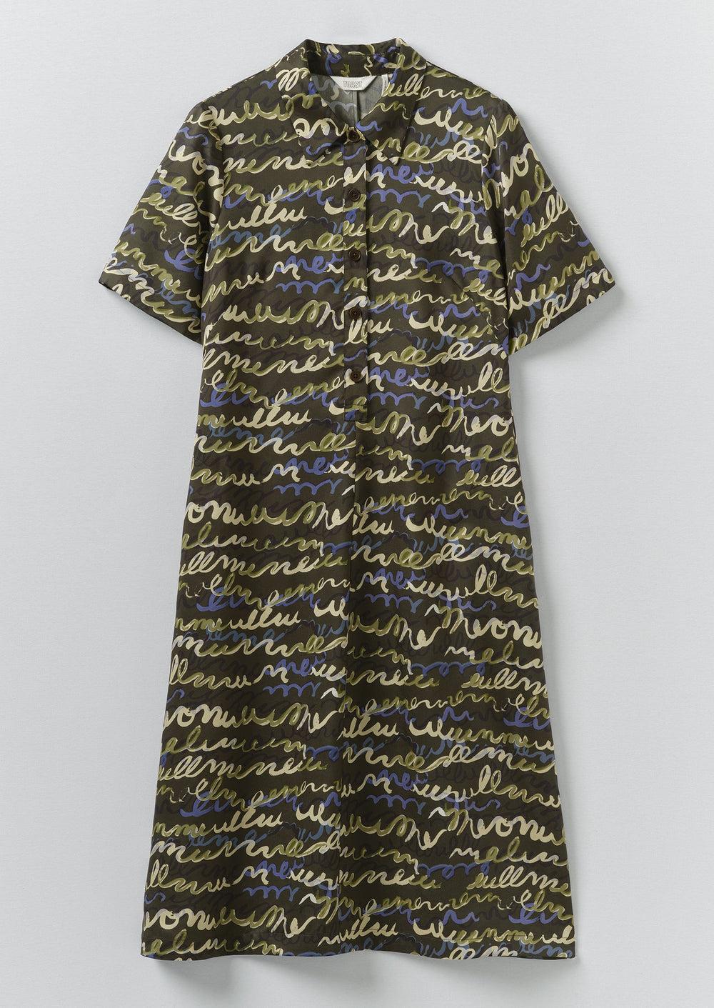 Our fluid shirt dress is illustrated by a lyrical script print. Cut with a sharp point collar and finished with a half placket accented by corozo buttons. Made from responsibly sourced lyocell, a cellulose fibre, which is woven into twill.