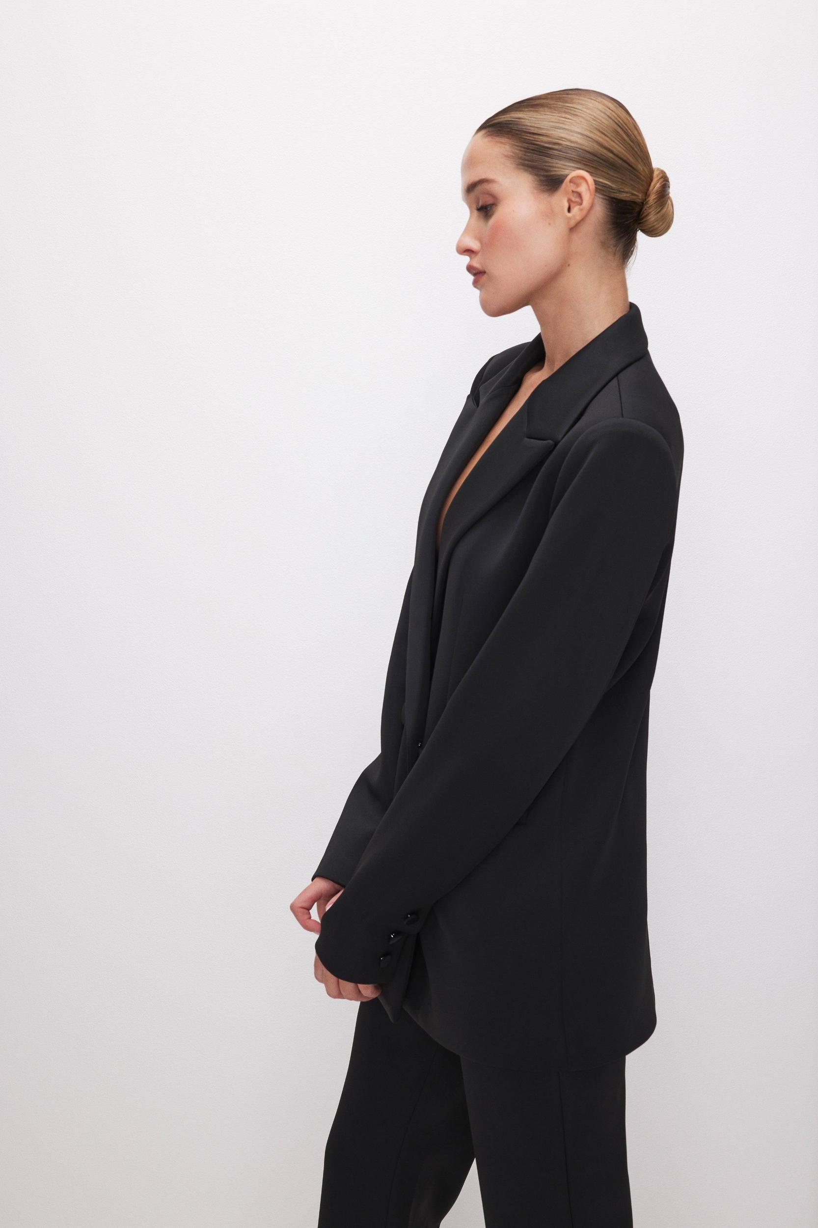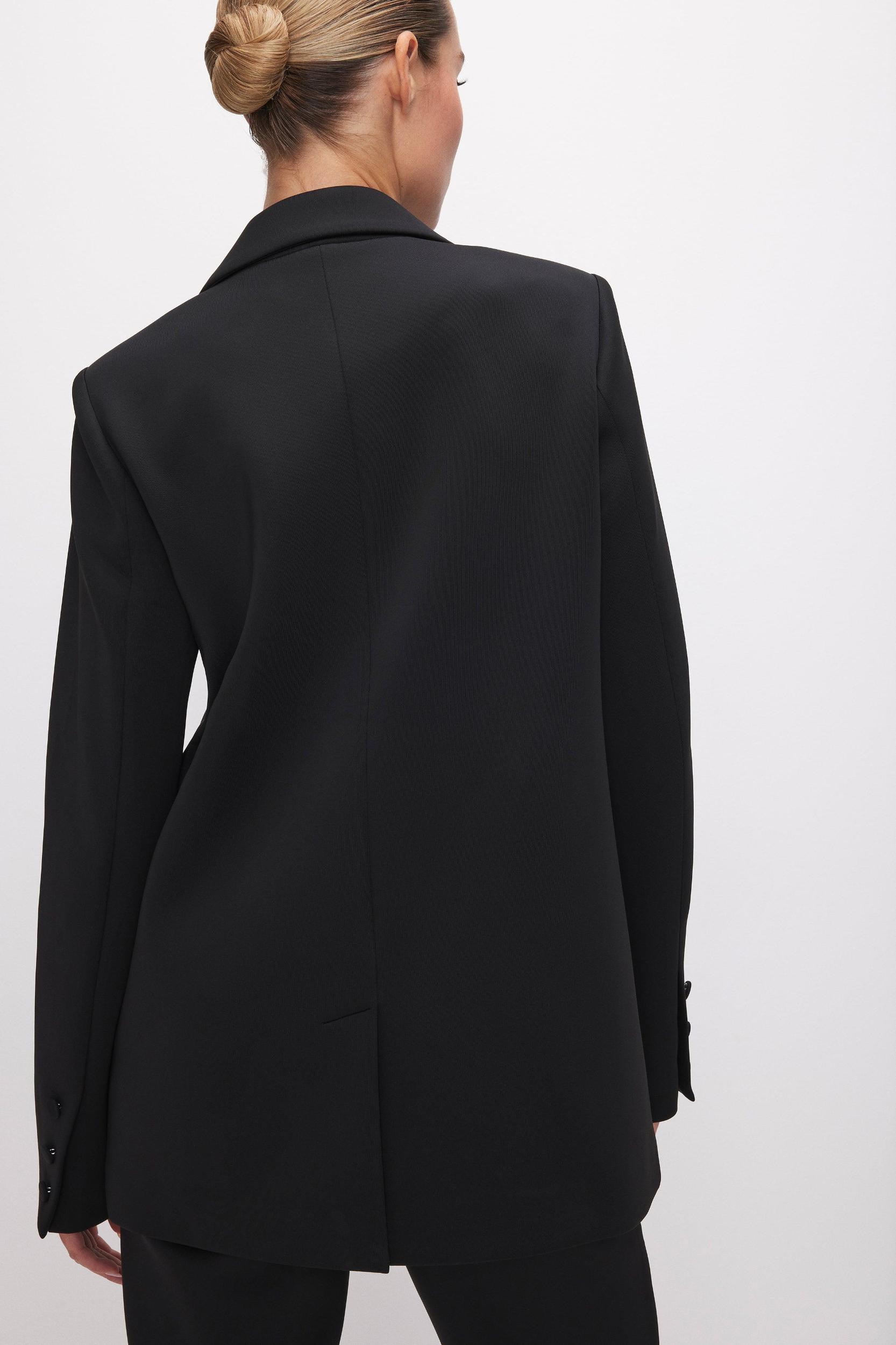 Give your everyday look an edge with the the Scuba Blazer 2.0 The fit always strikes the right balance between modern and timeless. It is made from a compact double-knit stretch fabric that holds you in and smooths you out. Pair with our trousers to complete the look. Notched collar Long sleeves Front double-breasted button closure Oversized fit Fabric: 95% Polyester, 5% Elastane Care: Hand Wash, Line Dry Model size 0 is 5'9 and wearing size XS