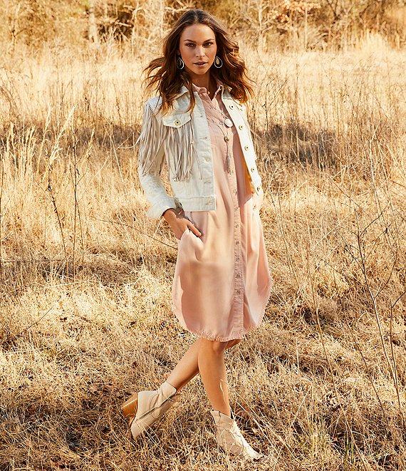 From Scully, this jacket features: Denim fabrication Long sleeves Faux chest pockets Side front pockets Fringe and embroidery detail Button front closure Cotton/polyester/spandex Machine wash Imported.