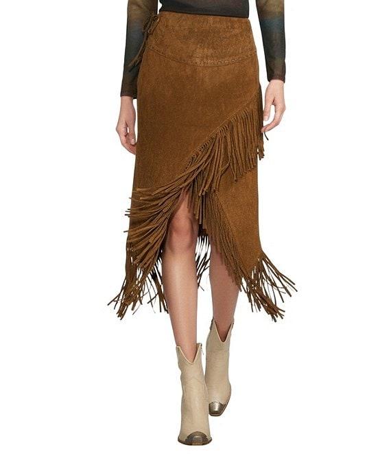 From Scully, this skirt features: Suede leather fabrication Sheath wrap silhouette Buck stitching detail High rise waistline Front slit opening on hem Suede fringe hemline Fully lined Midi skirt length Side zipper with tie side closure Approx. 25" in front length Self: leather, lining: nylon Professional leather method dry cleaning only Imported.
