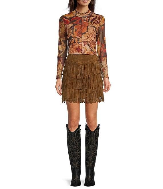From Scully, this skirt features: Suede fabrication Tiered fringe detail Lined Back zipper closure Pull-on construction Approx. 17" length Genuine Leather/ Lining; Nylon Cleaned by leather specialist Imported.