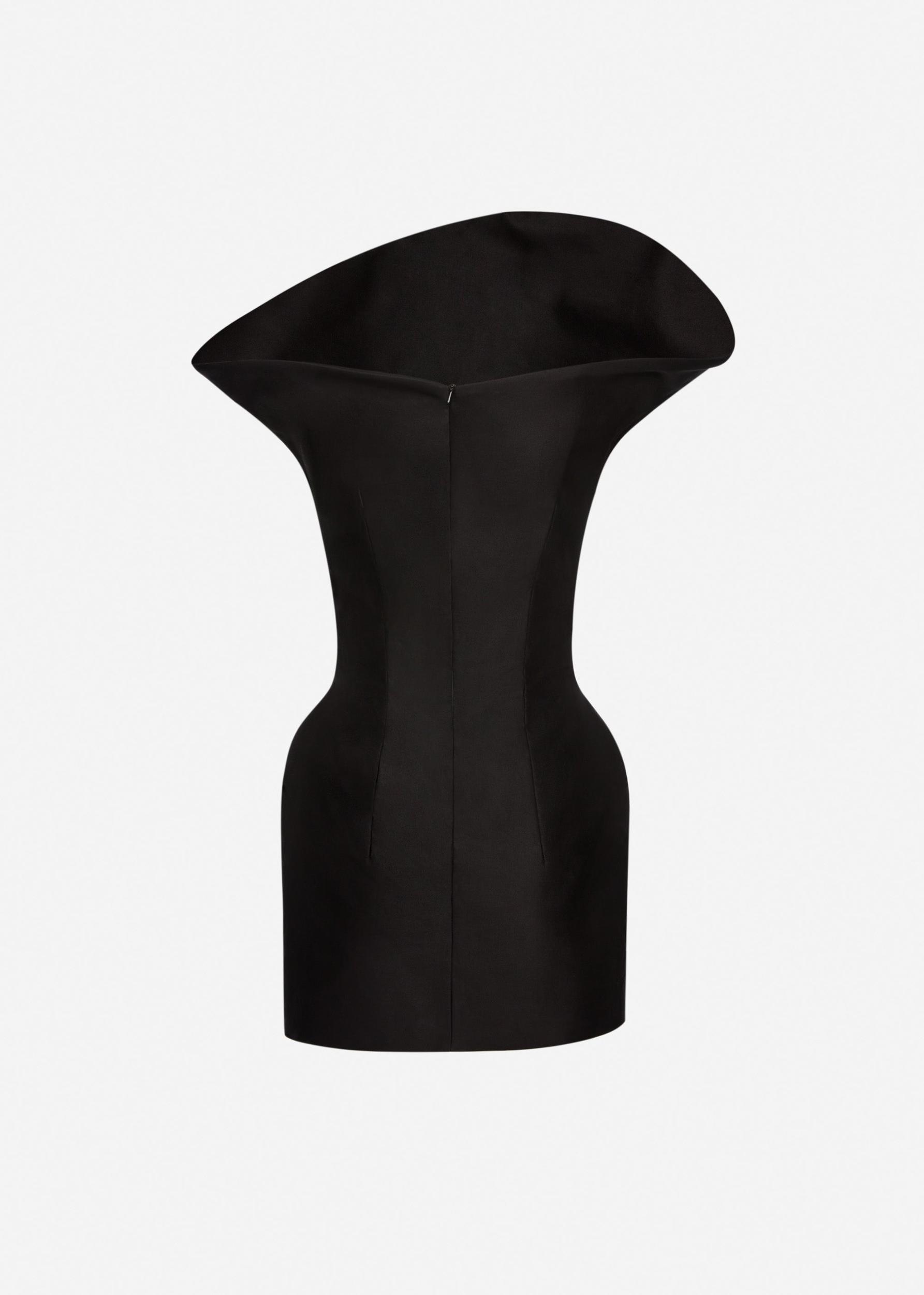 A simple cotton mini dress with an exaggerated hip shape and a sculptural 3D shape at the chest that serves as a redefinition of the rose.