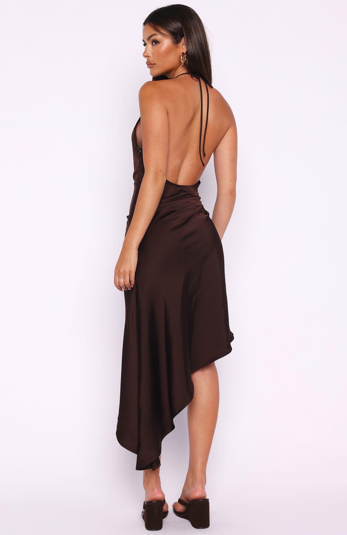 The Sealed With Love Midi Dress Espresso is your invitation to stand out. Featuring a high cut neckline with a halter neck design and back self tie straps, midi length with an asymmetrical hemline and backless design. Style this vacation essential with thong heels and layered gold accessories for a stand out look!
