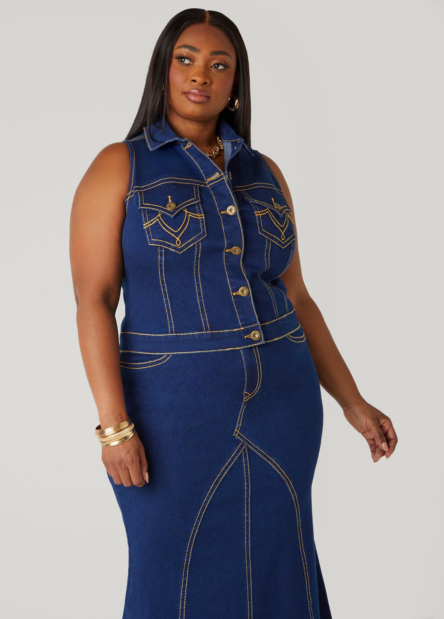 This stretch-denim vest is all about attitude. Cropped and curve-hugging with seam detailing that knows how to contour, it features flap pockets at the bust and a full button front for throwback vibes. Rock it solo or wear it with the matching skirt for a two-piece look that does the most.