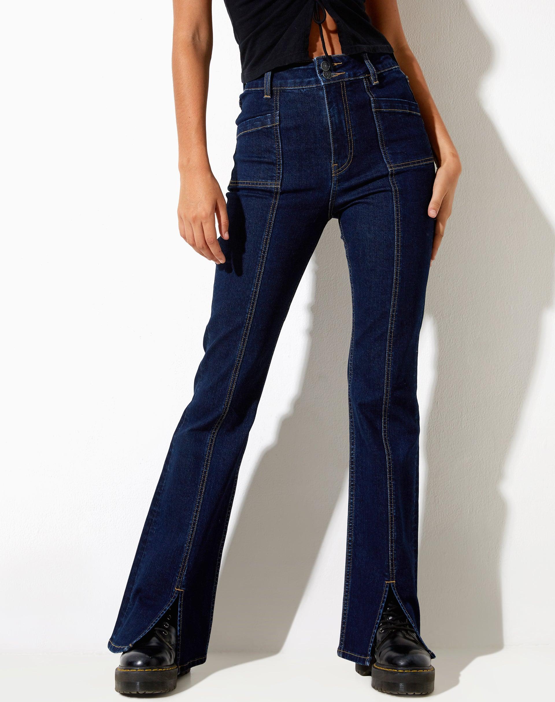 Its time to update your denim with these must have jeans! Featuring a high waisted fit, seam detailing with split hem and button fastening in an indigo blue denim. Pair with a basic white tee and docs for a simple but stylish look! NOW AVAILABLE IN TWO LEG LENGTHS. MODEL WEARS:S - MODEL HEIGHT:5'7 - FABRIC CONTENT: 75% COTTON 23% POLYESTER 2%SPANDEX