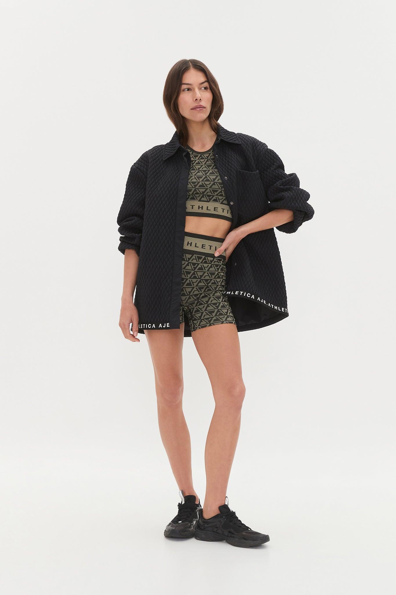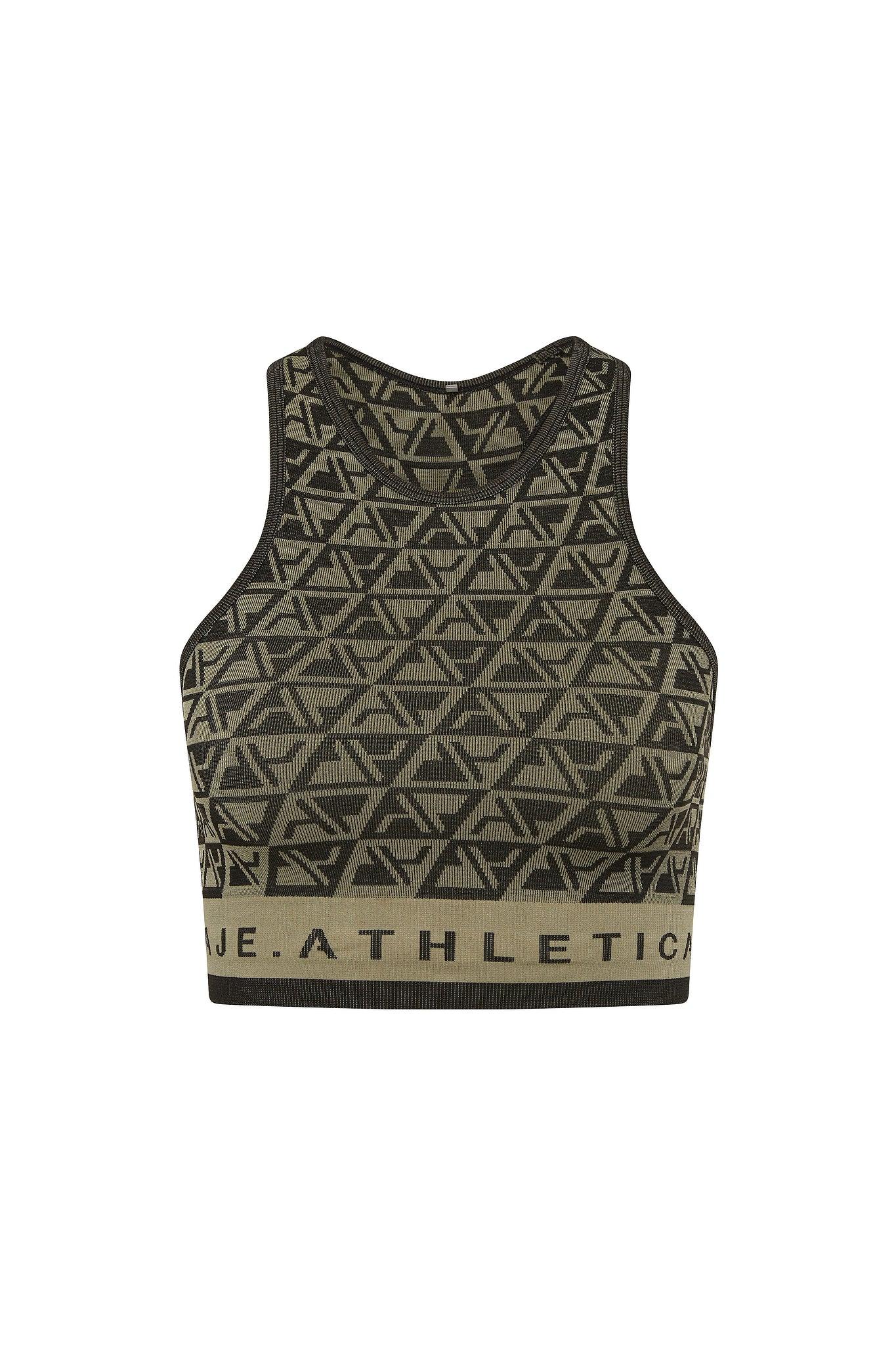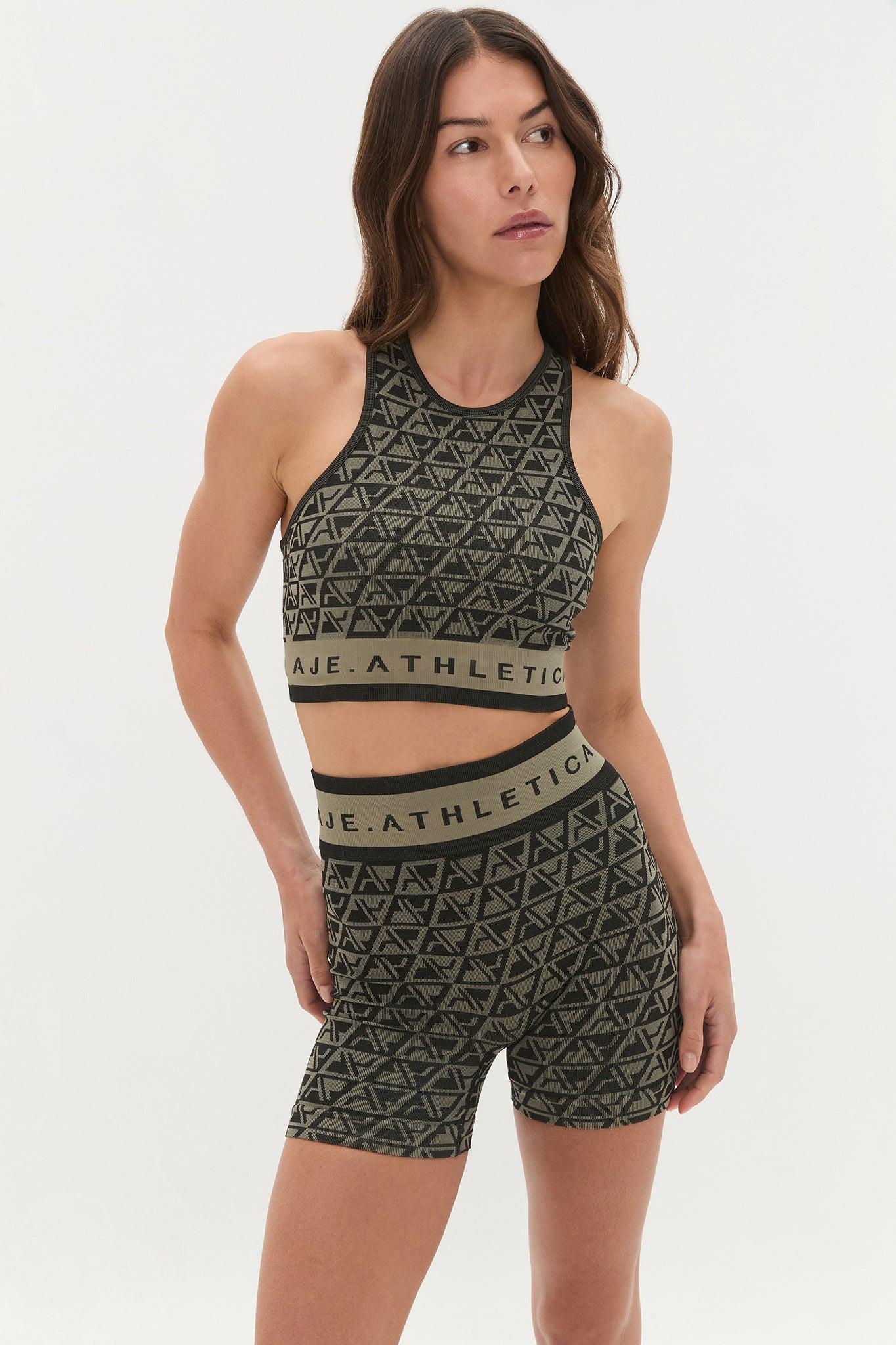 PRODUCT DETAILS Aje Athletica Women's crop top High neck Racerback Seamless construction Tubular waist Logo detail throughout 70% Nylon, 24% Polyester, 65% Spandex Shop All Tops SIZE AND FIT Helena wears size 8/S and is 173cm/5'8