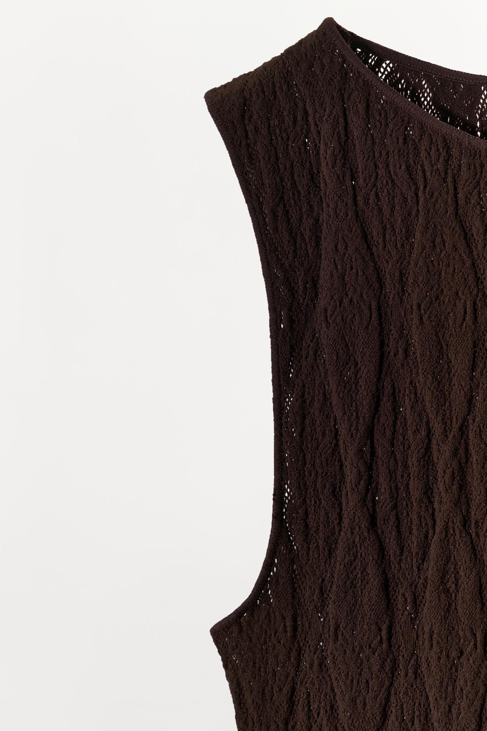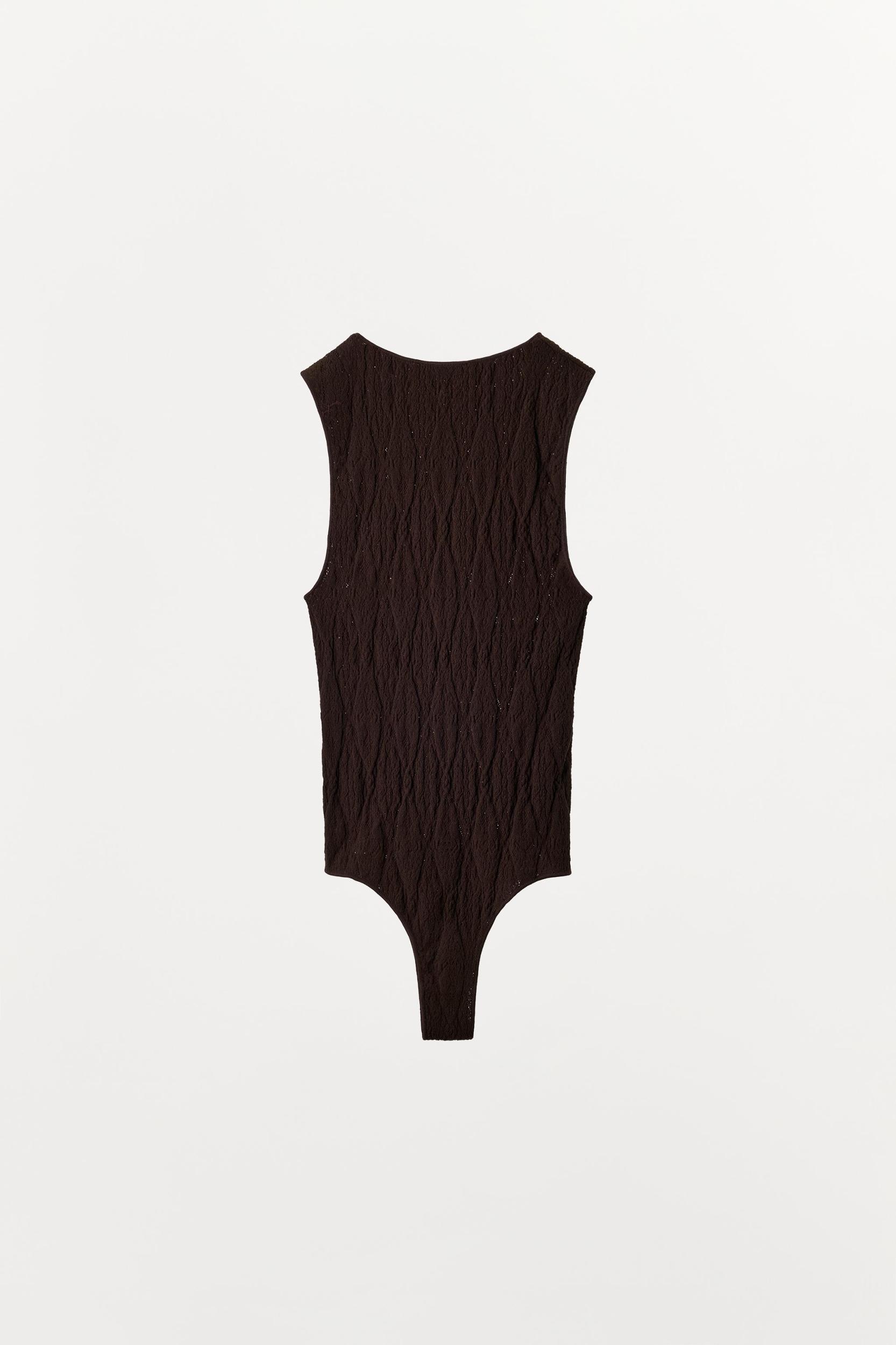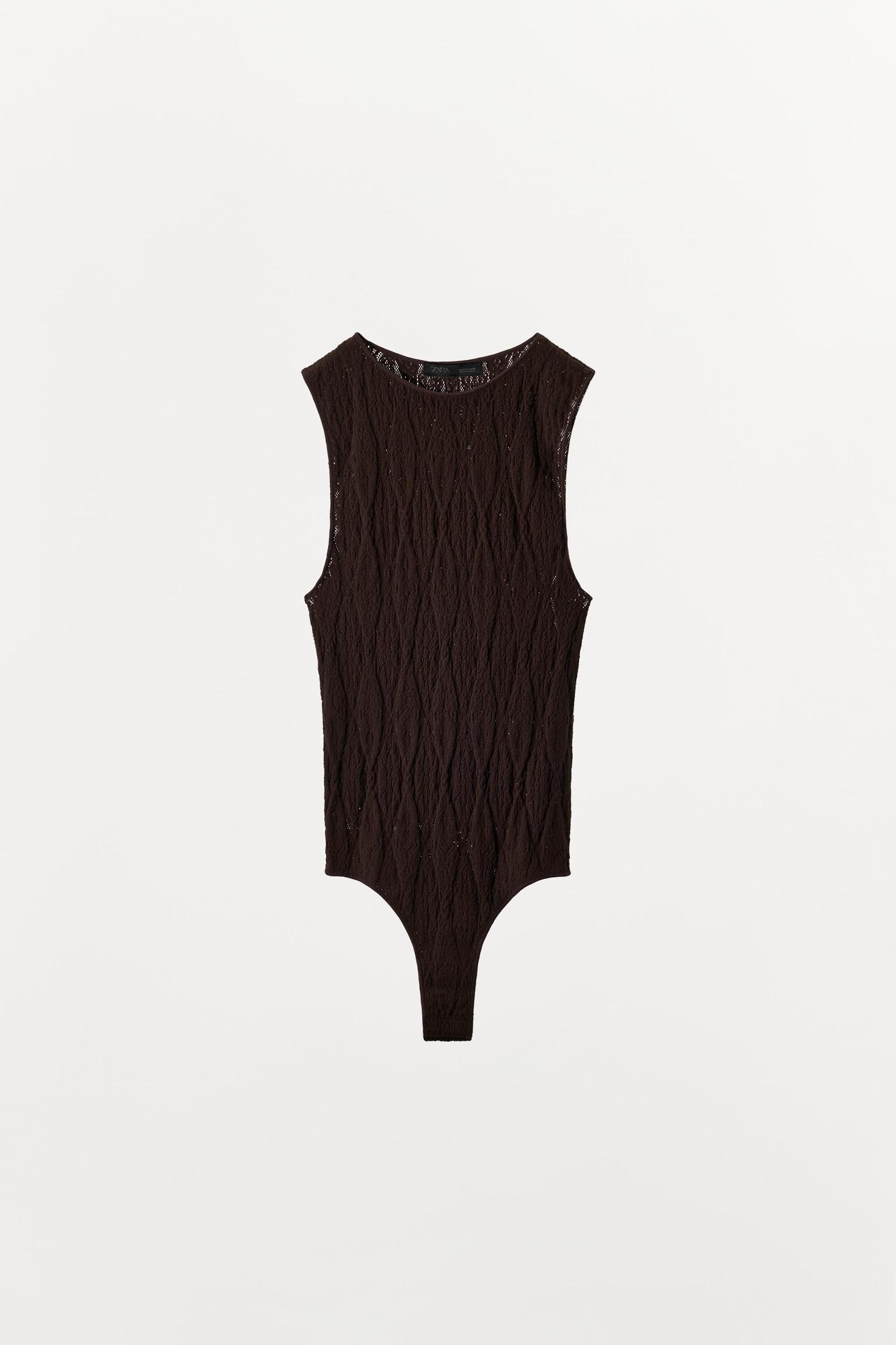 Semi-sheer bodysuit made of polyamide blend fabric. Round neckline and sleeveless. Bottom snap button closure.
