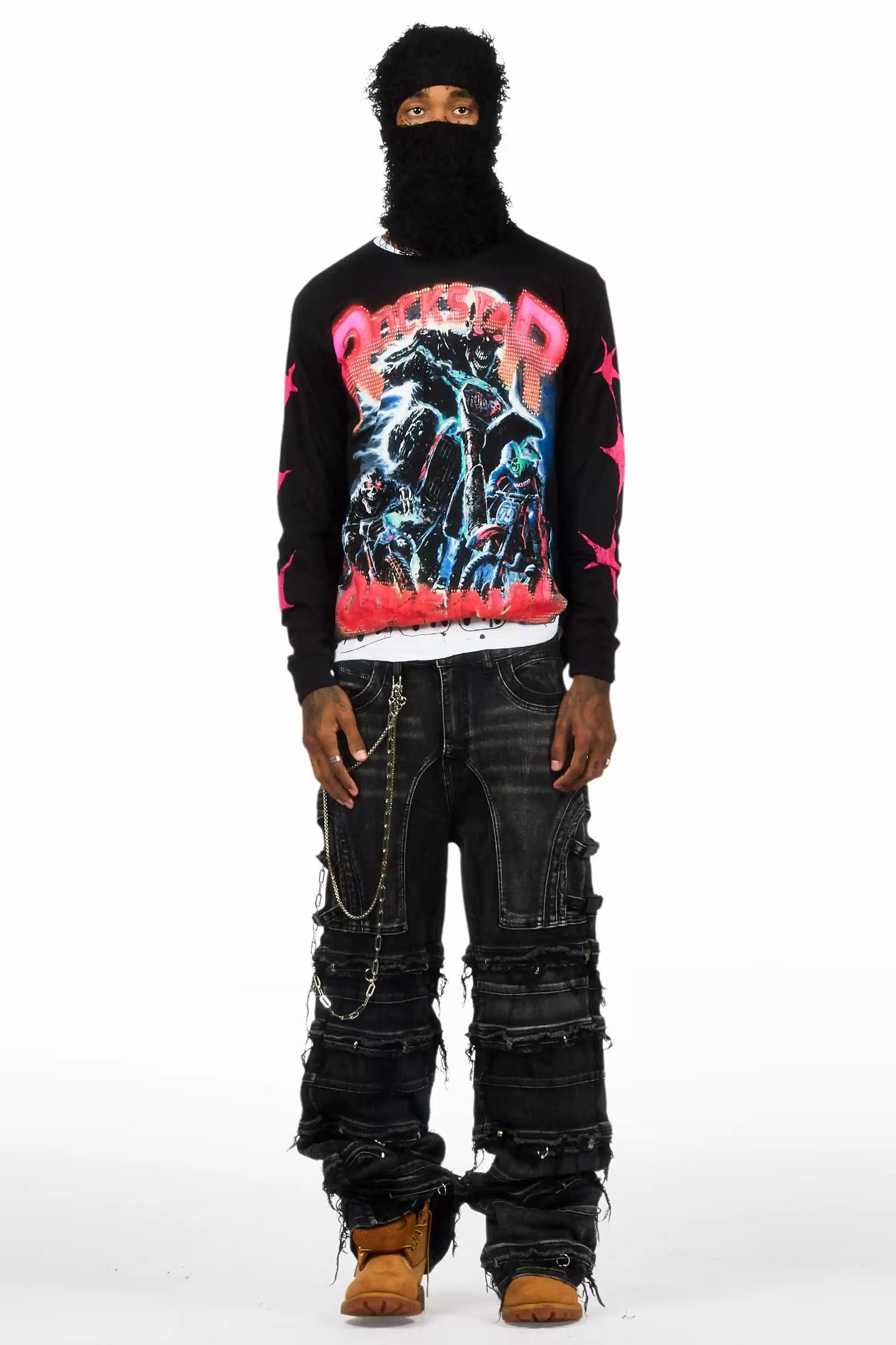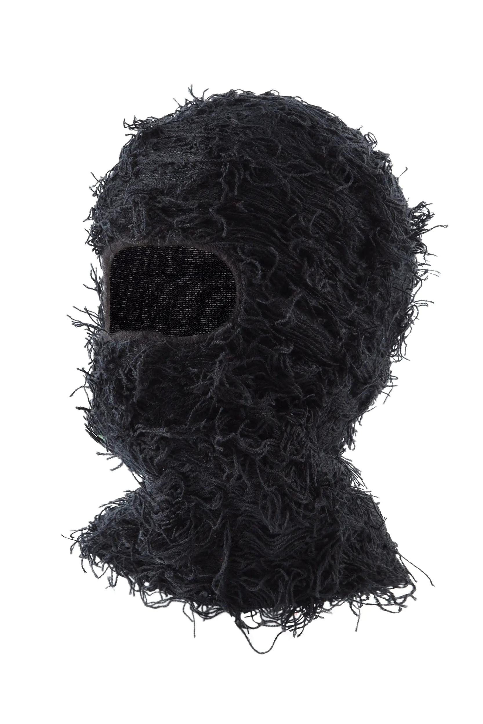 An elevated balaclava ski mask for men in black. Designed with ultra soft fuzzy fabric for optimal comfort and streetwear aesthetic. Knit fabric construction Frayed fuzzy fabric 1-hole beanie construction Elasticized eye opening