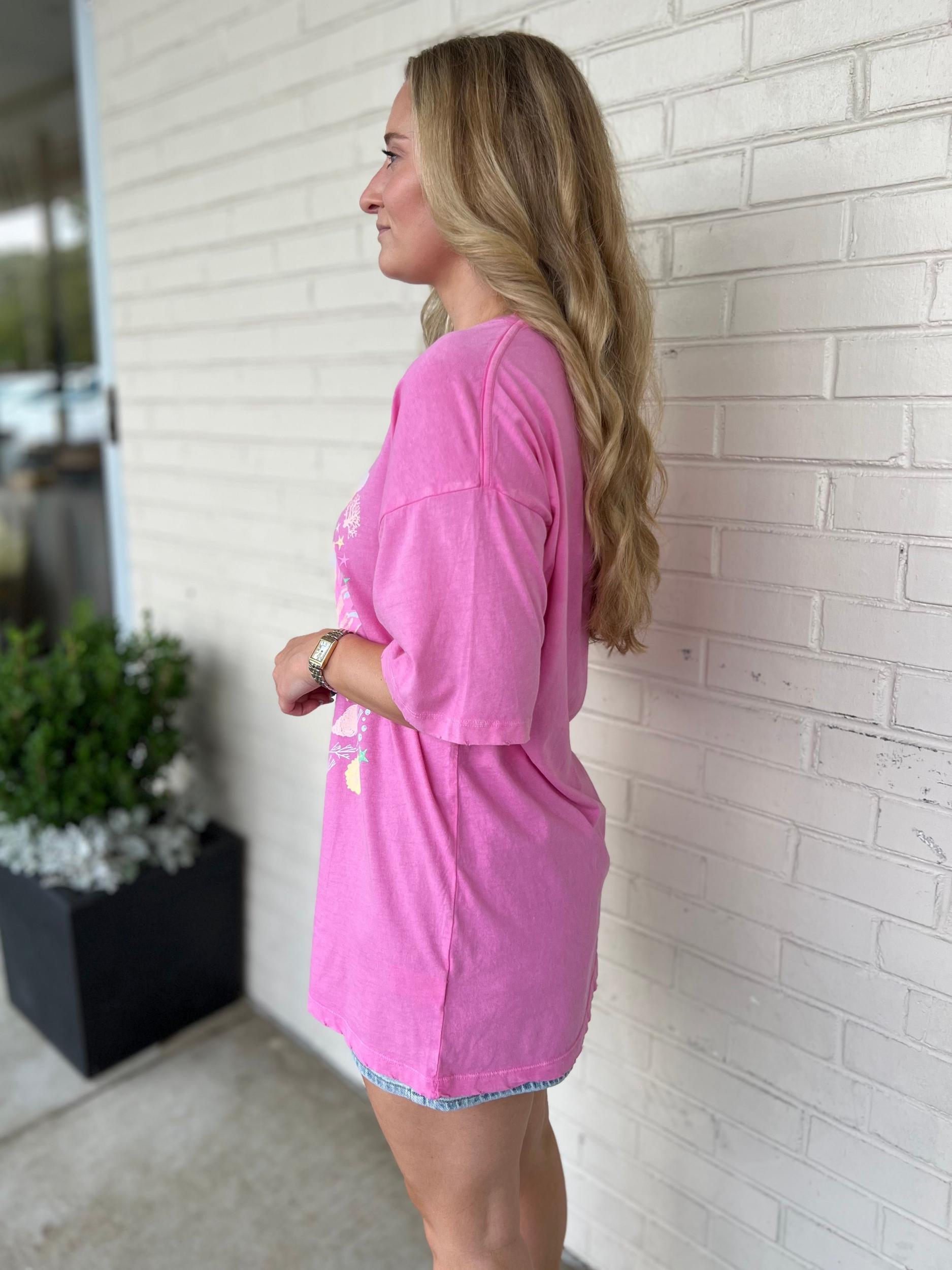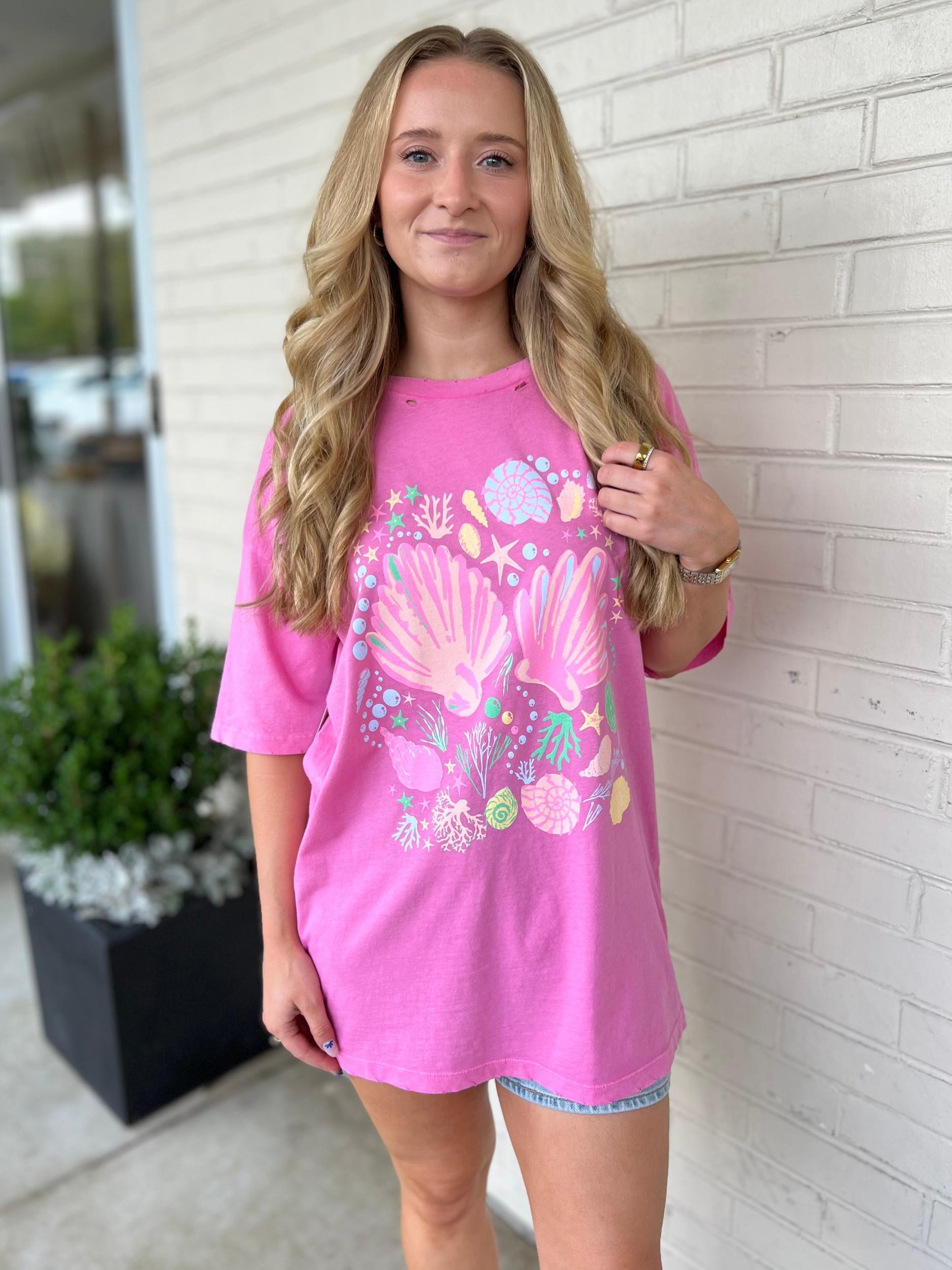 Add a touch of beachy charm to your closet with the Seashell Graphic Tee. This bubble gum pink, mineral-washed shirt showcases an array of seashells on the front. With its relaxed oversized fit, dropped shoulders, and short sleeves, it promises easygoing comfort. Playful torn and distressed accents at the neckline, cuffs, and hem give it a fun, lived-in look that’s ideal for casual days full of character.